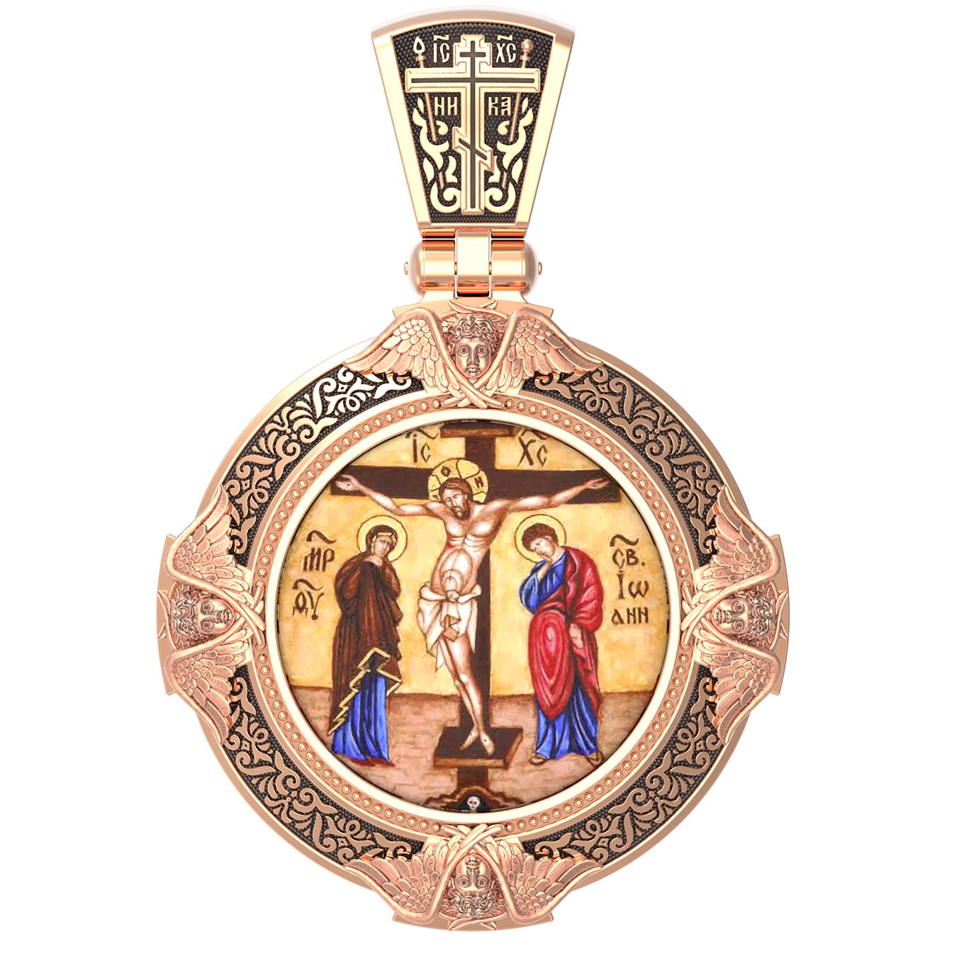 На лицевой стороне образка изображено Распятие Господа и Спасителя нашего Иисуса Христа. Своими крестными страданиями Господь смыл наши грехи, покрыл наш долг перед Богом или, на языке Писания, нас «искупил». В Голгофе сокрыта непостижимая тайна бесконечной правды и любви Бога. Крест стал символом победы добра над злом, жизни над смертью, напоминанием бесконечной Божьей любви, предметом радости. Воплотившийся Сын Божий Своею кровью освятил крест и сделал его проводником Своей благодати, источником освящения верующих. На верхней табличке, выше головы Иисуса, расположена надпись, составленная Понтием Пилатом — «IНЦI». Она означает «Иисус Назорей, Царь Иудейский». Ниже перекладины написано сокращенно имя Спасителя «IC» «XC» — Иисус Христос. Крест стоит на горе камней, символизирующих Голгофу. Под подножием Креста изображена покоящаяся голова (череп) Адама. Слева от Распятия стоят оплакивающие Господа Пресвятая Богородица и святая мироносица Мария Клеопова. Справа — апостол и евангелист Иоанн Богослов, один из ближайших учеников Иисуса Христа и сотник Лонгин с крестом в правой руке и копьем — в левой. По преданию, увидя, что они горько плачут, Иисус сказал Матери Своей: «Жено! Се сын Твой!» Потом сказал ученику Иоанну: «Се мати твоя». С этого времени Иоанн взял Матерь Божию к себе, и Она жила в его доме до самой смерти.