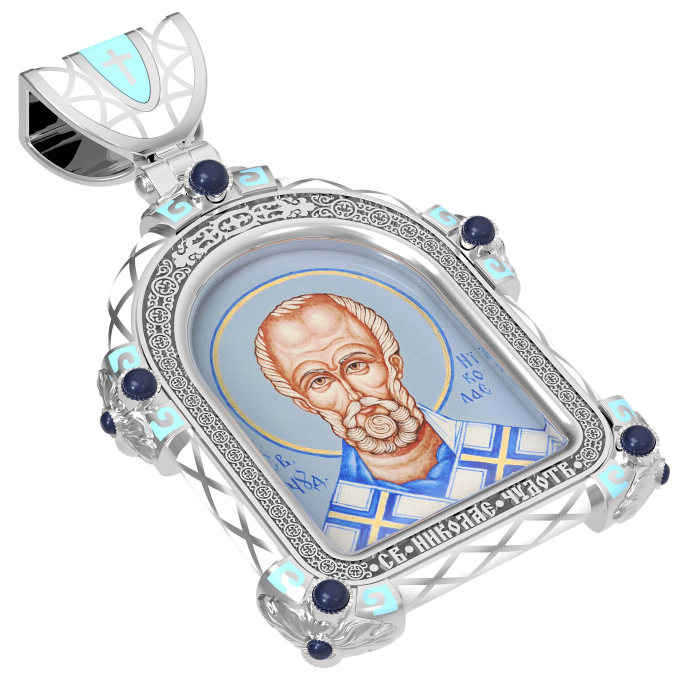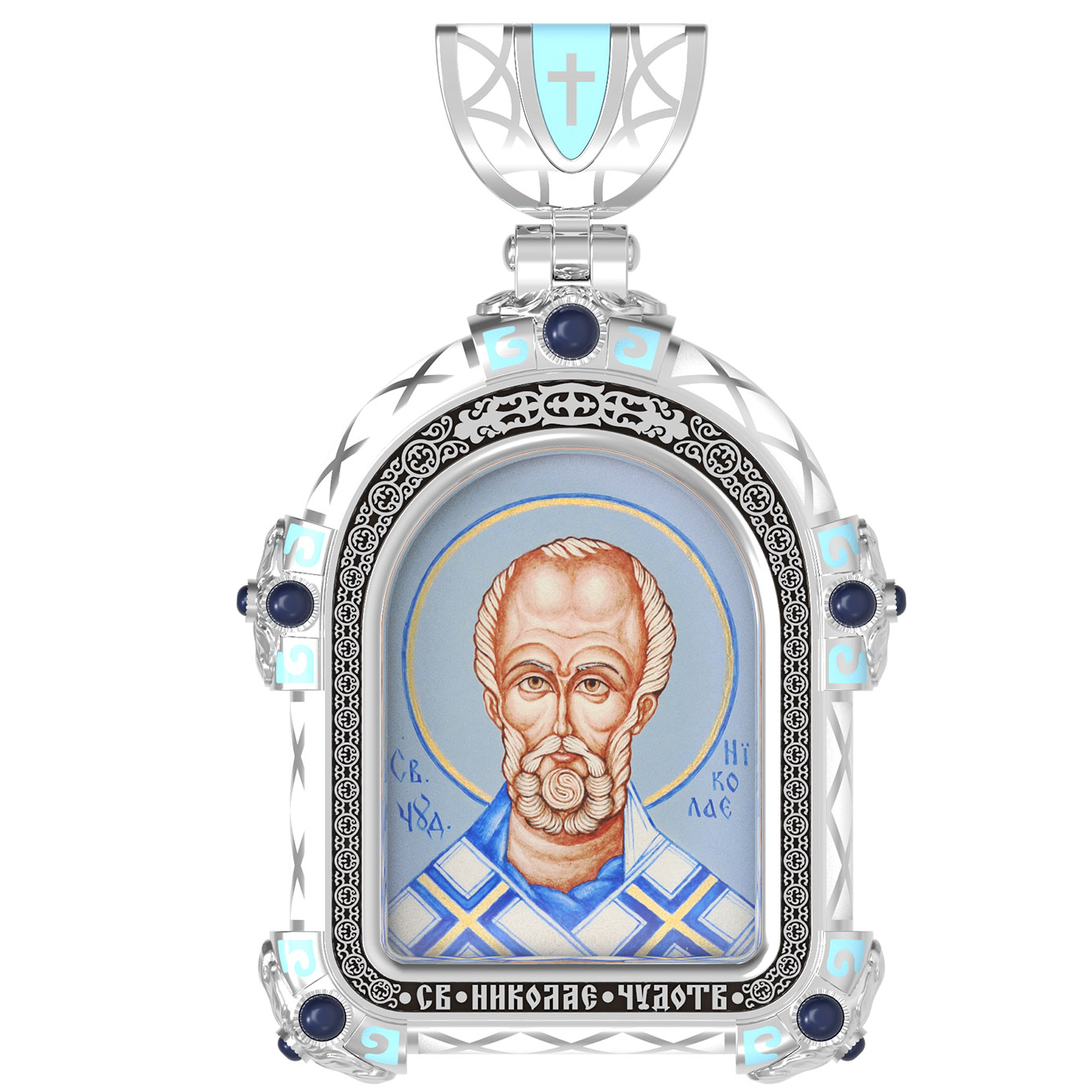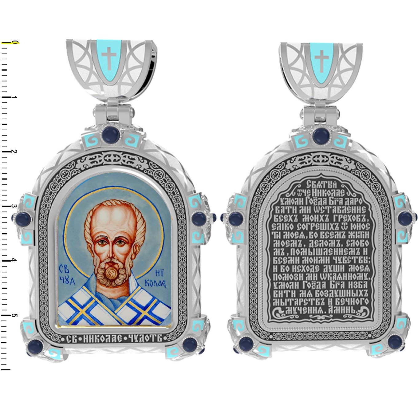 На лицевой стороне образка изображен Святитель Николай архиепископ Мир Ликийских, Чудотворец. Он является одним из самых известных на Руси святых, издревле считающийся помощником и молитвенником за всех, притекающих к нему. Чудес его исчислить невозможно. Николай Чудотворец подавал многим исцеления в болезнях и телесных недугах, обогащал бедствующих в крайней нищете, подавал голодным пищу, спасал от потопления, освобождал из плена и избавлял от смерти.