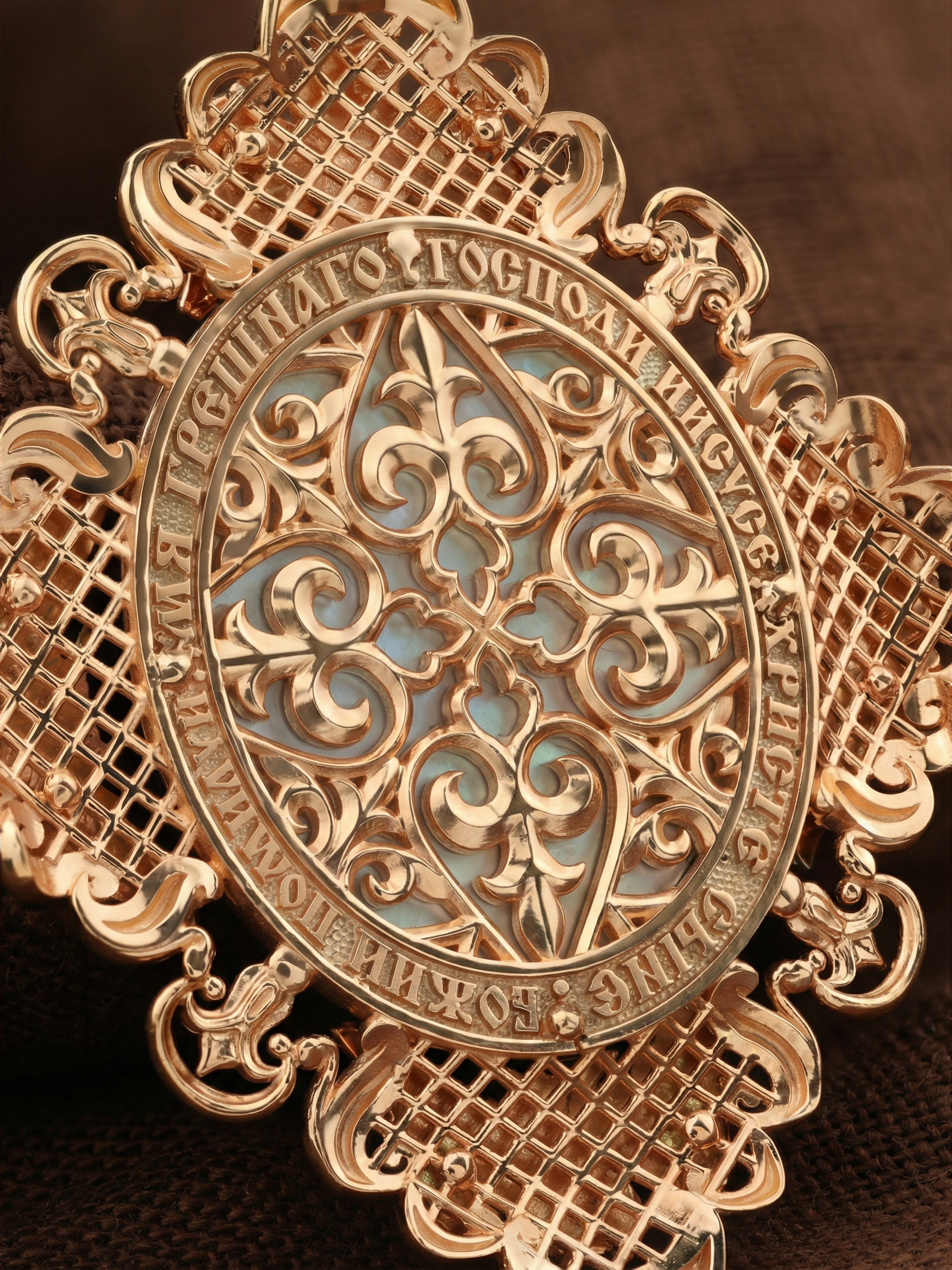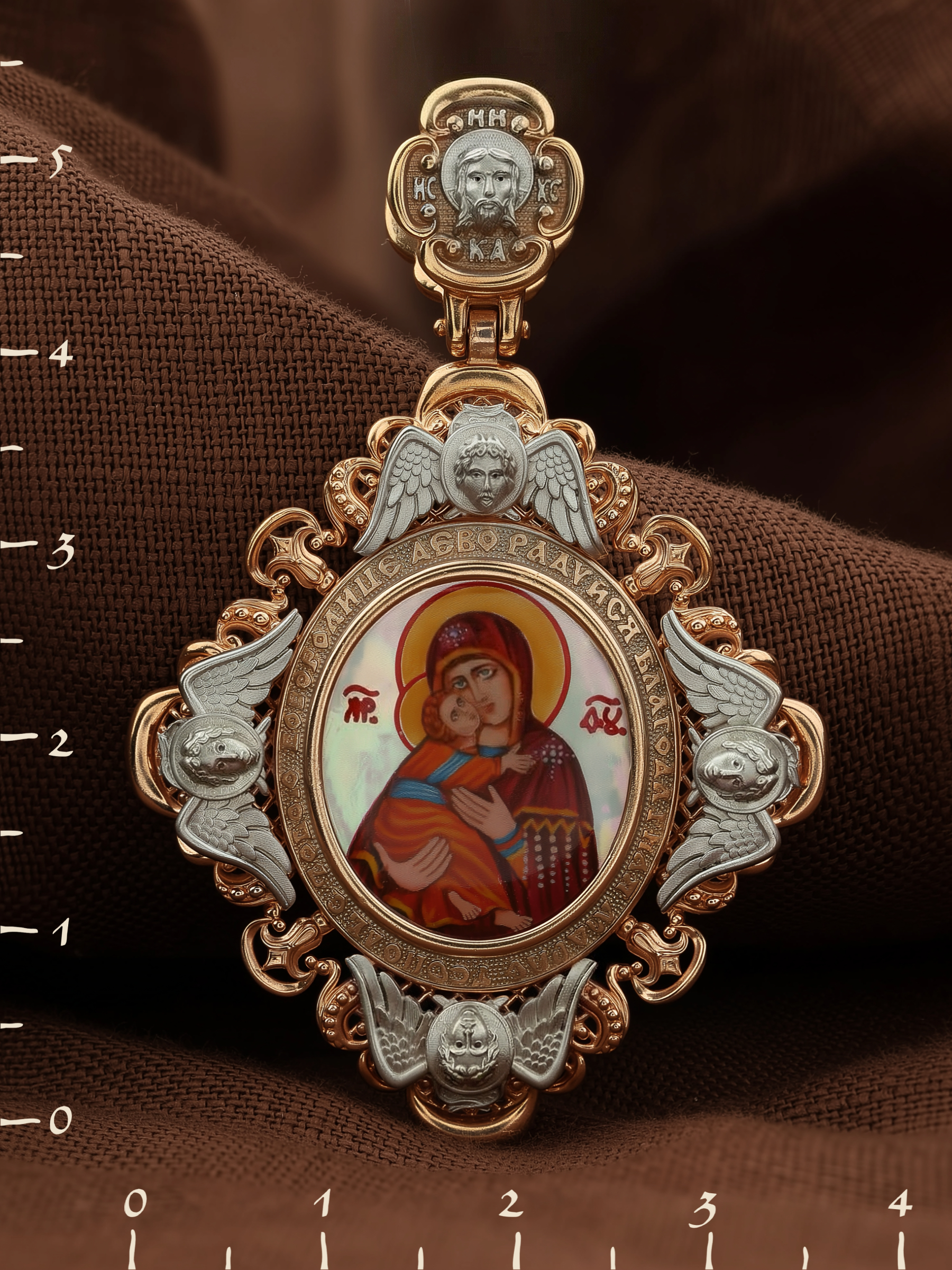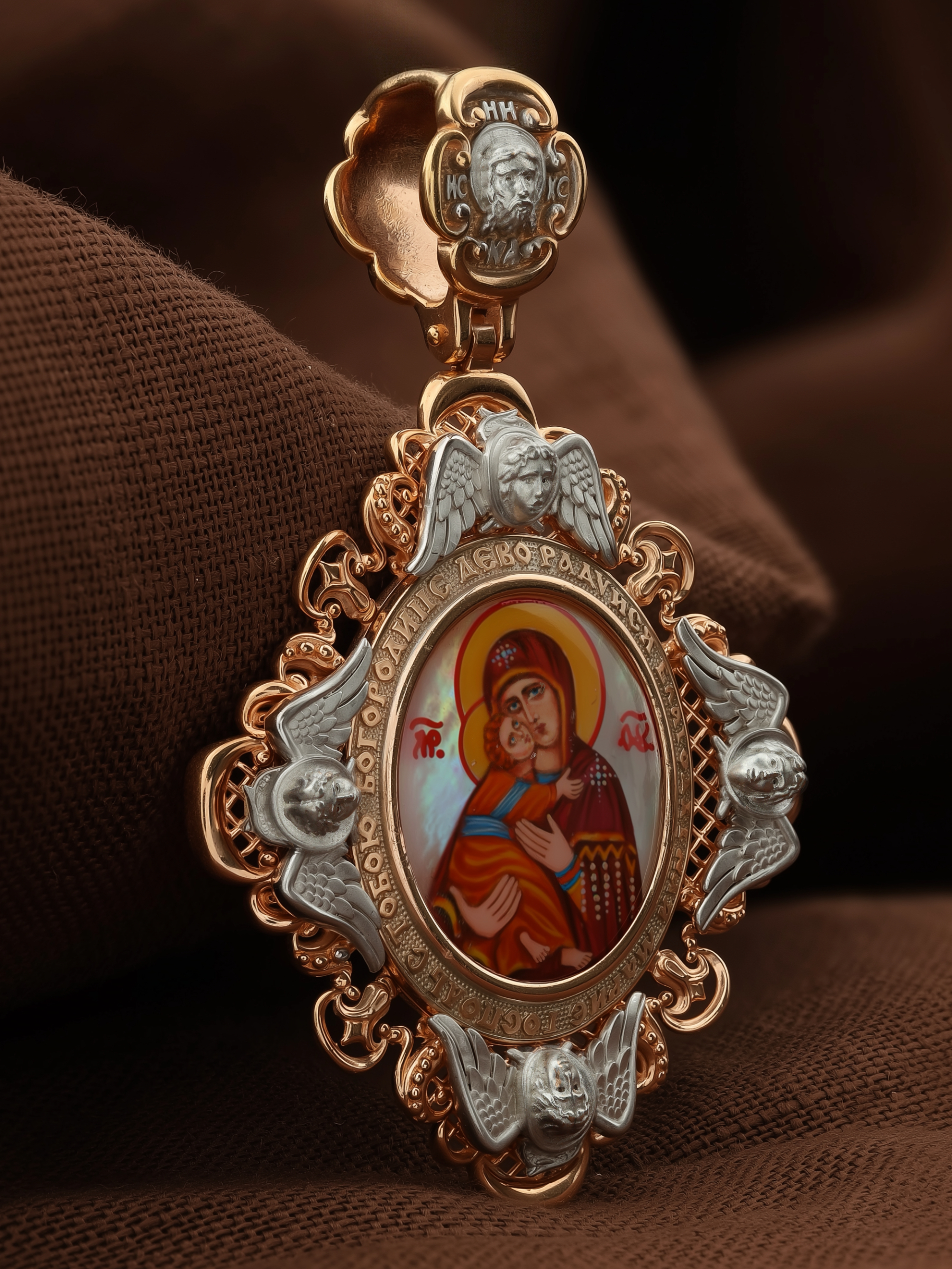 На лицевой стороне образка изображена Владимирская икона Божией Матери — одна из самых чтимых святынь Русской православной церкви. По преданию, икона была написана Святым апостолом и евангелистом Лукой во время земной жизни Богородицы. Дева Мария, увидев Свое изображение, молвила: «Отныне ублажат Мя вси роди. Благодать Рождшегося от Меня и Моя с сим образом да будет». Образ написан в лирическом иконографическом типе «Умиление». Младенец припал щекой к щеке Матери и тянется к ней правой рукой, другой нежно обнимая за шею. Икона вплоть до V века находилась в Иерусалиме, затем была перевезена в Византию. На Русь икона была привезена в 1131 г. За прошедшие столетия святыня неоднократно переезжала из Владимира в Москву и обратно, не раз спасая страну от захватчиков. Русская Православная Церковь установила троекратное празднование Владимирской иконе Божьей Матери. Каждый из дней празднования связан с избавлением русского народа от порабощения иноплеменниками по молитвам ко Пресвятой Богородице. В последующие века у иконы происходили многие важные исторические события: подписание актов, принятие присяги значимых государственных деятелей и возведение на престол. На кулонном кольце изображен Спас Нерукотворный — образ Господа и Спасителя нашего Иисуса Христа, чудесно отпечатавшийся на плате, котором Христос вытер свой лик.