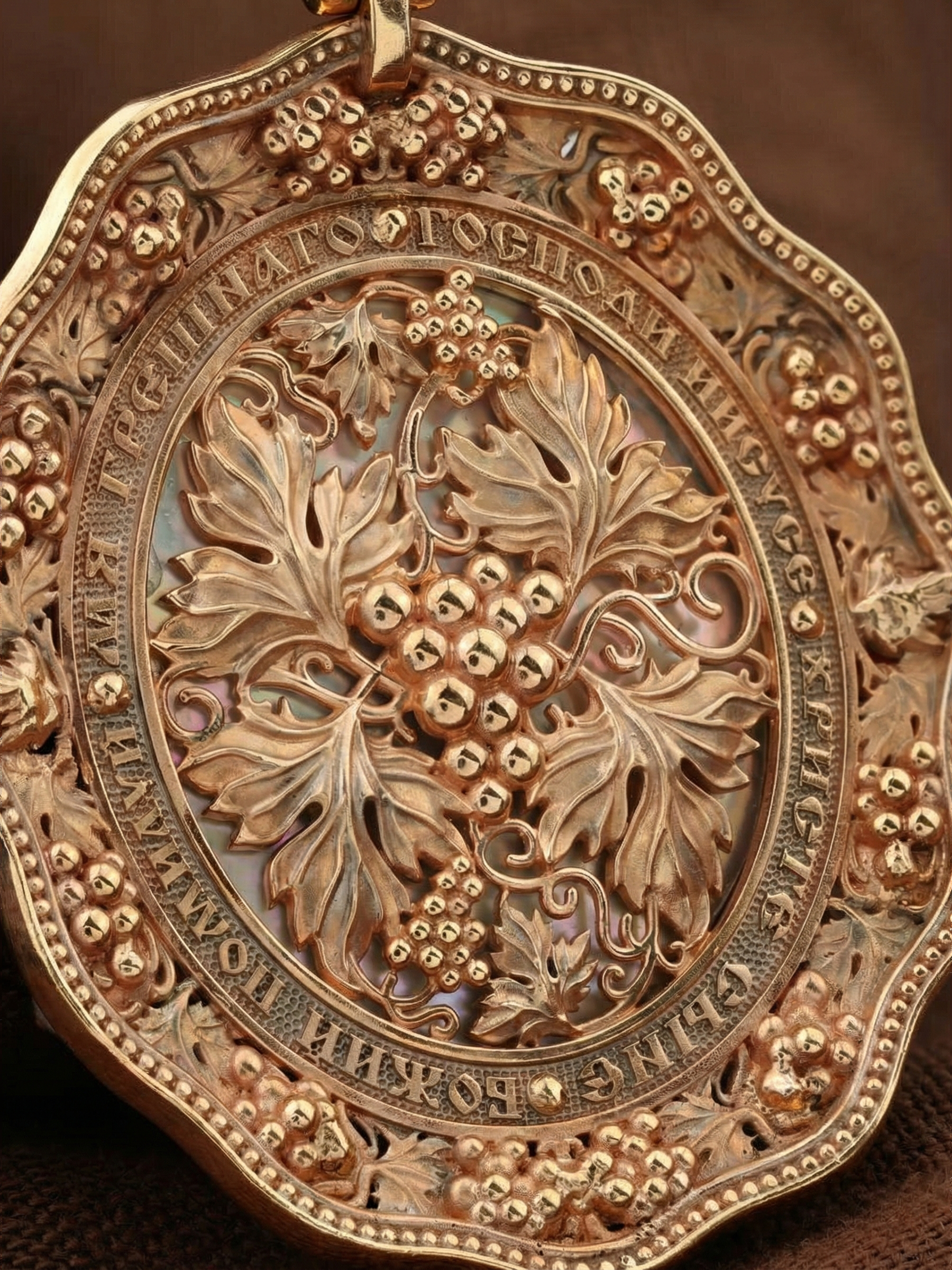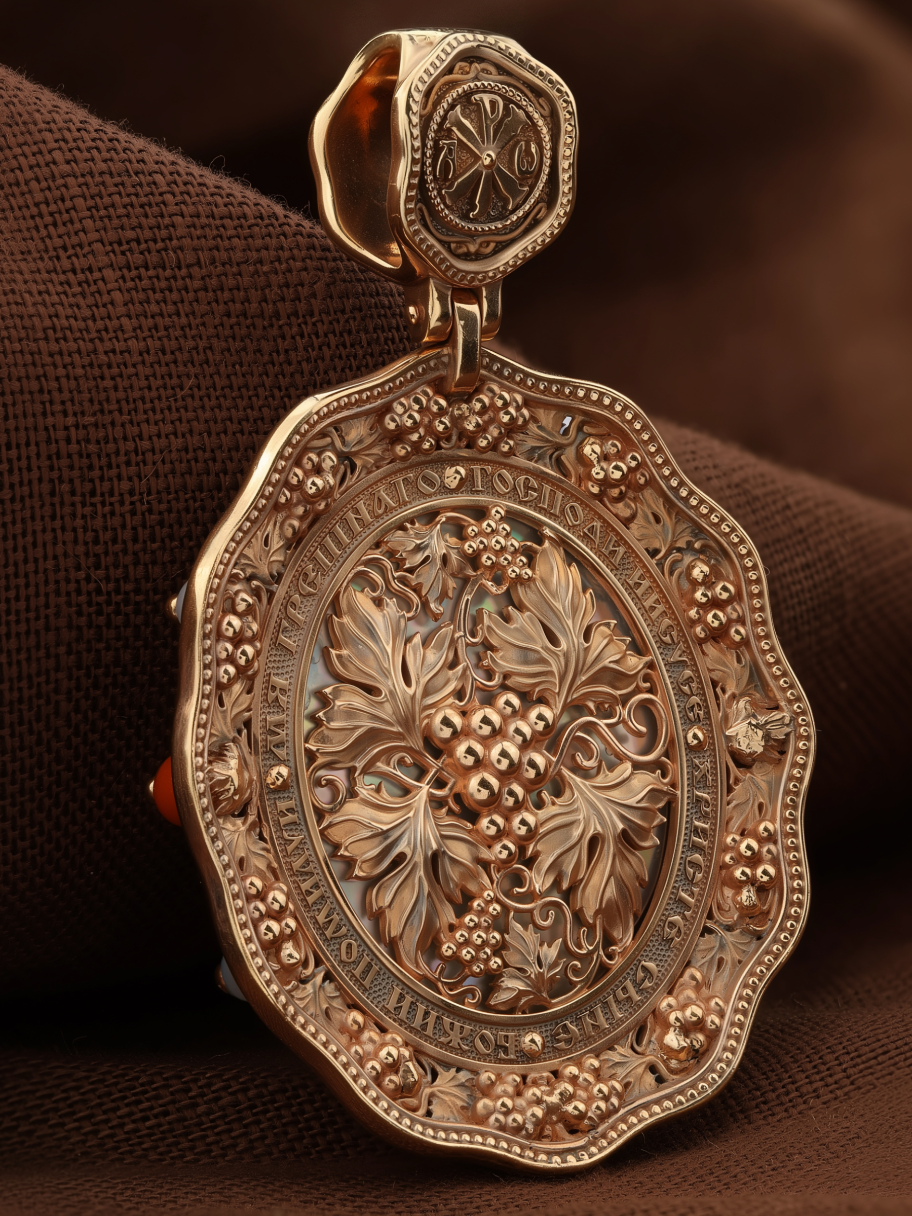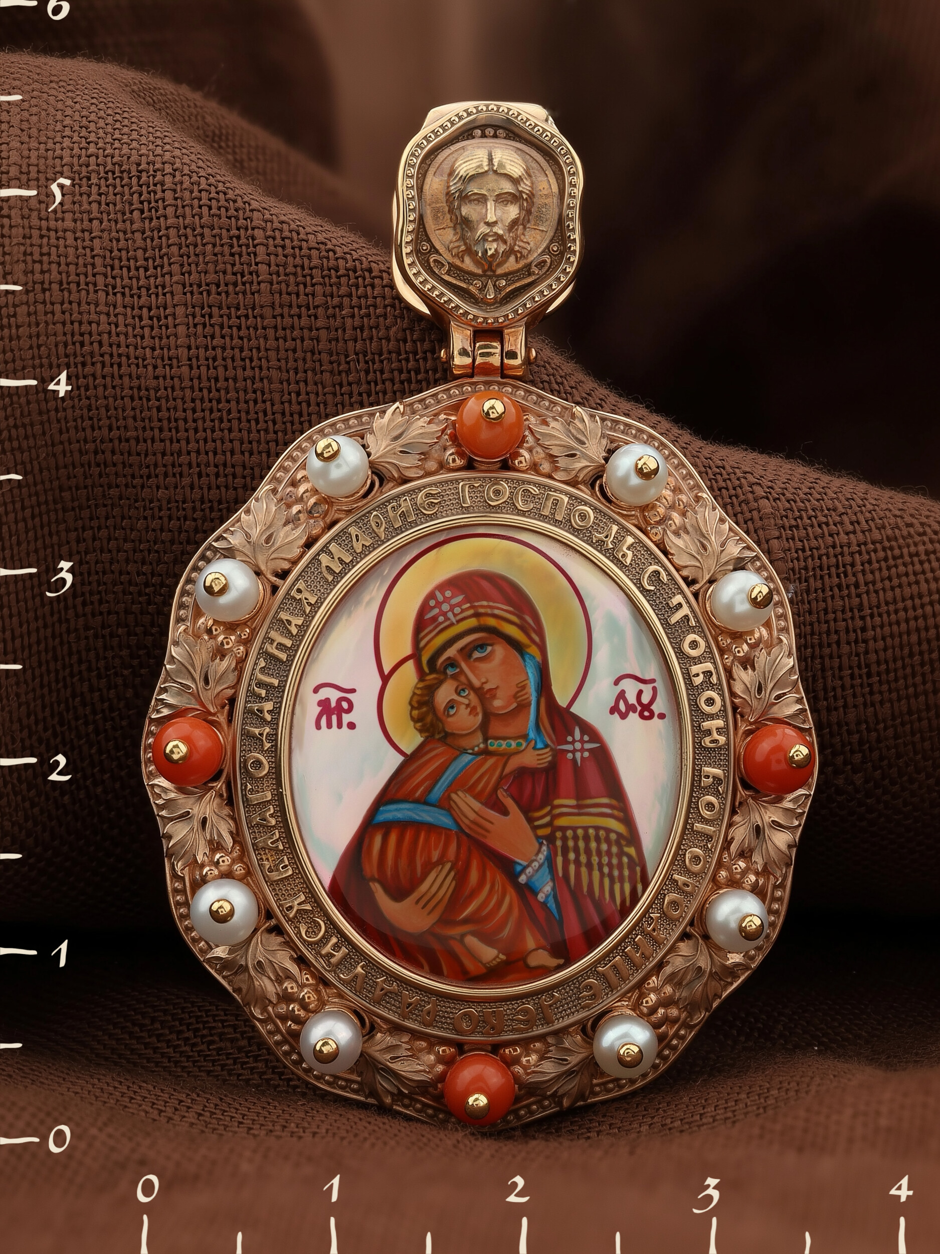 Образок из золота c эмаль, жемчугом, кораллом и перламутром