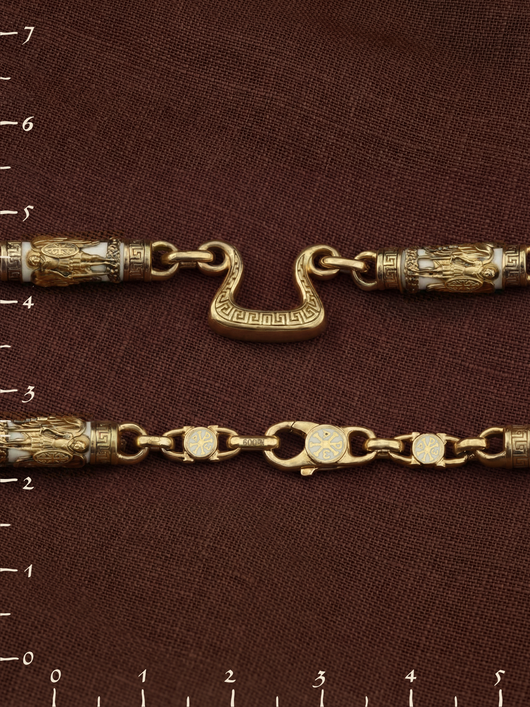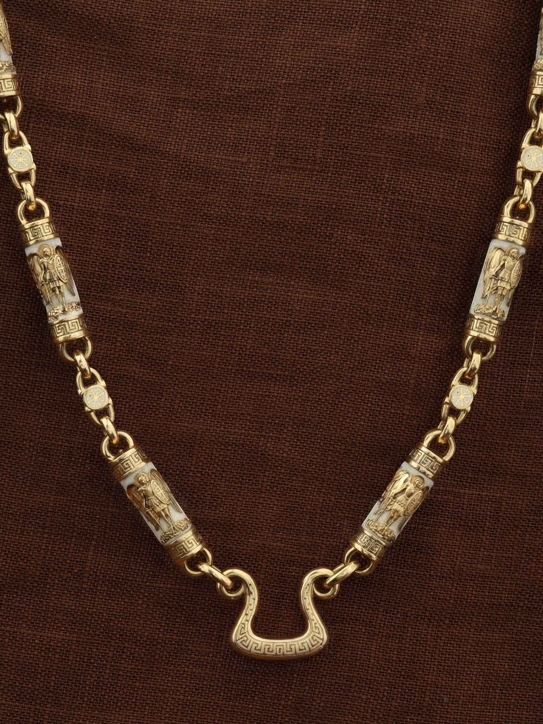На звеньях цепи изображена Хризма — монограмма имени Христа, которая состоит из двух начальных греческих букв имени  — Х (хи) и Р (ро), скрещённых между собой. По краям монограммы помещены греческие буквы a и w. Такое употребление этих букв восходит к тексту Апокалипсиса: «Аз есмь Альфа и Омега, начало и конец, говорит Господь, Который есть и был и грядет, Вседержитель.» (Откр. 1:8; см. также Откр. 22:13). Также на звеньях изображен Святой Ангел-Хранитель в виде прекрасного юноши держащего в правой руке мечь, а в левой — щит. Ангел-Хранитель — это Ангел приставляемый Богом к человеку при крещении для охраны и помощи в добрых делах. Он невидимо находится при человеке на протяжении всей его жизни, если человек сохраняет в себе любовь к Богу и истинную веру перед Ним. Ангел-Xранитель делают для нас все, что служит к истинному нашему благу и спасению. Невидимо пребывая при нас постоянно, он, руководствуя нас ко спасению, не только по нашему желанию таинственно наставляет нас на все доброе и полезное, не только возносит наши молитвы к Богу, но еще и сам от себя охраняют и защищают нас от врагов видимых и невидимых и ходатайствует за нас пред Богом. Ангел-Хранитель так любит нас, как никто на земле любить не может. Одного лишь каждому из нас он желает — спасения души; к этому он направляет все свои заботы. И если видит нас также заботящимися о спасении, радуется, если же видит нас пребывающими в нерадении о душе своей, скорбит. Но и самый великий грешник может примириться со своим Ангелом-Хранителем посредством искреннего раскаяния в грехах и оставления их навсегда. В таком случае, по слову Писания, великая радость бывает для всех ангелов на небесах (Лк. 15:10). Цепь украшена орнаментом.