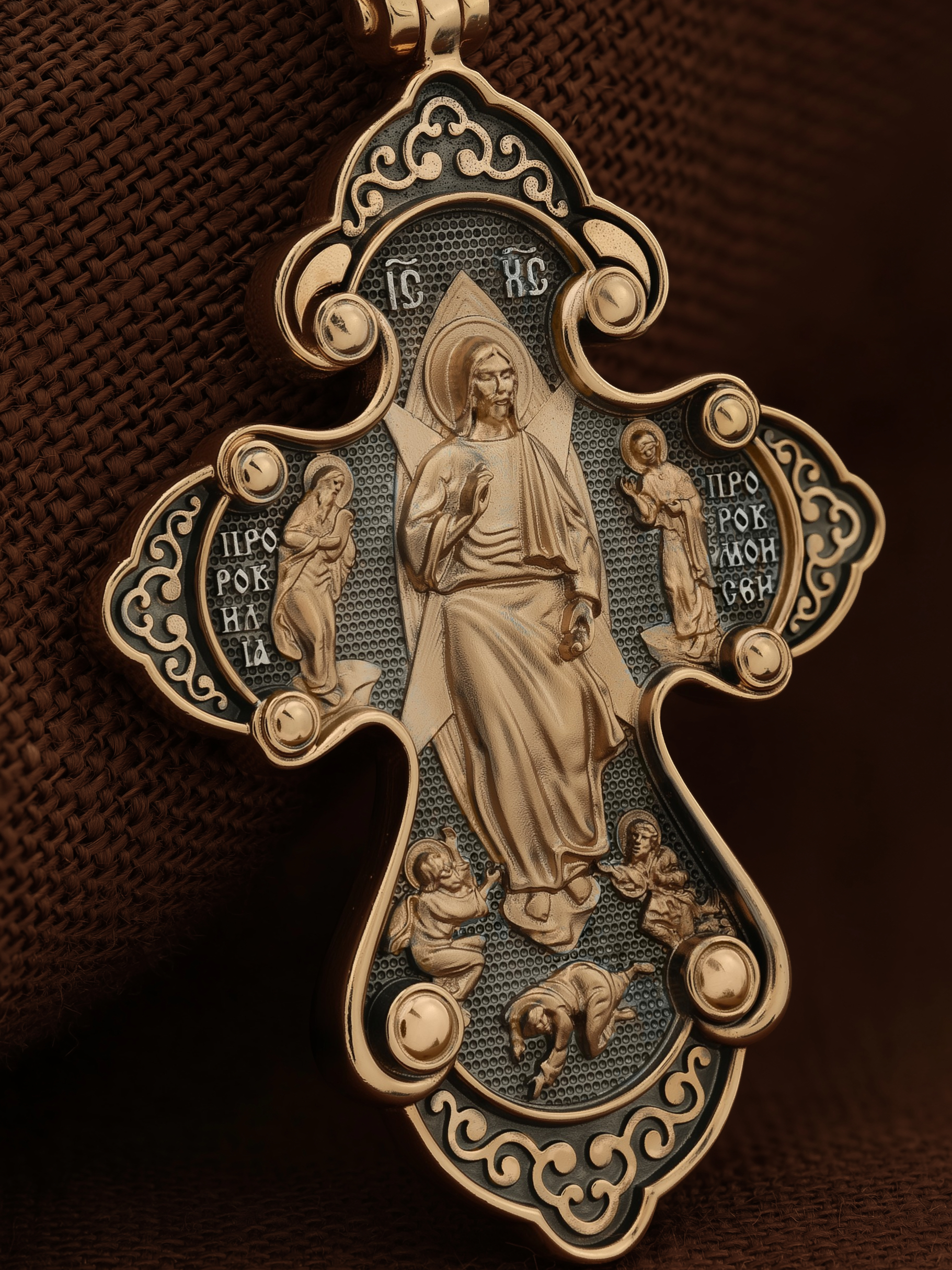 На оборотной стороне креста изображена икона «Преображение Господне». Иисус Христос вместе со своими учениками Петром, Яковом и Иоанном взошел на гору Фавор для молитвы. Пока Господь молился, ученики заснули, а проснувшись увидели, что Иисус преобразился — «лицо Его просияло, а одежды сделались ослепительно белыми». Рядом с Сыном Божьим они увидели ветхозаветных пророков — Моисея и Илию, которые беседовали с Ним о грядущих искупительных страданиях. Увидев такую картину, апостолов охватила неземная благодать, они захотели, чтобы это состояние продолжалось все время. А через некоторое время сверху сошло облако, которое скрыло Иисуса, Илию и Моисея от взора учеников и они услышали из облака Божий глас: « Сей есть Сын Мой возлюбленный, в Котором Мое благоволение. Его слушайте!» (Мф. 17,1−13). В страхе и почтении Петр, Иоанн и Иаков повалились на землю. Вскоре к ним подошел Иисус Христос в своей обычной одежде и сказал им, чтобы больше никто из людей, до Его Воскрешения, не знал о том, что произошло на этой горе. На кулонном кольце изображен парящий голубь — символ Святого Духа и Его благодати.