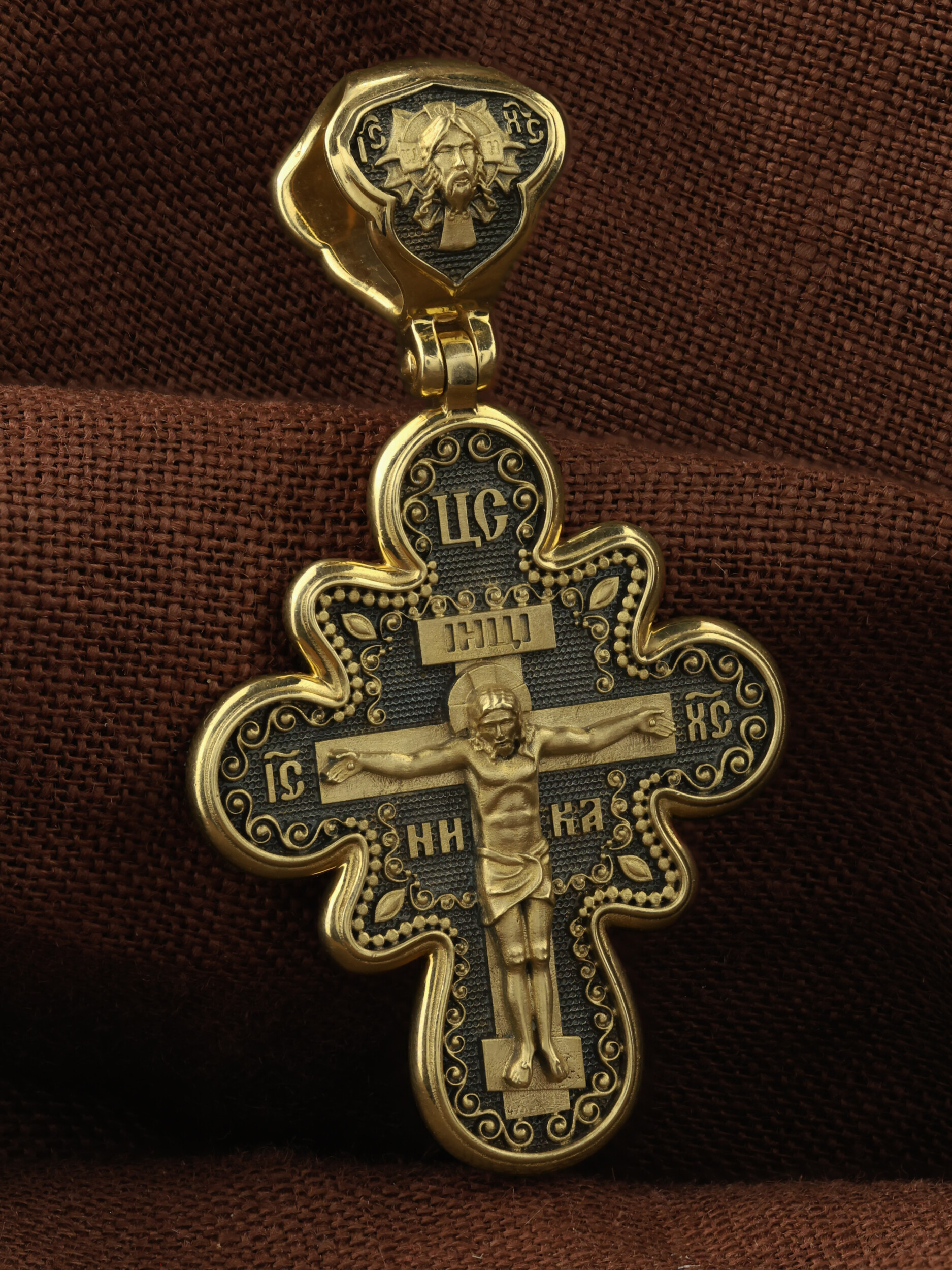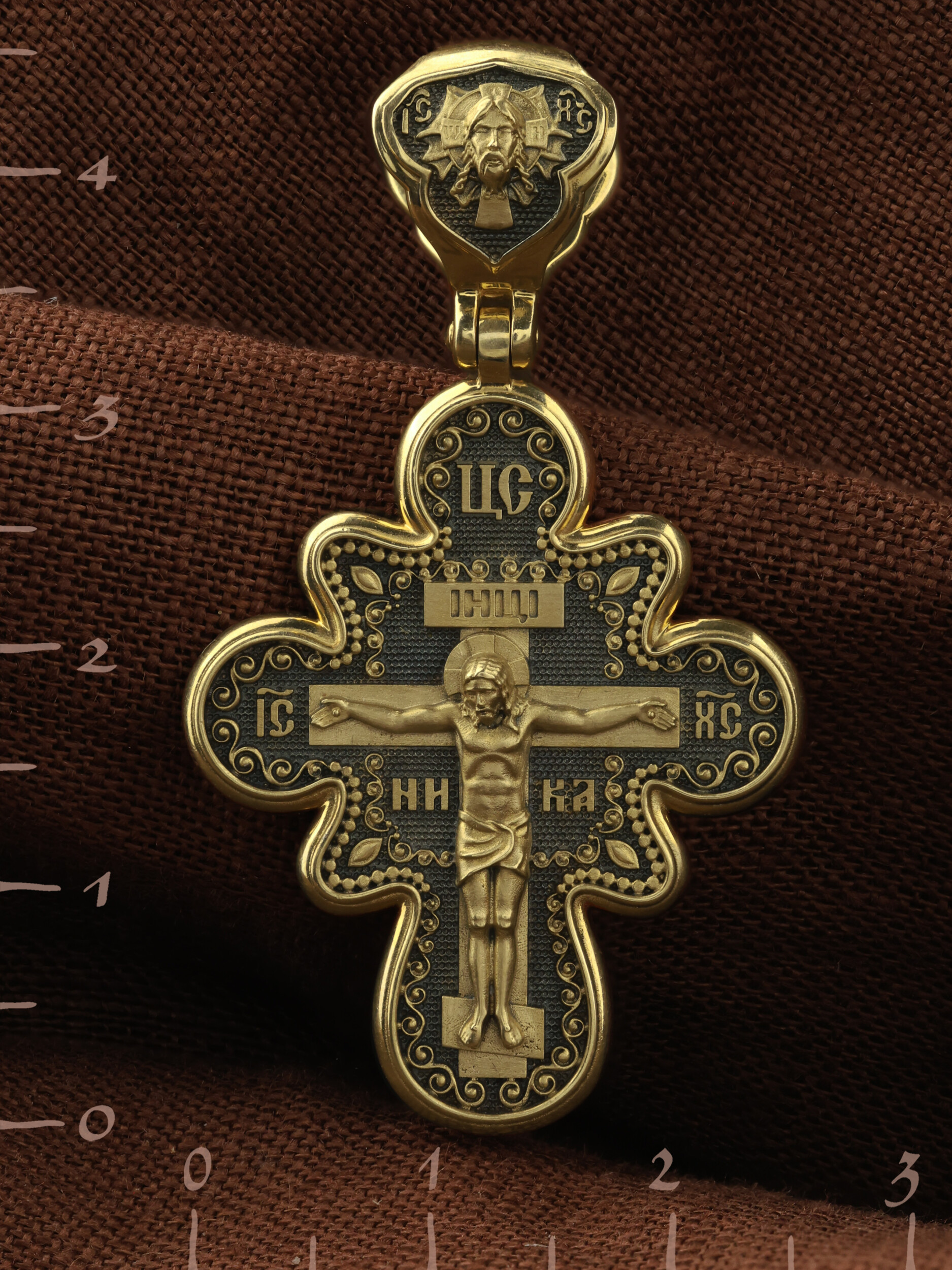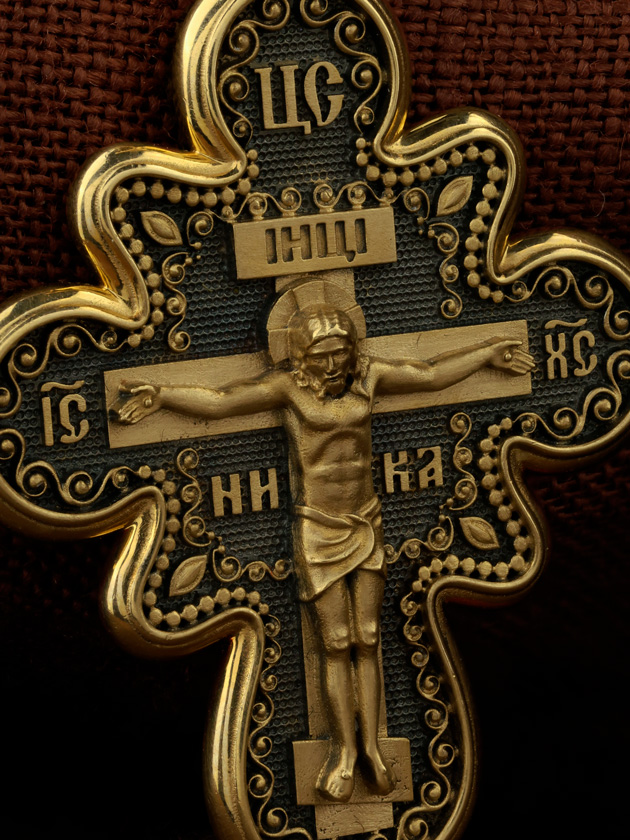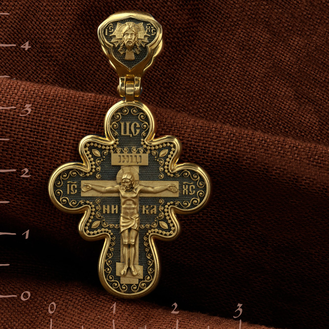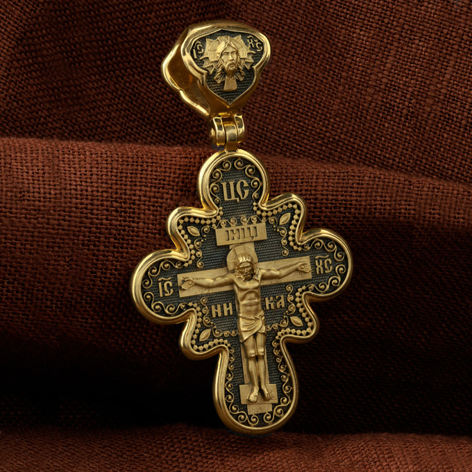 На лицевой стороне креста изображено Распятие Господа и Спасителя нашего Иисуса Христа. Крест- символ спасения и искупления рода человеческого, знамение победы над смертью и адом. Иисус Христос, как искупительная жертва освобождения человечества от власти греха, умер крестной смертью и в третий день воскрес. Над Распятием помещена надпись «Царь Славы». На верхней табличке, выше головы Иисуса, расположена надпись, составленная Понтием Пилатом — «IНЦI». Она означает «Иисус Назорей, Царь Иудейский». Надпись «IC» «ХC», означает Иисус Христос, помещается на разных сторонах поперечной перекладины креста. Рядом — слово «НИКА», что означает «победитель». На кулонном кольце изображен Нерукотворный образ Господа и Спасителя нашего Иисуса Христа, чудесно отпечатавшийся на плате, которым Христос вытер свой лик.