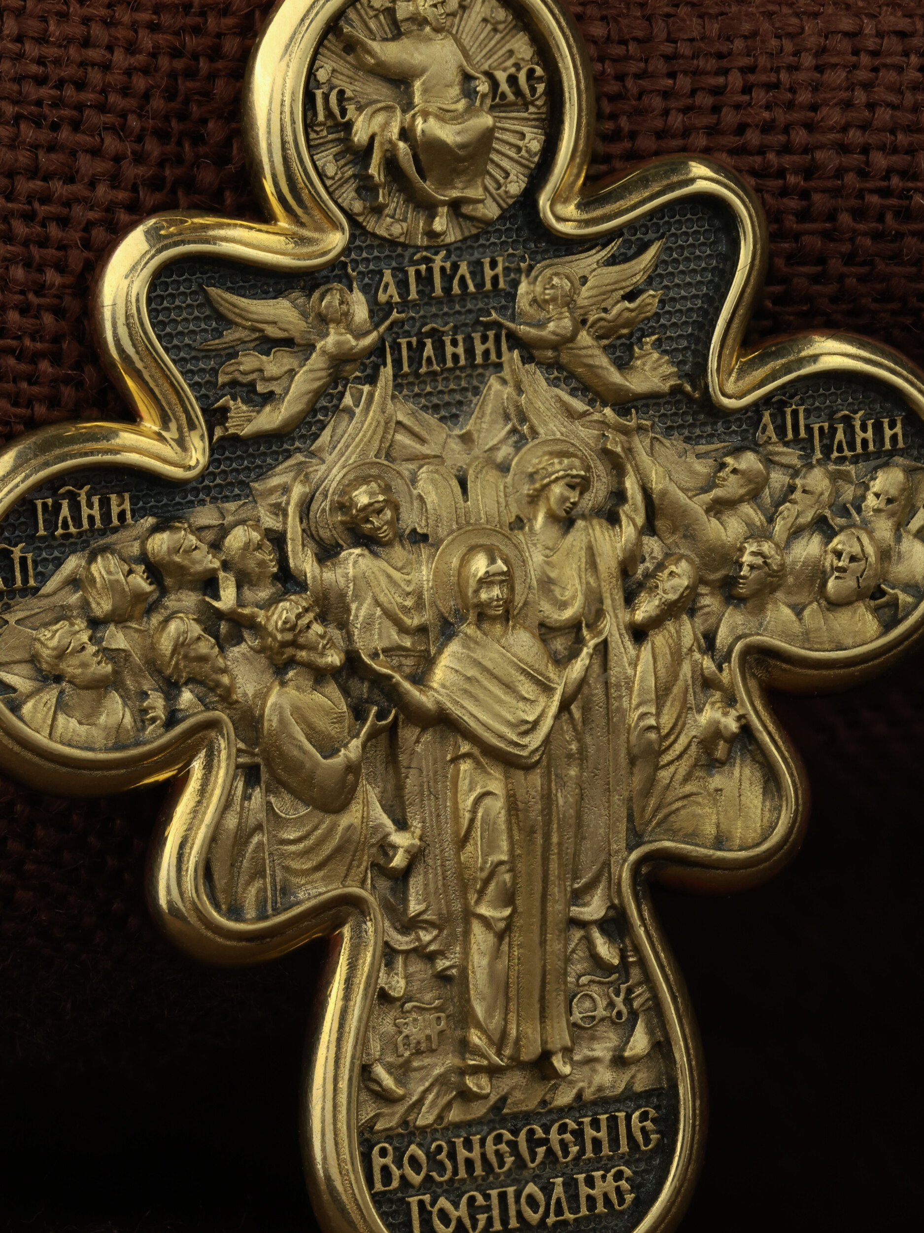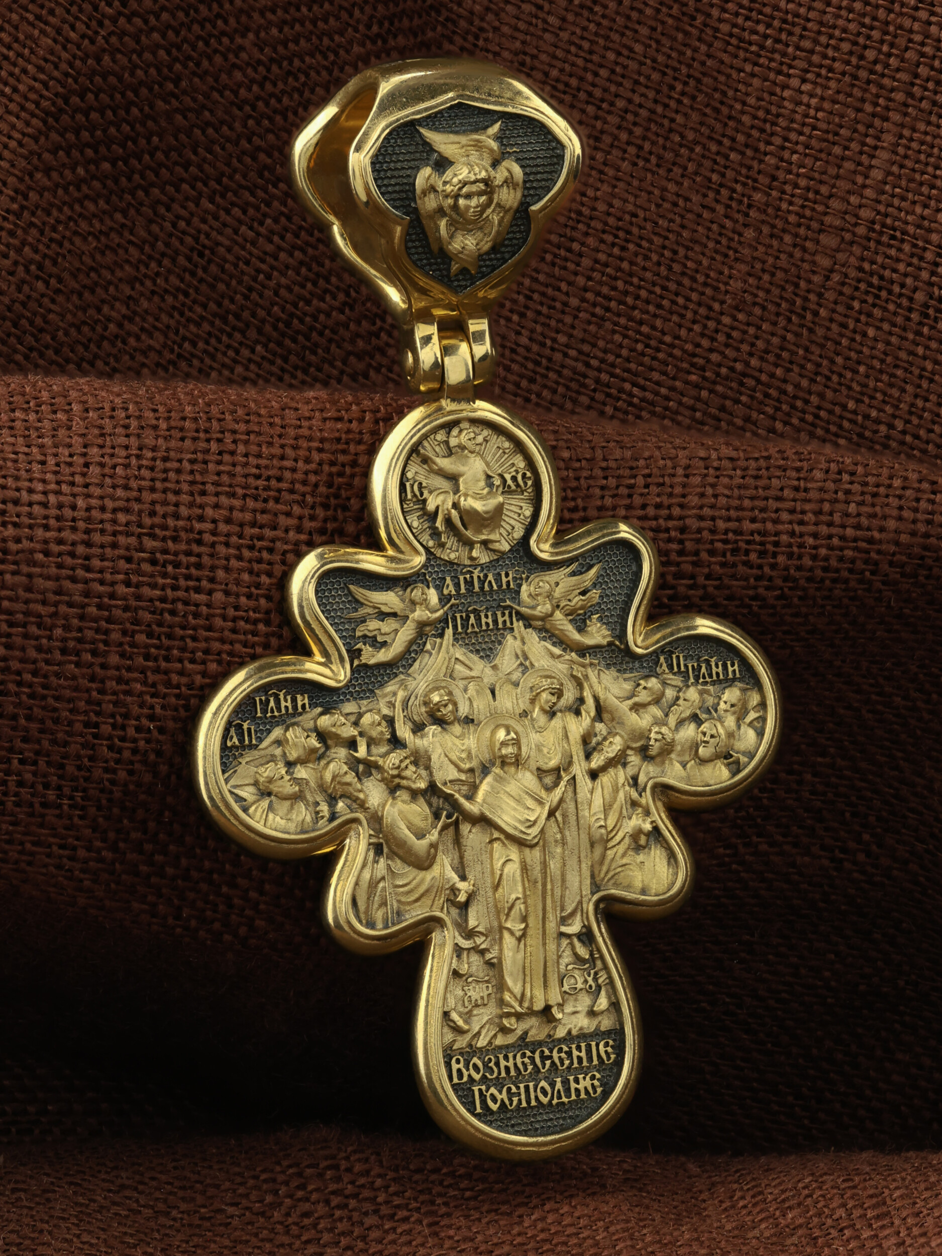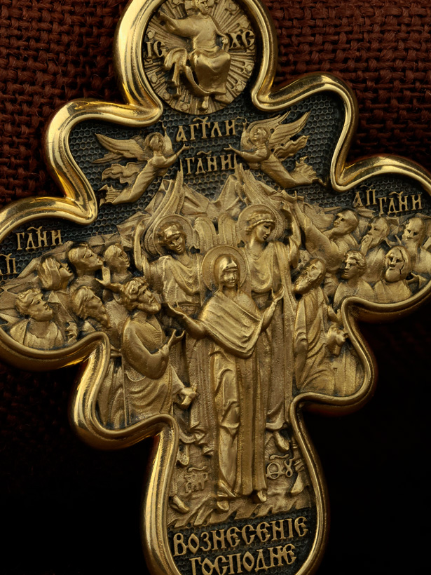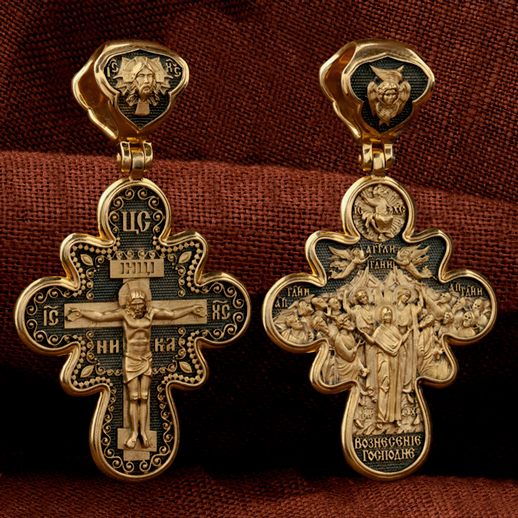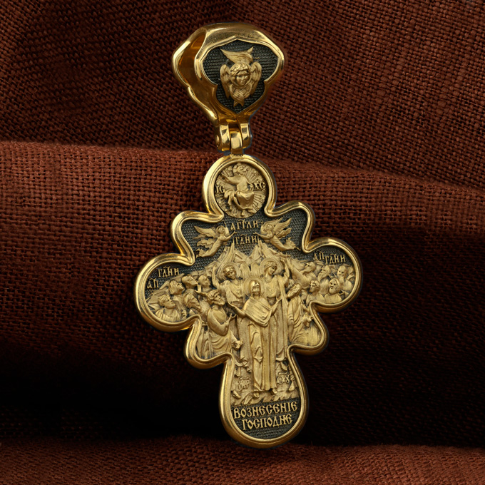 На оборотной стороне креста изображена икона Вознесение Господне. Описание события Вознесения Христова содержится в Евангелиях от Луки (Лк. 24, 50−51) и Марка (Мк. 16, 19), а также в Деяниях свв. апостолов (Деян 1, 9−11). Согласно этим повествованиям, после Своего Воскресения из мертвых Спаситель неоднократно являлся ученикам, чтобы удостоверить их в истинности Своего телесного Воскресения, укрепить в них веру и подготовить к принятию обетованного Святого Духа (Ин. 16, 7). На сороковой день после Своего Воскресения Господь Иисус Христос вывел учеников, собранных в Иерусалиме, из города в Вифанию, на гору Елеон (Деян. 1, 12). Здесь, после благословения апостолов, Он стал отдаляться от них и возноситься на небо. В Деяниях св. апостолов также упомянуто, что во время Вознесения Христова явились «два мужа в белой одежде», которые возвестили Его Второе пришествие: «Мужи галилейские! Что вы стоите и смотрите на небо? Сей Иисус, вознесшийся от вас на небо, придет таким же образом, как вы видели его восходящим на небо» (Деян. 1, 11). После Вознесения Господня ученики с радостью вернулись в Иерусалим (Лк. 24, 52), ожидая сошествия на них Святого Духа, которое произошло через несколько дней (Деян. 2, 1−4). На кулонном кольце изображен шестикрылый Ангел — Серафим.