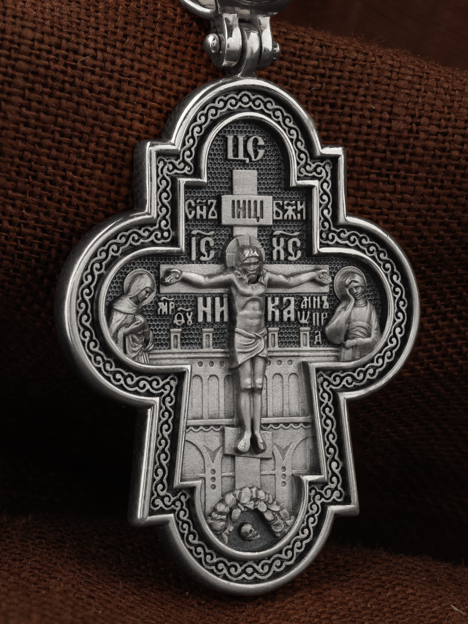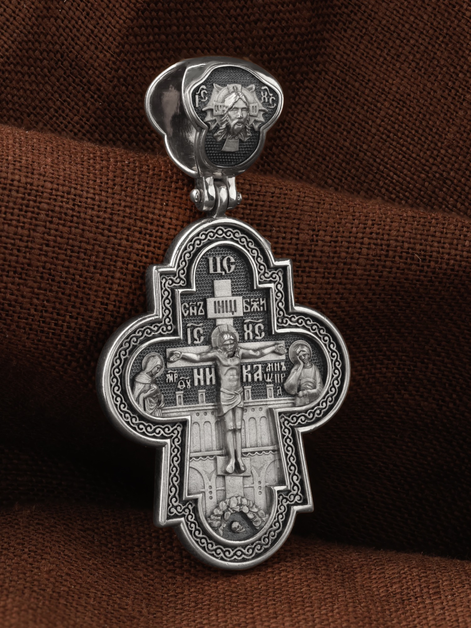 На лицевой стороне креста изображено Распятие Господа и Спасителя нашего Иисуса Христа, отдавшего Себя на смерть, для искупления грехов мира. Крест является символом жертвенной любви всеблагого Бога к падшим людям, всепобеждающим духовным оружием христиан, основанием и средоточием церковной жизни. Над Распятием помещена надпись «Царь Славы». Верхняя перекладина символизирует титло — табличку, на которой, согласно Евангелию, было начертано: Иисус Назорей Царь Иудейский (IНЦI). Распятие сопровождается надписями, олицетворяющими Христа. Надпись «Сын Божий» означает божественную природу Иисуса Христа. Надпись «IС» « ХС» означает Иисус Христос и размещена над поперечной перекладиной. Ниже — слово «НИКА», что означает «победитель». Слева от Распятия изображена Пресвятая Богородица, справа — апостол и евангелист Иоанн Богослов, один из ближайших учеников Иисуса Христа. За крестом высится Иерусалимская стена, в знак того, что Господь был распят вне стен города. Возвышение, на котором стоит Крест, символизирует гору Голгофу, на которой произошло Распятие. Под подножием Креста изображена покоящаяся голова (череп) Адама. На кулонном кольце изображен Нерукотворный образ Господа и Спасителя нашего Иисуса Христа, чудесно отпечатавшийся на плате, которым Христос вытер свой лик.