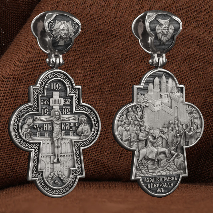 На оборотной стороне креста изображена икона Вход Господень во Иерусалим. Вход Господень в Иерусалим является одним из главных событий последних дней земной жизни Господа Иисуса Христа; оно описано четырьмя евангелистами. Господь в сопровождении учеников выехал из села Вифании и направился в Святой Град. С Елеонской горы Господь устремил свой взор на Иерусалим, вглядываясь в раскинувшийся внизу город, которому предназначено было стать Чашей Его Страданий. Толпы народа встречали Его, держа в руках пальмовые ветви (вайи), приветствуя криками: «Осанна!», что значит «спасение, радость, слава». Вход Господень в Иерусалим символически означает Второе Пришествие Христа. В Своем Первом Пришествии на землю Он явил Себя человечеству как Искупитель и Спаситель; во Втором — придет как Царь мира и Судия. На кулонном кольце изображен шестикрылый Ангел — Серафим.