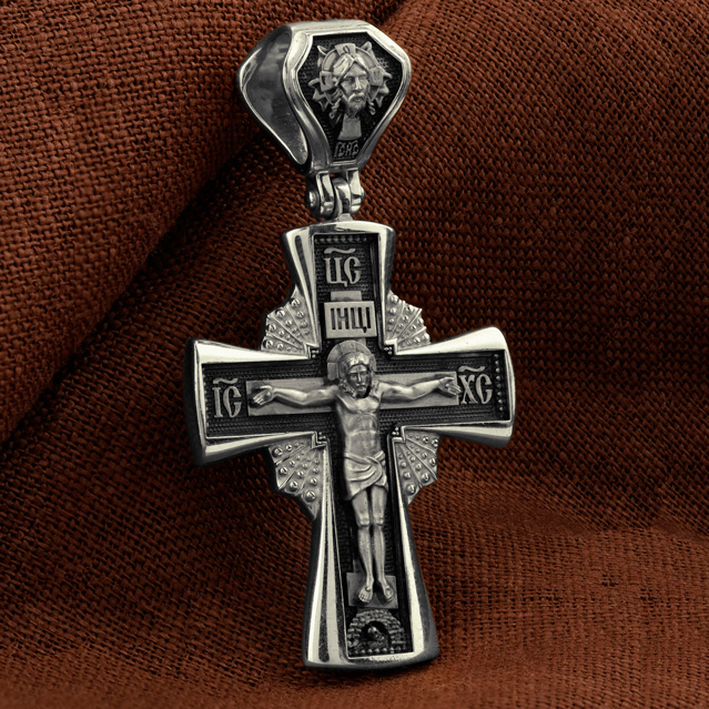 На лицевой стороне креста изображено Распятие Господа и Спасителя нашего Иисуса Христа, отдавшего Себя на смерть, для искупления грехов мира. Крест является символом жертвенной любви Всеблагого Бога к падшим людям, всепобеждающим духовным оружием христиан, основанием и средоточием церковной жизни. Господь сказал: кто хочет идти за Мною, отвергнись себя, и возьми крест свой, и следуй за Мною. (Мк. 8: 34). Над Распятием помещена надпись «Царь Славы». На верхней табличке, выше головы Иисуса, расположена надпись, составленная Понтием Пилатом — «IНЦI». Она означает «Иисус Назорей, Царь Иудейский». Надпись «IC» «ХC», означает Иисус Христос, помещается на разных сторонах поперечной перекладины креста. Возвышение, на котором стоит Крест, символизирует гору Голгофу, на которой произошло Распятие. Под подножием Креста изображена покоящаяся голова (череп) Адама. На кулонном кольце изображен Нерукотворный образ Господа и Спасителя нашего Иисуса Христа, чудесно отпечатавшийся на плате, которым Христос вытер свой лик. Ниже надпись — «IC» «ХC».