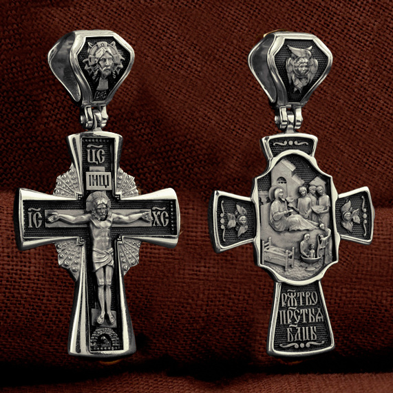 На оборотной стороне креста изображена икона Рождество Пресвятой Богородицы. Согласно церковному Преданию, Пресвятая Дева Мария родилась в небольшом галилейском городе Назарете. Родителями Её были праведные Иоаким и Анна. Супруги были бездетны, но не теряли надежды, что Господь может разрешить неплодство Анны даже в её преклонном возрасте. Они горячо молились и просили Господа даровать им дитя, которое обещали посвятить Богу для служения в храме. И Господь услышал их молитвы: Праведная Анна зачала и разрешилась дочерью Марией — будущей Пресвятой Богородицей. На кулонном кольце изображен шестикрылый Ангел — Серафим.