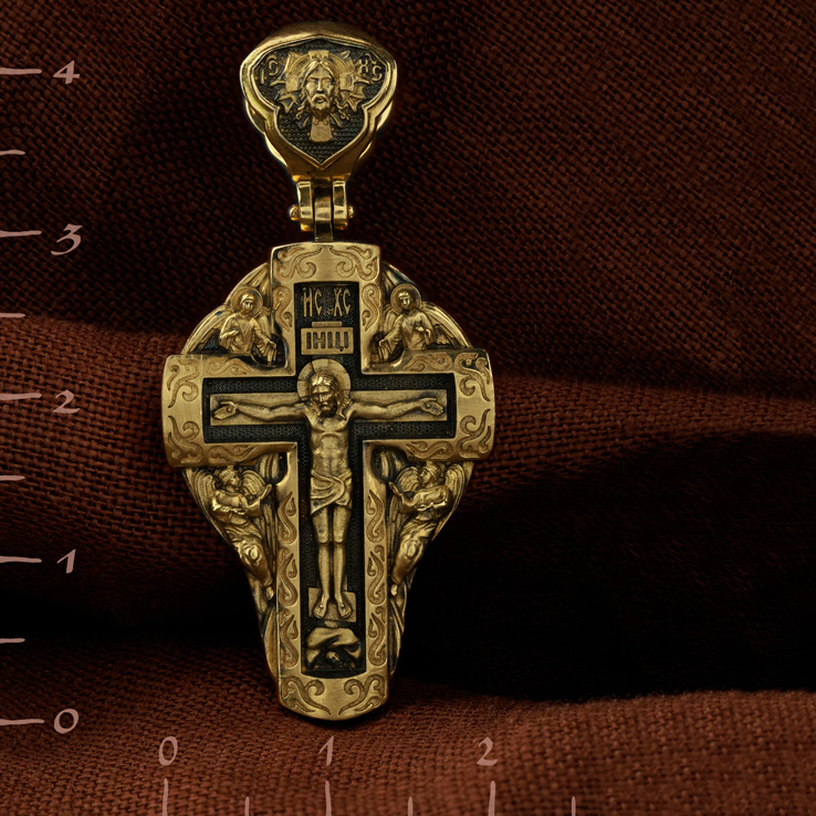 На лицевой стороне креста изображено Распятие Господа и Спасителя нашего Иисуса Христа, отдавшего Себя на смерть, для искупления грехов мира. Крест является символом жертвенной любви Всеблагого Бога к падшим людям, всепобеждающим духовным оружием христиан, основанием и средоточием церковной жизни. Господь сказал: кто хочет идти за Мною, отвергнись себя, и возьми крест свой, и следуй за Мною. (Мк. 8: 34). Над Распятием помещена надпись «IC» «ХC», означает Иисус Христос. На верхней табличке, выше головы Иисуса, расположена надпись, составленная Понтием Пилатом — «IНЦI». Она означает «Иисус Назорей, Царь Иудейский». Возвышение, на котором стоит Крест, символизирует гору Голгофу, на которой произошло Распятие. Под подножием Креста изображена покоящаяся голова (череп) Адама. У Креста изображены Ангелы. На кулонном кольце изображен Нерукотворный образ Господа и Спасителя нашего Иисуса Христа, чудесно отпечатавшийся на плате, которым Христос вытер свой лик. Ниже надпись — «IC» «ХC».