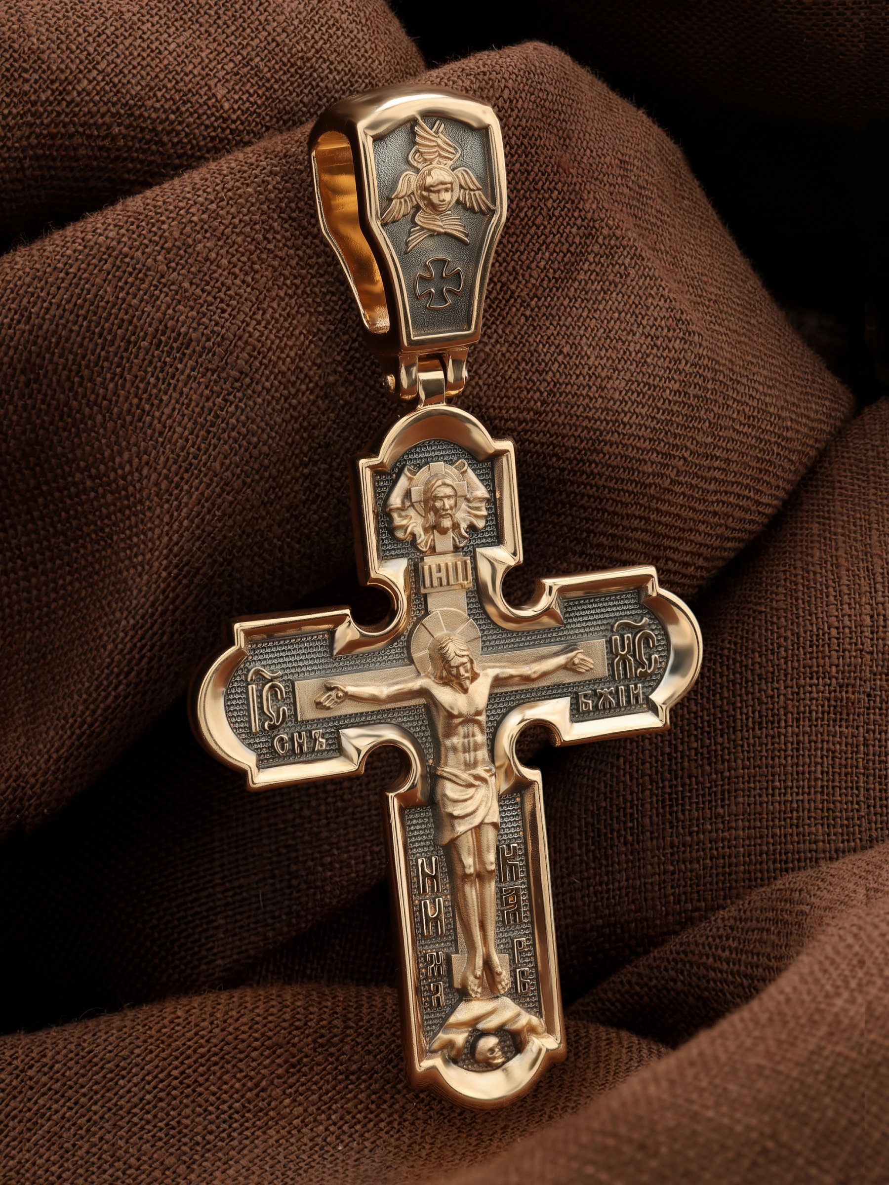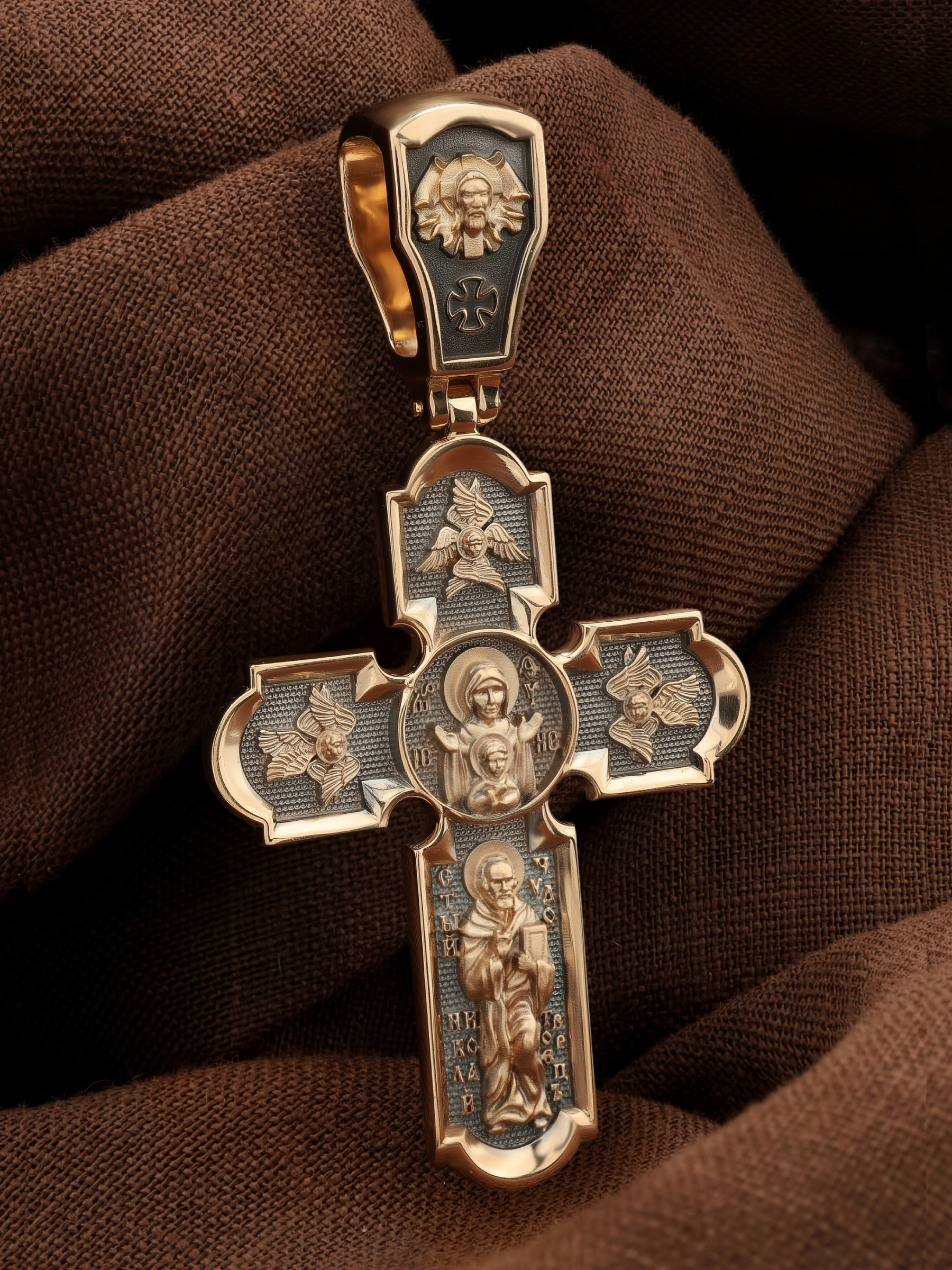 На лицевой стороне нательного креста по традиции изображено Распятие Господа нашего Иисуса Христа. Крест Господень стоит на небольшом каменистом возвышении, символизирующем гору Голгофу, которая обозначена буквами МЛРБ (Место Лобное Рай Бысть). Над головой Господа на поперечной перекладине написано «ИНЦИ», что символизирует табличку, которая была прибита к Кресту, с надписью «Иисус Назорей Царь Иудейский». Этим иудеи хотели посмеяться над Христом, не зная, что распинают истинного Царя всех царей. По сторонам основной перекладины расположены позолоченные рельефные инициалы Христа «ИС ХС». Под перекладиной, по сторонам древа, находится надпись «СЫН БОЖИЙ», а в основании креста — надпись «НИКА» (Победитель).