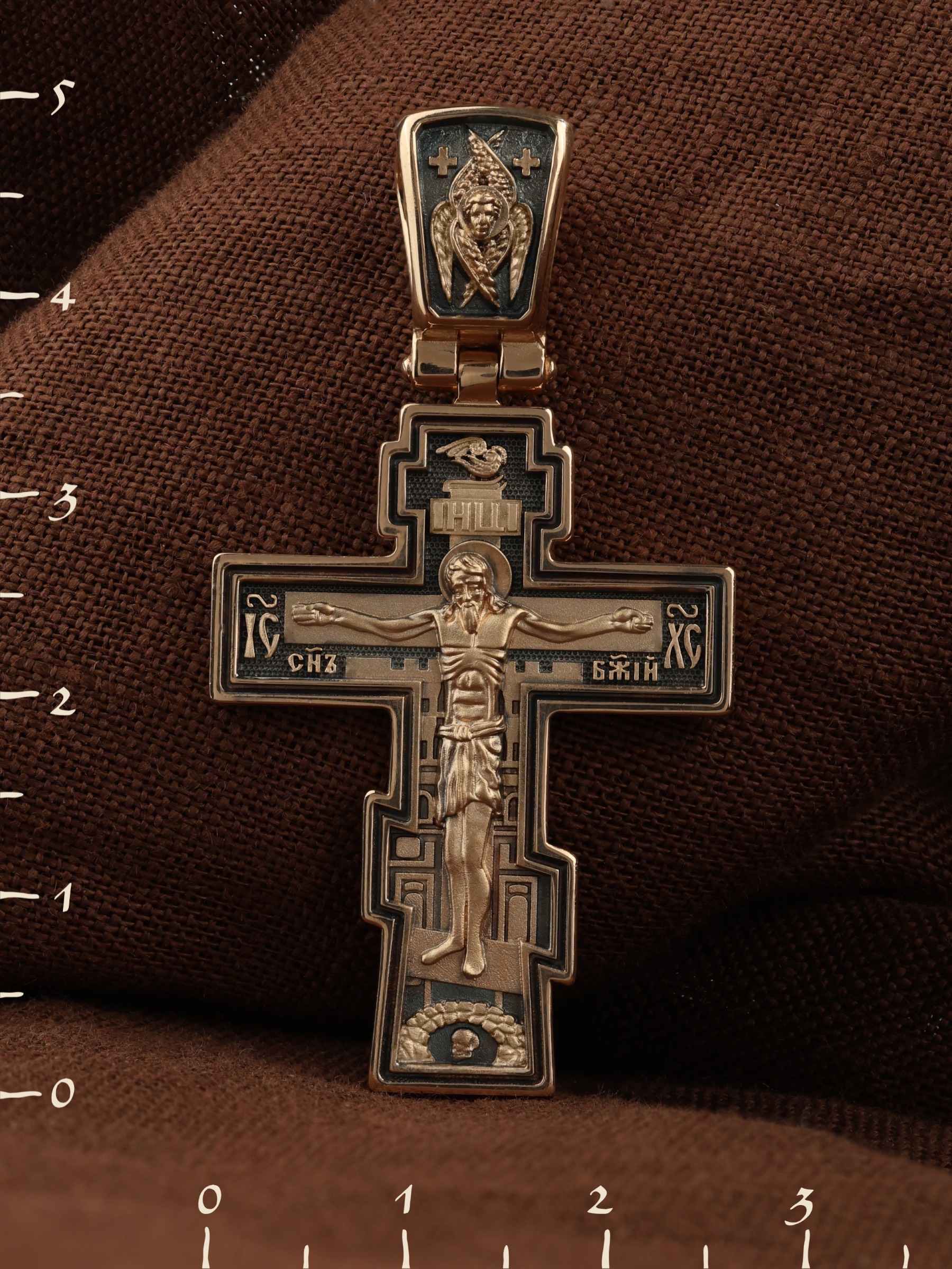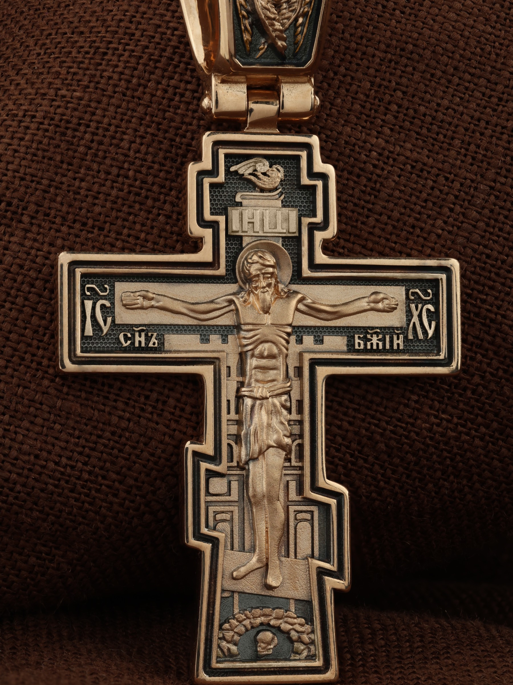 Восьмиконечный нательный крест с Распятием Иисуса Христа на горе Голгофе. Форма этого кресты является одной из самых распространенных на Руси и более всего соответствует тому Кресту, на котором был распят Христос.