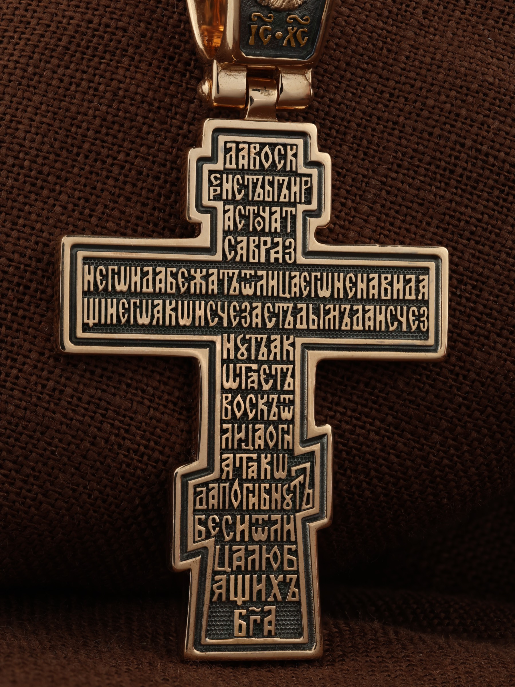 На обороте написаны начальные стихи оградительной молитвы Честному Кресту Господню. Эту молитву читают в опасности, а также носят при себе для защиты от злых сил: Да воскреснет Бог, и расточатся врази Его, и да бежат от лица Его ненавидящий Его. Яко исчезает дым, да исчезнут; яко тает воск от лица огня, тако да погибнут беси от лица любящих Бога и знаменующихся крестным знамением, и в веселии глаголющих: радуйся, Пречестный и Животворящий Кресте Господень, прогоняй бесы силою на тебе пропятаго Господа нашего Иисуса Христа, во ад сшедшаго и поправшаго силу диаволю, и даровавшаго нам тебе Крест Свой Честный на прогнание всякаго супостата. О, Пречестный и Животворящий Кресте Господень! Помогай ми со Святою Госпожею Девою Богородицею и со всеми святыми во веки. Аминь»