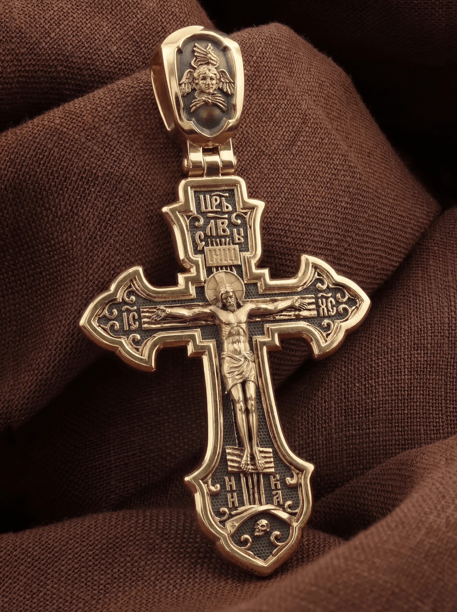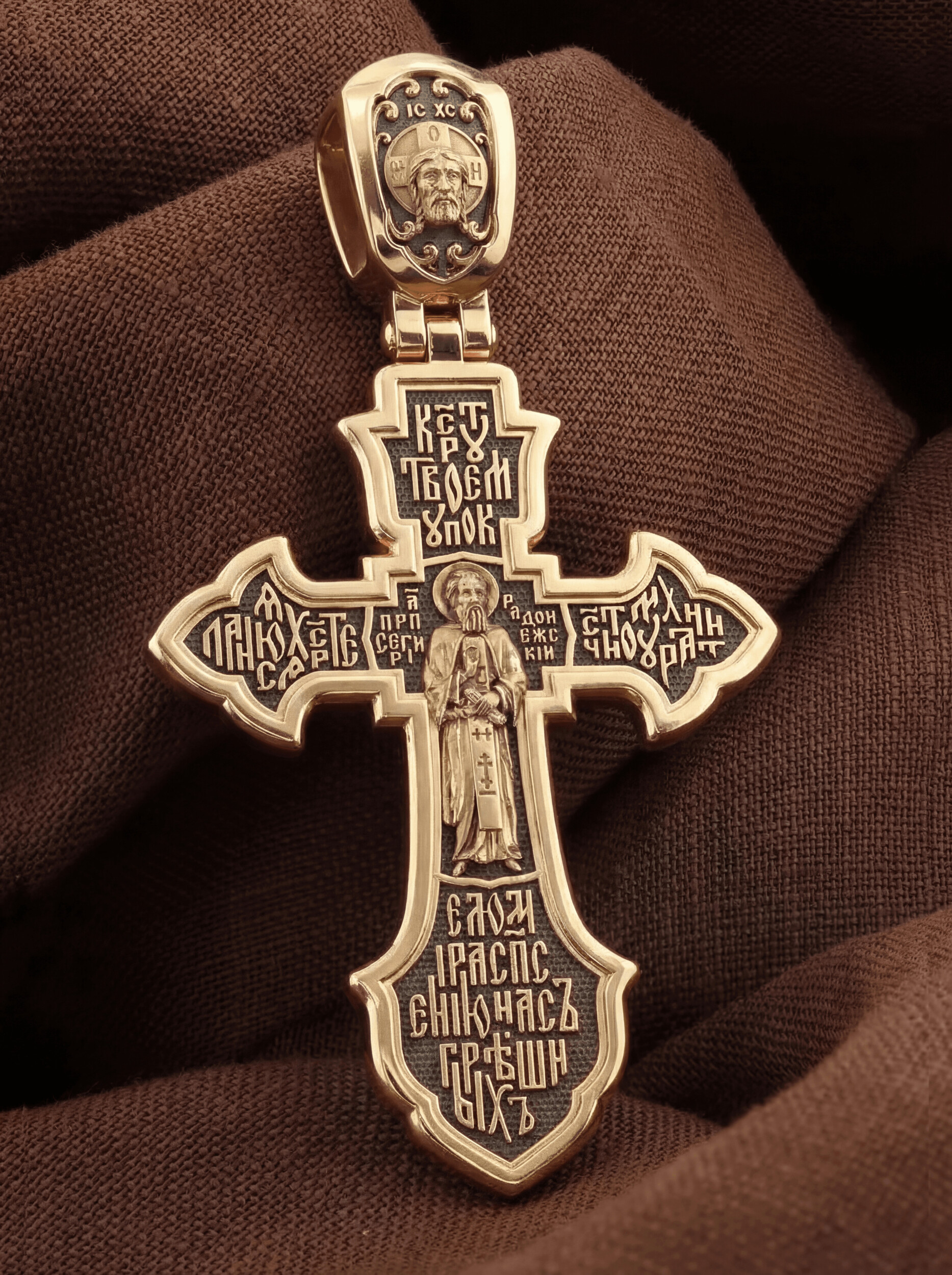 На лицевой стороне этого креста центральную часть занимает икона Распятия Христа — образ жертвы, принесенной Господом за грехи людей. Именно ко Христу, сошедшему на землю ради нашего спасения, возносятся все молитвы. Рядом с Его образом помещены слова — «НИКА» и «Царь Славы». Эти слова характеризуют Господа как Великого Архиерея, победителя смерти. Также Распятие сопровождается надписями, олицетворяющими Христа — это святое имя Христа «IC» (Иисус) «ХС» (Христос). Венчает лицевую сторону креста надпись «Царь Славы». На кулонном кольце помещено изображение Спаса Нерукотворного.