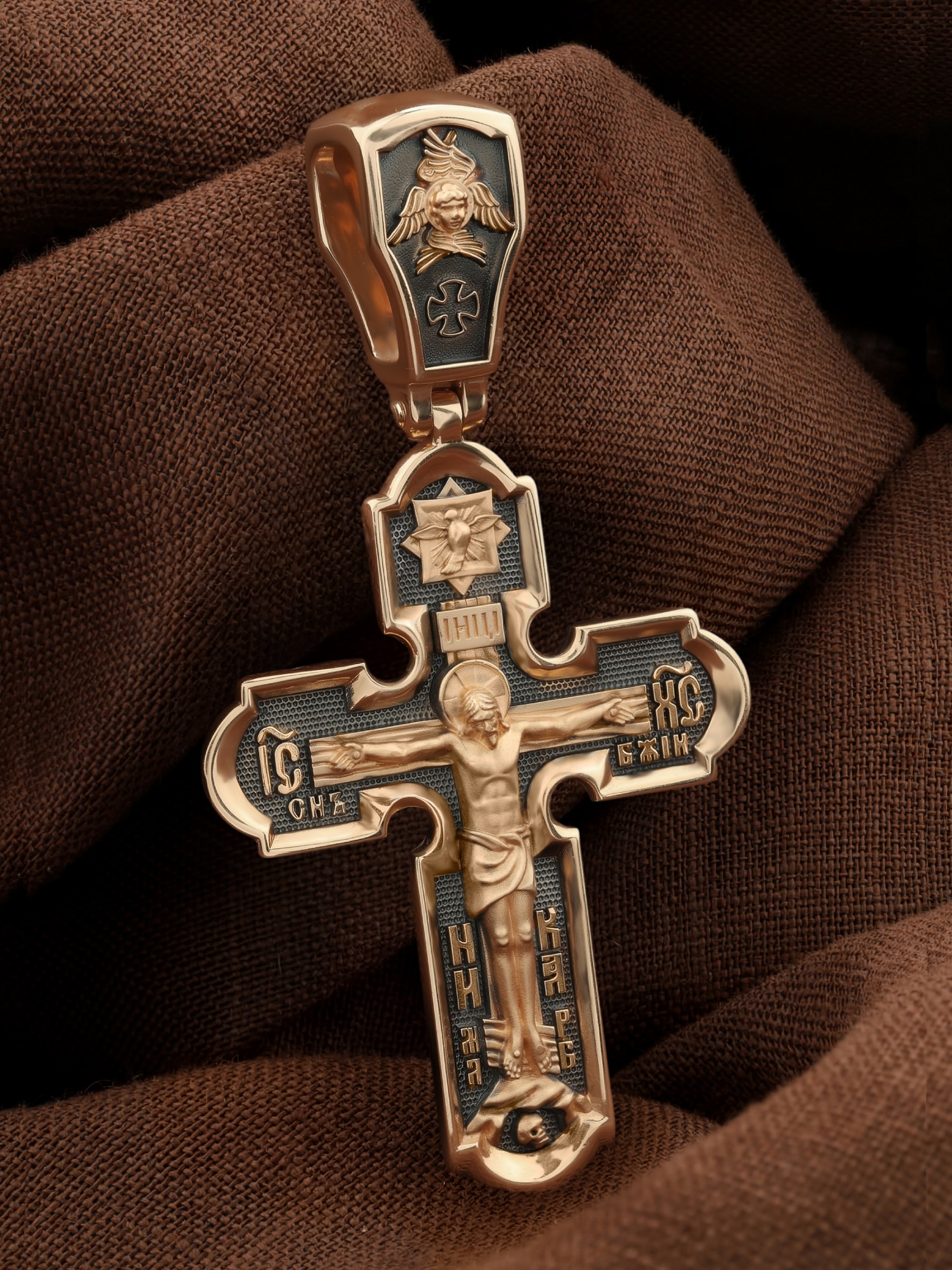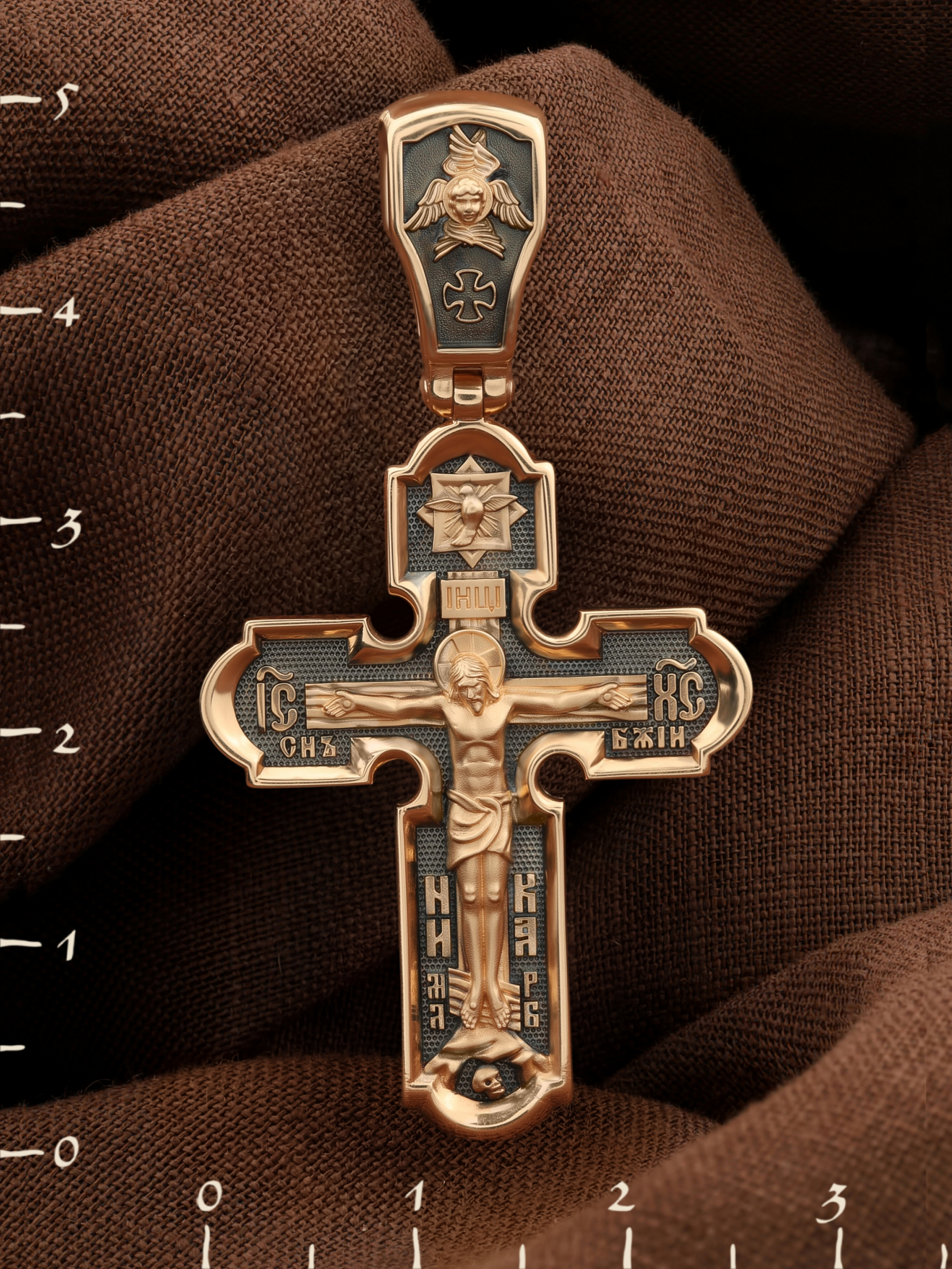 На лицевой стороне креста изображено Распятие Господа и Спасителя нашего Иисуса Христа. Христос, подвергнутый на кресте мучительной казни, своими страданиями искупил нас от древнего греха и даровал нам жизнь вечную. На верхней табличке, выше головы Иисуса, расположена надпись, составленная Понтием Пилатом — «IНЦI». Она означает «Иисус Назорей, Царь Иудейский». Надпись «IС» « ХС» означает Иисус Христос и словосочетание «СЫН БОЖИЙ», что означает божественную природу Иисуса Христа. В нижней части креста находятся надписи «НИКА» и «МЛРБ». В переводе с греческого, слово «НИКА» означает «победитель». Надпись «МЛРБ» — «место лобное рай бысть» — означает, что место лобное стало раем. Крест стоит на горе камней, символизирующих Голгофу. Под подножием Креста изображена покоящаяся голова (череп) Адама.