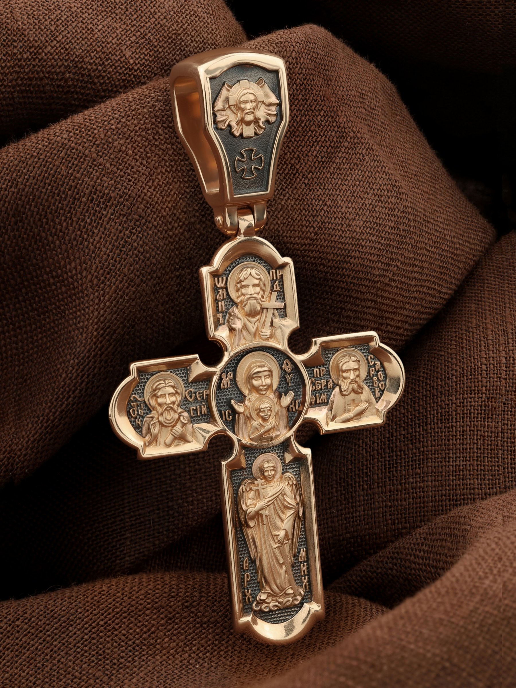 Центральную часть оборотной стороны креста украшает икона Божией Матери «Знамение». Иконы Божией Матери, известные под именем «Знамение», появились на Руси в XI — XII веках, а называться так стали после чудесного знамения от Новгородской иконы, случившегося в 1170 году. Многочисленные списки с иконы Знамения известны по всей России. На кресте внизу изображен Архангел Михаил, слева — Преподобный Сергий Радонежский, справа — Преподобный Серафим Саровский, вверху  — Предтеча Господень Иоанн Креститель. На кулонном кольце помещено изображение Спаса Нерукотворного — образ Спасителя, который Он запечатлел на плате и передал для исцеления больному проказой царю Эдессы. Ему придается победное и защитное значение.