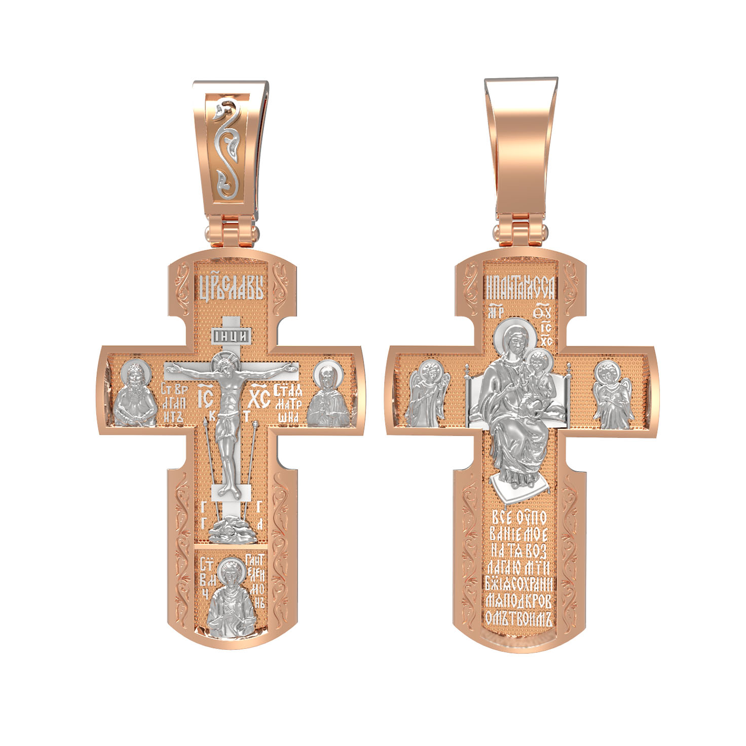 Как действенная помощь в немощах и болезнях был создан крест с образами святых целителей и со знаменитой афонской иконой Божией Матери «Всецарица». На лицевой стороне креста изображено Распятие Иисуса Христа. Над титлом видим слова «ЦРЬ СЛВЫ» — Царь Славы. Верхняя перекладина символизирует собой табличку с надписью «IHЦI» — Иисус Назарянин Царь Иудейский. Под перекладиной пишется сокращенно имя Спасителя «IC XC» — Иисус Христос. Возвышение, на котором стоит Крест, символизирует гору Голгофу, на которой произошло Распятие. У подножия Креста изображают прах Адама, обозначенный черепом. Справа от Распятия помещен образ прославленной святой блаженной Матроны. Слева — икона Преподобный Агапита. Этот святой жил в пещерах Киево-Печерского монастыря в XI веке и бескорыстно врачевал мирян и монахов. У основания Креста Господня изображен великомученик Пантелеимон Целитель. Господь даровал удивительную силу его молитве. Ею он исцелял любые болезни и даже воскрешал умерших.