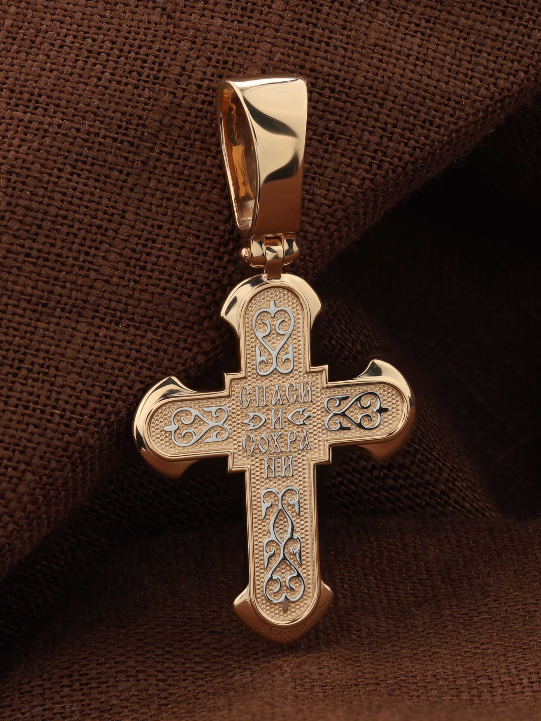 Обратная сторона креста выполнена с использованием растительного орнамента. Такой крест с растительным узором вводит мотив процветшего креста и символизирует Древо Жизни. Умерев за наши грехи, Христос возродил всех для Жизни Вечной, «Смертию смерть поправ…». Своими страданиями Он искупил грехи человечества, умерев и сошествовав во ад, победил сатану, освободил души праведников от вечной смерти и открыл им небесные врата рая. Поэтому на обороте данного креста написано молитвенное славословие: «Спаси и сохрани».