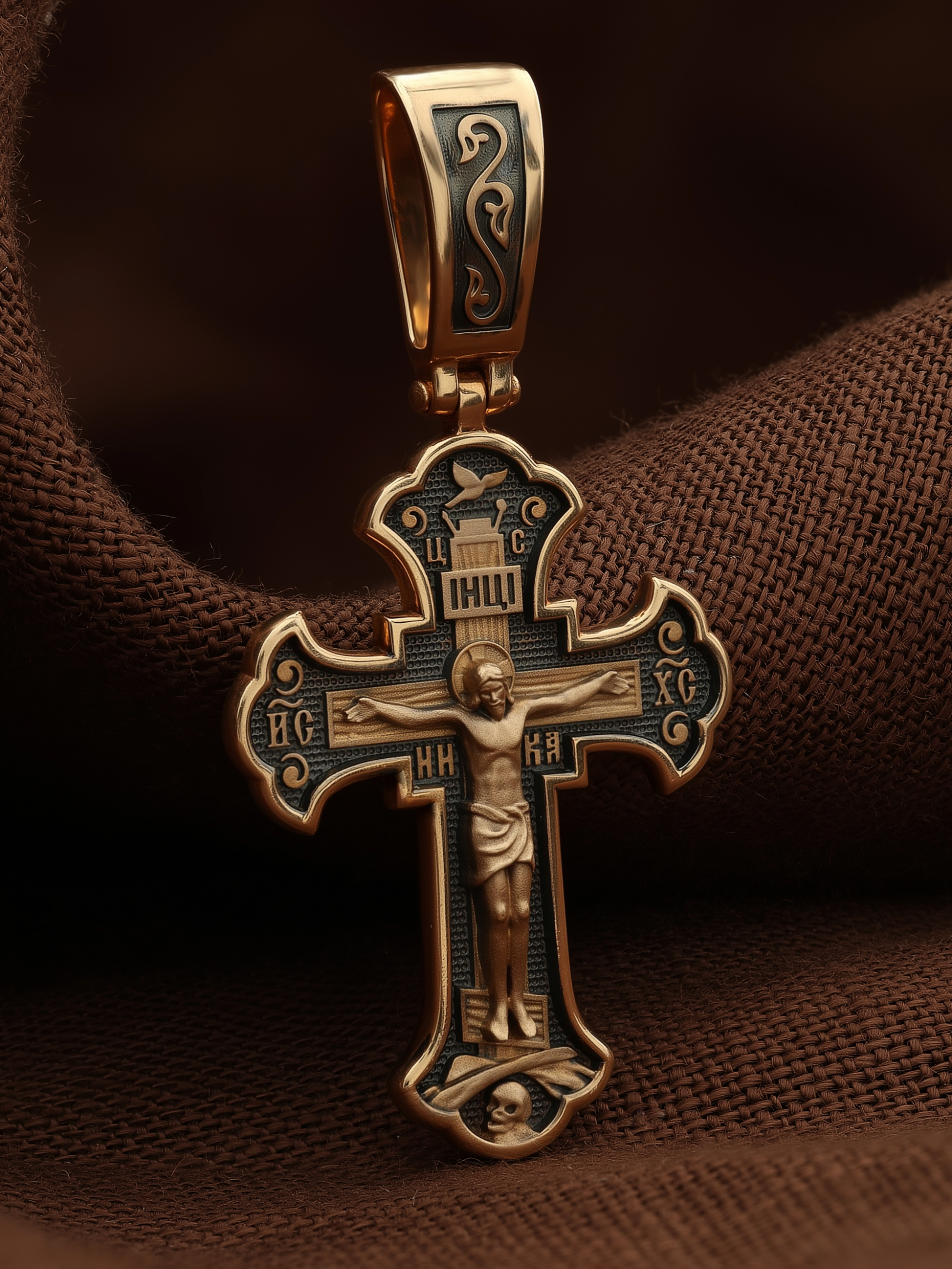На лицевой стороне креста изображено Распятие, потому что это орудие казни Иисус Христос сделал орудием победы над грехом и смертью. Своими страданиями Он искупил грехи человечества, умерев и сошествовав во ад, победил сатану, освободил души праведников от вечной смерти и открыл им небесные врата рая. Жертва Христа сделала возможным спасение для каждого человека. На православном кресте Христос не умирает, а свободно простирает руки, ладони Иисуса открыты, будто он хочет обнять все человечество, даря им свою любовь и открывая путь к вечной жизни.