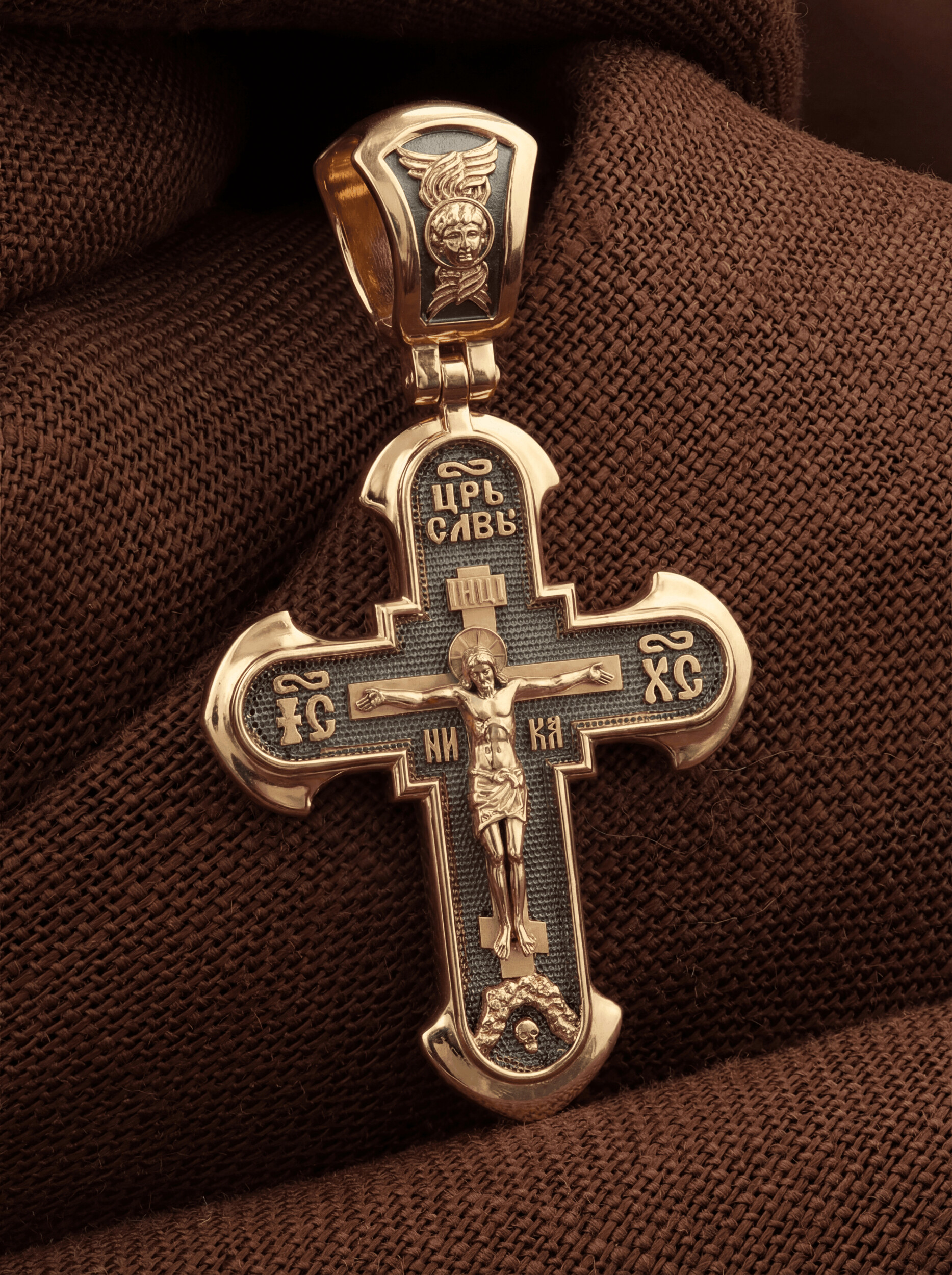 На лицевой стороне креста изображено Распятие Господа нашего Иисуса Христа. В традиции Православия — принято изображать Спасителя как Воскресшего Крестоносителя, призывающего в Свои объятия все концы мира. Его руки имеют горизонтальное положение, открытые ладони пробиты гвоздями, голова наклонена вправо, вокруг головы крестчатый нимб. Крест стоит на горе камней, символизирующих Голгофу, в основании которой различается череп. Это голова Адама. По преданию, тело Адама было погребено Симом, сыном Ноя, на месте, где впоследствии возникла гора Голгофа. Над головой Господа на поперечной перекладине аббревиатура «IНЦI», что символизирует табличку, которая была прибита к Кресту, с надписью «Иисус Назорей Царь Иудейский». Этим иудеи хотели посмеяться над Христом, не зная, что распинают истинного Царя всех царей. По бокам поперечной перекладины титлы святого имени Христа «IC» (Иисус) «ХС» (Христос), и слово «НИКА», что в переводе с греческого означает «победитель». Венчает лицевую сторону креста надпись «Царь Славы».