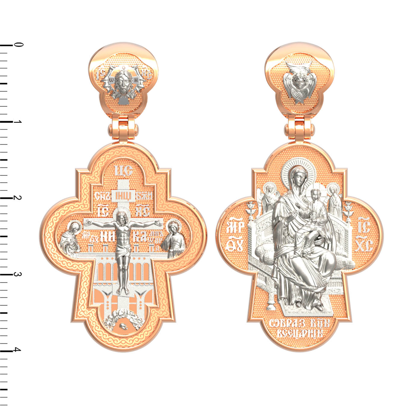 На оборотной стороне креста изображена икона Божией Матери «Всецарица» или «Пантанасса», на которой Пресвятая Богородица восседает на царском троне. На руках Ее — Богомладенец Христос со свитком в левой руке и благословляющий десницей. Правой рукой Богородица указывает на Своего Царственного Сына, как на Спасителя мира. Чудотворная икона была написана в XVII веке и находится на Святой Горе Афон, в одном из древних греческих монастырей — Ватопеде. По молитвам перед иконой совершается множество чудесных исцелений. Пречистая Богородица наставляет на праведный путь, помогает укрепить веру, найти утешение. На кулонном кольце изображен шестикрылый Серафим.