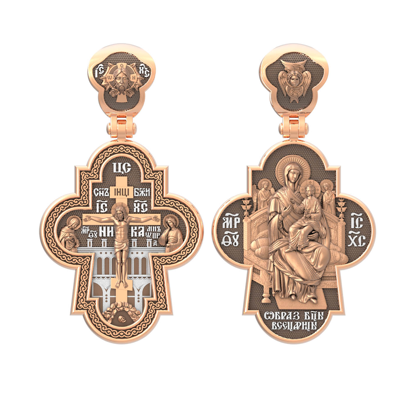 На лицевой стороне креста изображено Распятие Господа и Спасителя нашего Иисуса Христа, отдавшего Себя на смерть, чтобы другие могли жить — жить вечной жизнью, жить с Богом. Через крестную жертву Бог раскрывает нам Свою безмерную любовь и призывает к ответной любви. Своею кровью Господь освятил крест и сделал его проводником Своей благодати, источником освящения верующих. На верхней табличке, выше головы Иисуса, расположена надпись, составленная Понтием Пилатом — «IНЦI». Она означает «Иисус Назорей, Царь Иудейский». Распятие сопровождается каноническими надписями. Над Распятием находится надпись «Царь Славы». Надпись «IС» « ХС» означает Иисус Христос и помещается на разных сторонах поперечной (большой) перекладины креста. Рядом расположены надпись «Сын Божий» и слово «НИКА», что означает «победитель». Слева от Распятия изображена Пресвятая Богородица, справа — апостол и евангелист Иоанн Богослов, один из ближайших учеников Иисуса Христа. За Распятием высится Иерусалимская стена, в знак того, что Господь был распят вне стен города. Возвышение, на котором стоит Крест, символизирует гору Голгофу, на которой произошло Распятие. Под подножием Креста изображена покоящаяся голова (череп) Адама. Над На кулонном кольце изображен Нерукотворный образ Господа и Спасителя нашего Иисуса Христа, чудесно отпечатавшийся на плате, котором Христос вытер свой лик.