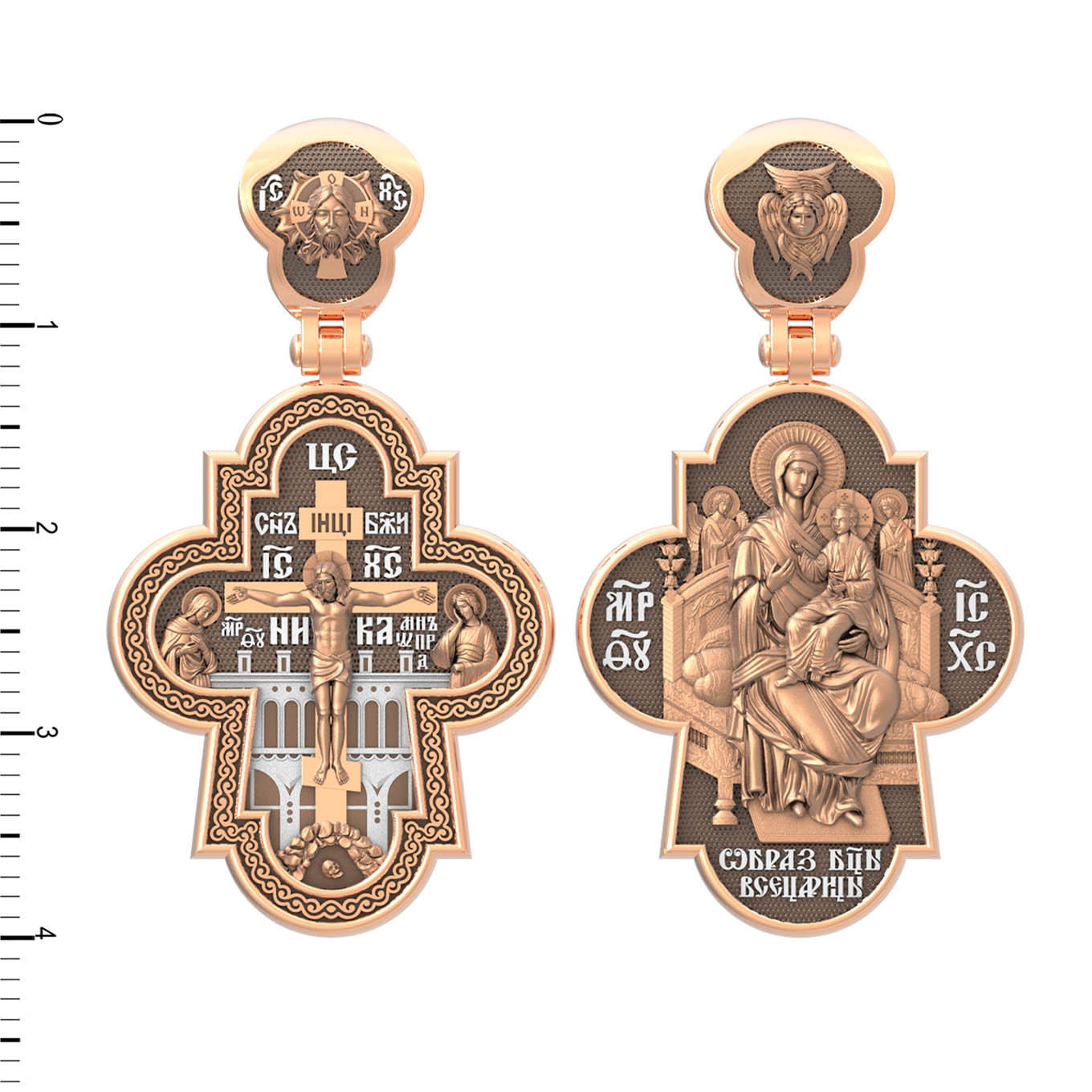 На оборотной стороне креста изображена икона Божией Матери «Всецарица» или «Пантанасса», на которой Пресвятая Богородица восседает на царском троне. На руках Ее — Богомладенец Христос со свитком в левой руке и благословляющий десницей. Правой рукой Богородица указывает на Своего Царственного Сына, как на Спасителя мира. Чудотворная икона была написана в XVII веке и находится на Святой Горе Афон, в одном из древних греческих монастырей — Ватопеде. По молитвам перед иконой совершается множество чудесных исцелений. Пречистая Богородица наставляет на праведный путь, помогает укрепить веру, найти утешение. На кулонном кольце изображен шестикрылый Серафим.
