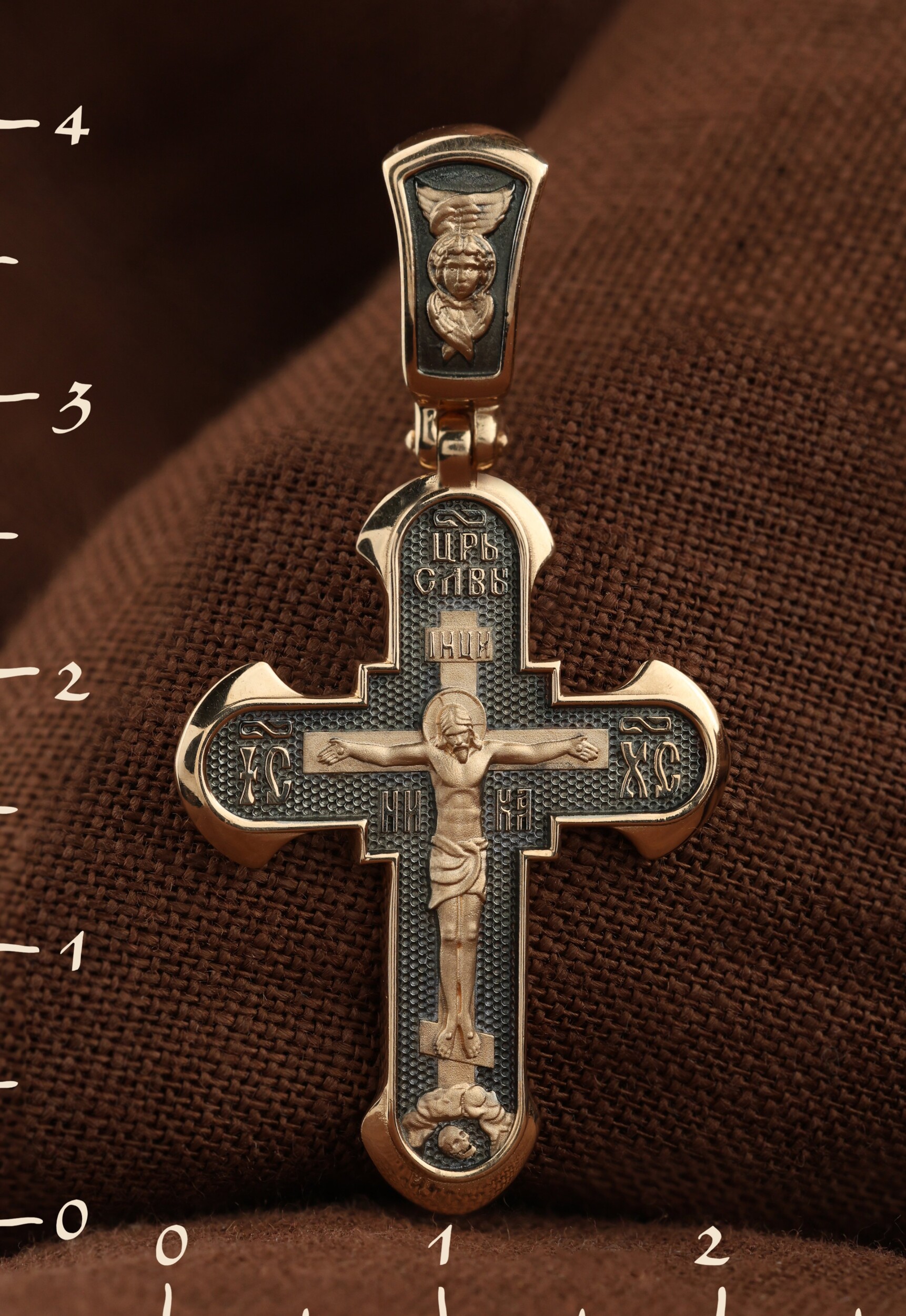 На лицевой стороне креста изображено Распятие Господа нашего Иисуса Христа. В традиции Православия — принято изображать Спасителя как Воскресшего Крестоносителя, призывающего в Свои объятия все концы мира. Его руки имеют горизонтальное положение, открытые ладони пробиты гвоздями, голова наклонена вправо, вокруг головы крестчатый нимб. Крест стоит на горе камней, символизирующих Голгофу, в основании которой различается череп. Это голова Адама. По преданию, тело Адама было погребено Симом, сыном Ноя, на месте, где впоследствии возникла гора Голгофа. Над головой Господа на поперечной перекладине аббревиатура «IНЦI», что символизирует табличку, которая была прибита к Кресту, с надписью «Иисус Назорей Царь Иудейский». Этим иудеи хотели посмеяться над Христом, не зная, что распинают истинного Царя всех царей. По бокам поперечной перекладины титлы святого имени Христа «IC» (Иисус) «ХС» (Христос), и слово «НИКА», что в переводе с греческого означает «победитель». Венчает лицевую сторону креста надпись «Царь Славы».