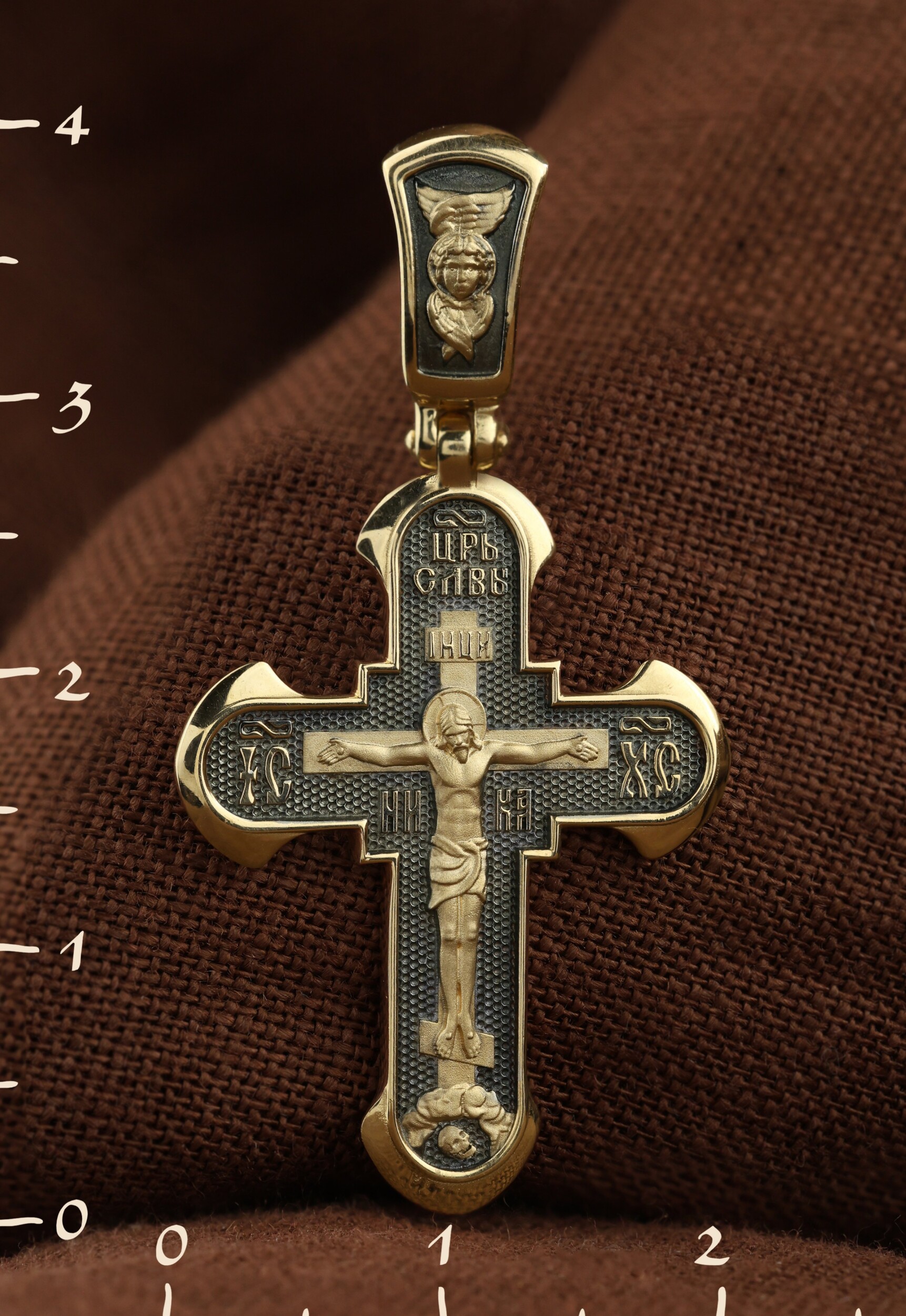 На лицевой стороне креста изображено Распятие Господа нашего Иисуса Христа. В традиции Православия — принято изображать Спасителя как Воскресшего Крестоносителя, призывающего в Свои объятия все концы мира. Его руки имеют горизонтальное положение, открытые ладони пробиты гвоздями, голова наклонена вправо, вокруг головы крестчатый нимб. Крест стоит на горе камней, символизирующих Голгофу, в основании которой различается череп. Это голова Адама. По преданию, тело Адама было погребено Симом, сыном Ноя, на месте, где впоследствии возникла гора Голгофа. Над головой Господа на поперечной перекладине аббревиатура «IНЦI», что символизирует табличку, которая была прибита к Кресту, с надписью «Иисус Назорей Царь Иудейский». Этим иудеи хотели посмеяться над Христом, не зная, что распинают истинного Царя всех царей. По бокам поперечной перекладины титлы святого имени Христа «IC» (Иисус) «ХС» (Христос), и слово «НИКА», что в переводе с греческого означает «победитель». Венчает лицевую сторону креста надпись «Царь Славы».