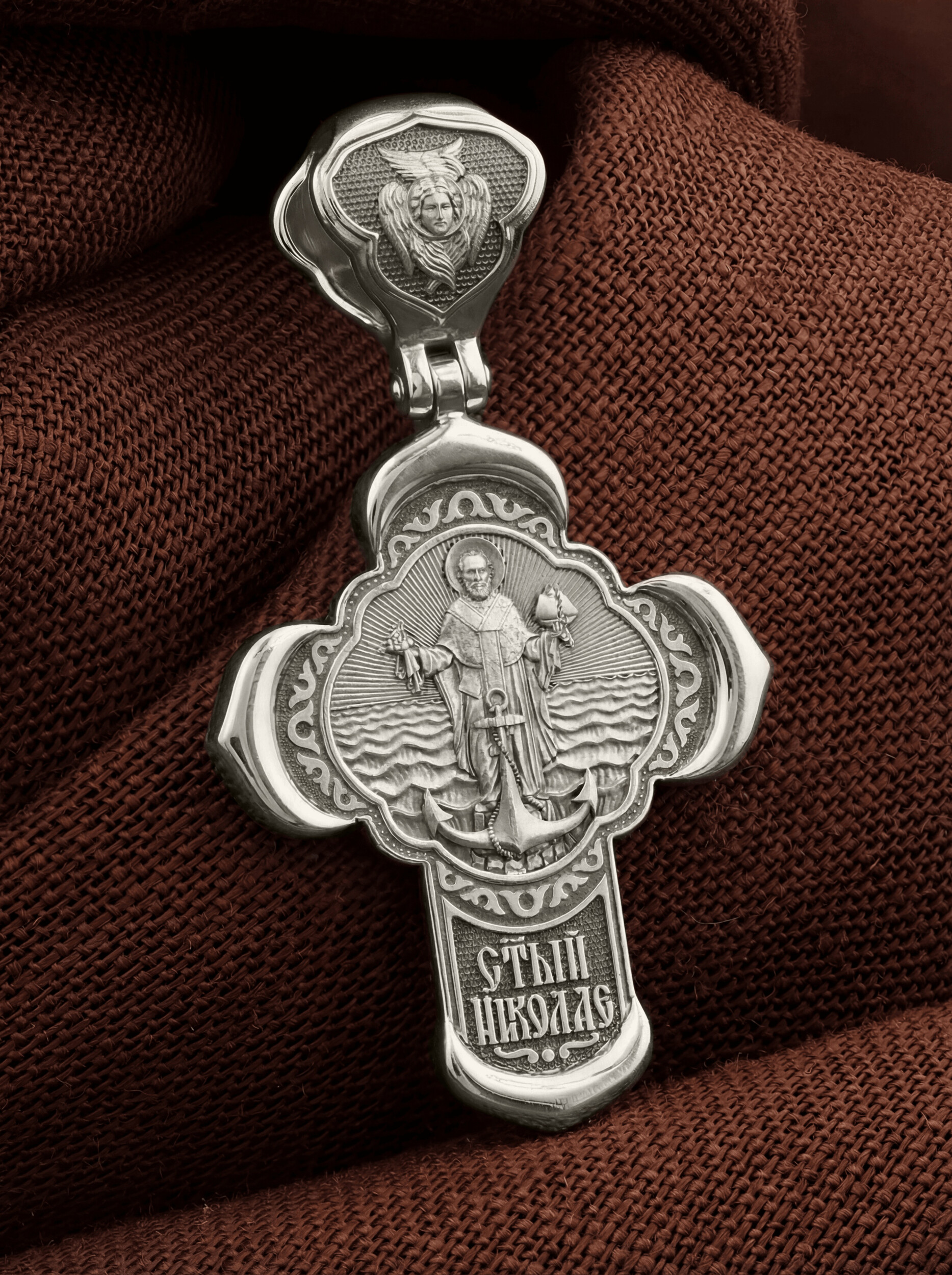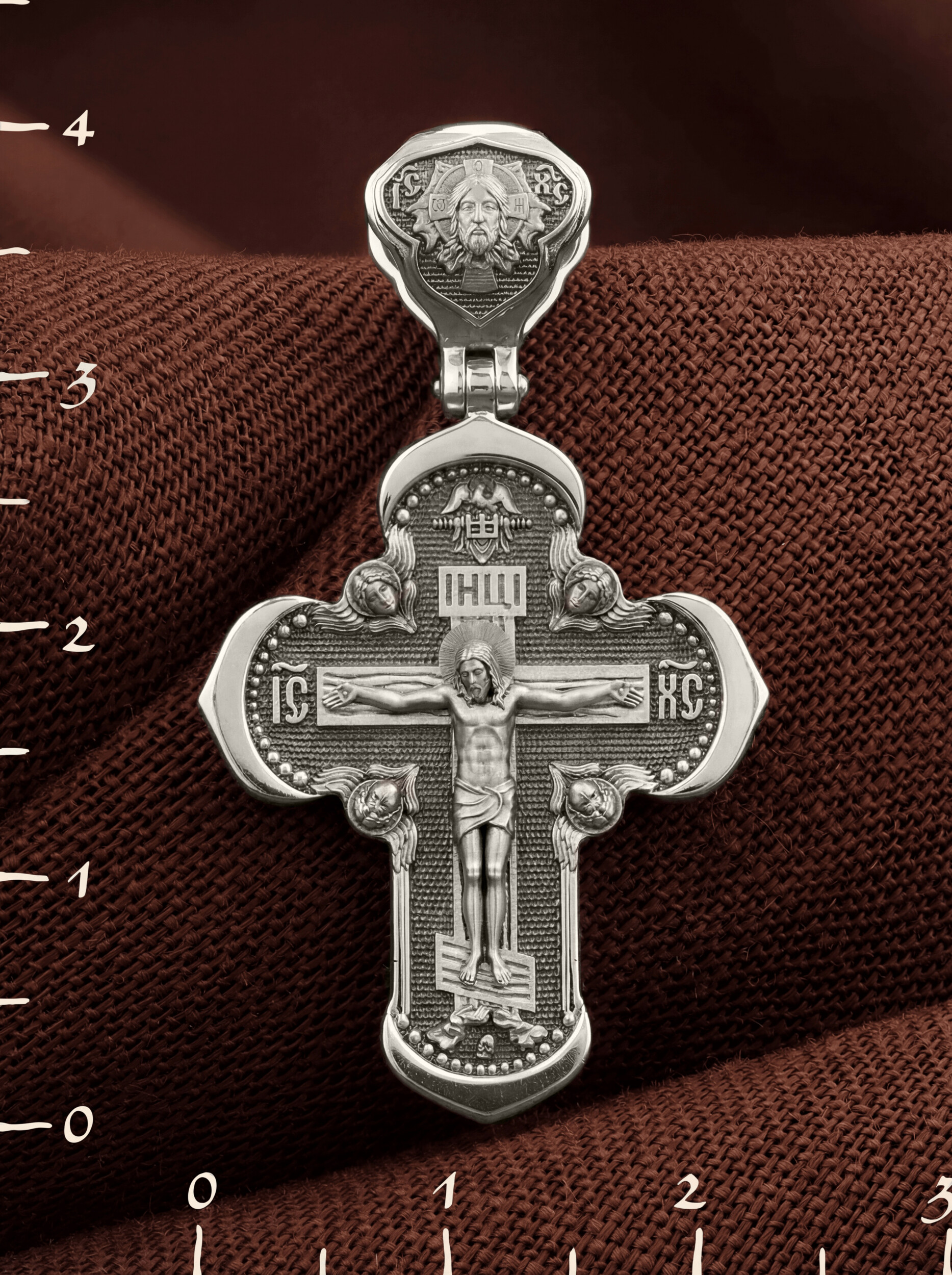 На лицевой стороне креста изображено Распятие Господа и Спасителя нашего Иисуса Христа, отдавшего Себя на смерть, для искупления грехов мира. Крест является символом жертвенной любви Всеблагого Бога к падшим людям, всепобеждающим духовным оружием христиан, основанием и средоточием церковной жизни. Господь сказал: «кто хочет идти за Мною, отвергнись себя, и возьми крест свой, и следуй за Мною». (Мк. 8: 34). На верхней табличке, выше головы Иисуса, расположена надпись, составленная Понтием Пилатом — «IНЦI». Она означает «Иисус Назорей, Царь Иудейский». Надпись «IC» «ХC», означает Иисус Христос, помещается на разных сторонах поперечной перекладины креста. Крест стоит на горе камней, символизирующих Голгофу. В ее основании различается череп– это голова Адама. На кулонном кольце изображен Нерукотворный образ Господа и Спасителя нашего Иисуса Христа, чудесно отпечатавшийся на плате, которым Христос вытер свой лик.