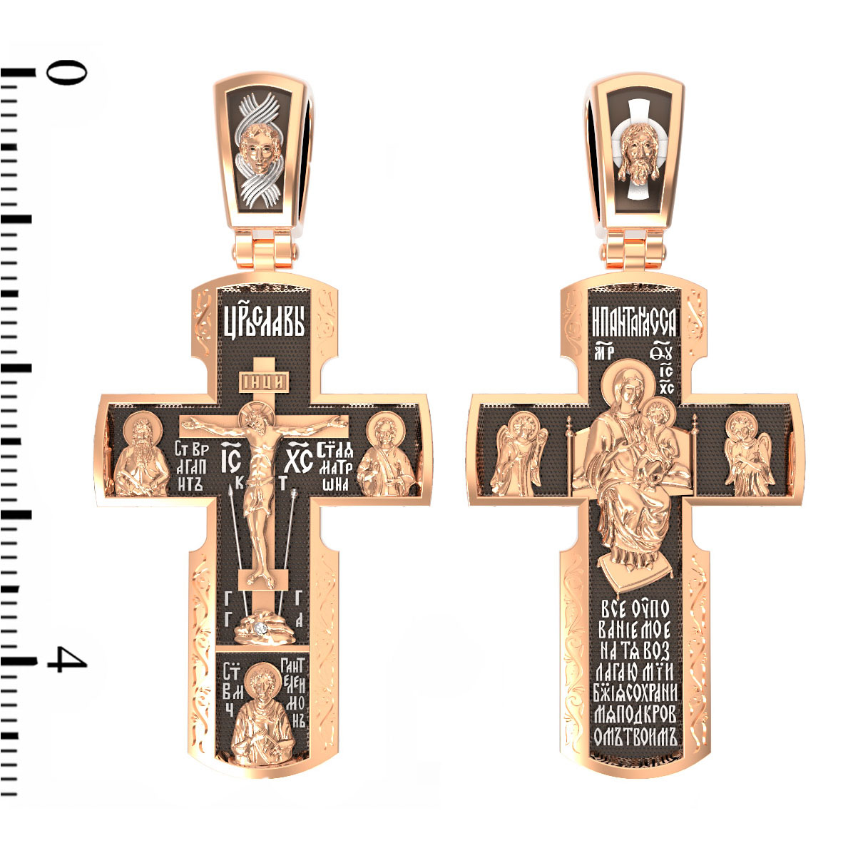 Как действенная помощь в немощах и болезнях был создан крест с образами святых целителей и со знаменитой афонской иконой Божией Матери «Всецарица». Над титлом видим слова «ЦРЬ СЛВЫ» — Царь Славы. Верхняя перекладина символизирует собой табличку с надписью «IHЦI» — Иисус Назарянин Царь Иудейский. Под перекладиной пишется сокращенно имя Спасителя «IC XC» — Иисус Христос. Возвышение, на котором стоит Крест, символизирует гору Голгофу, на которой произошло Распятие. У подножия Креста изображают прах Адама, обозначенный черепом. Справа от Распятия помещен образ прославленной святой блаженной Матроны. Слева — икона преподобный Агапита. Этот святой жил в пещерах Киево-Печерского монастыря в XI веке и бескорыстно врачевал мирян и монахов. У основания Креста Господня изображен великомученик Пантелеимон Целитель. Господь даровал удивительную силу его молитве. Ею он исцелял любые болезни и даже воскрешал умерших.