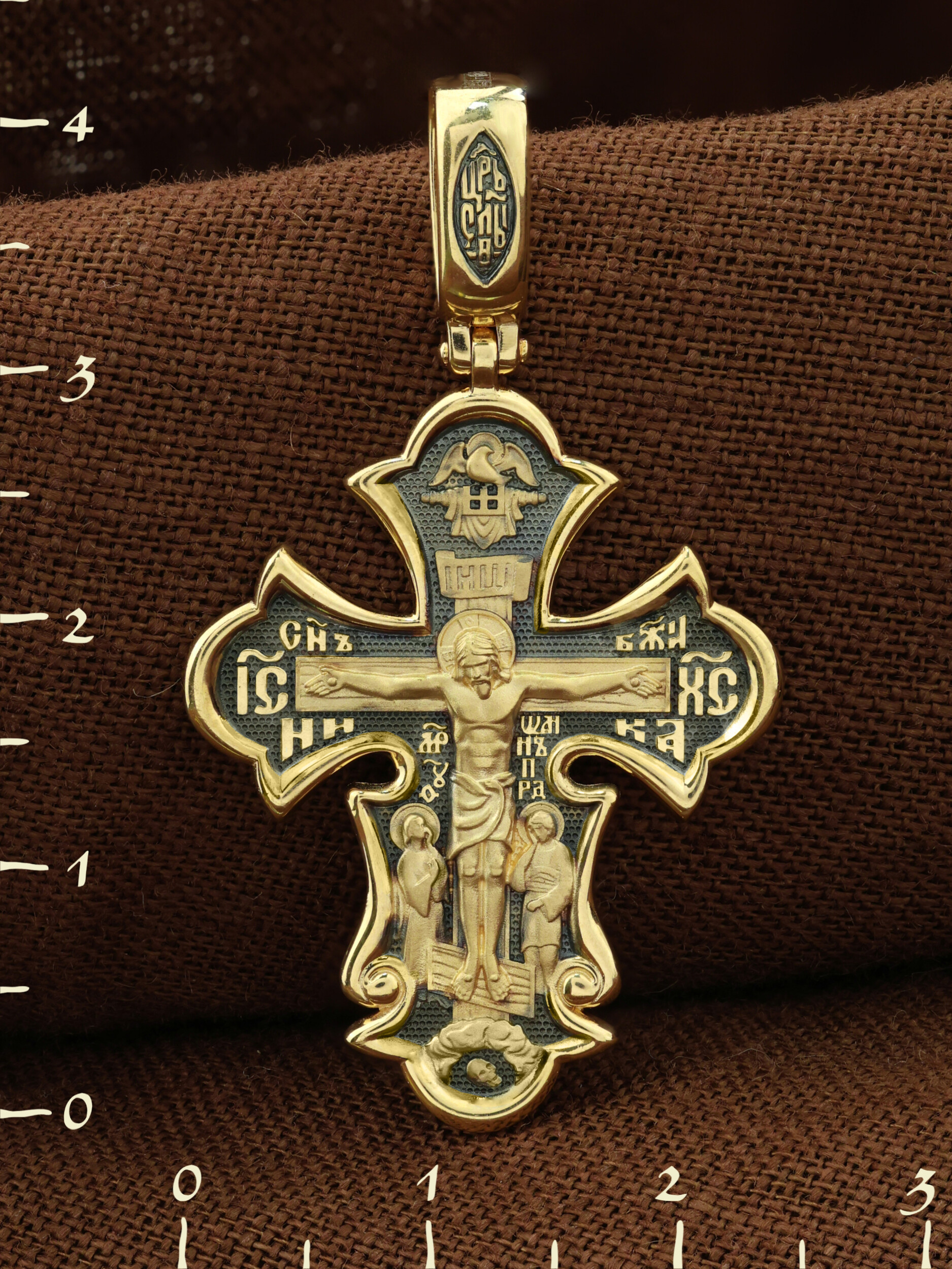 На лицевой стороне креста изображено Распятие Господа и Спасителя нашего Иисуса Христа, отдавшего Себя на смерть, для искупления грехов мира. Крест является символом жертвенной любви всеблагого Бога к падшим людям, всепобеждающим духовным оружием христиан, основанием и средоточием церковной жизни. Верхняя перекладина символизирует титло — табличку, на которой, согласно Евангелию, было начертано: Иисус Назорей Царь Иудейский (IНЦI). Также Распятие сопровождается надписями, олицетворяющими Христа. Надпись «IС» « ХС», что означает Иисус Христос, слово «НИКА», что означает «победитель» и слова «Сын Божий» помещается на разных сторонах поперечной перекладины креста. Над вершиной Распятия помещено изображение Святого Духа в виде голубя. Слева от Распятия изображена Пресвятая Богородица, справа — апостол и евангелист Иоанн Богослов, один из ближайших учеников Иисуса Христа. Возвышение, на котором стоит Крест, символизирует гору Голгофу, на которой произошло Распятие. Под подножием Креста изображена покоящаяся голова (череп) Адама. На кулонном кольце помещена надпись «Царь Славы».