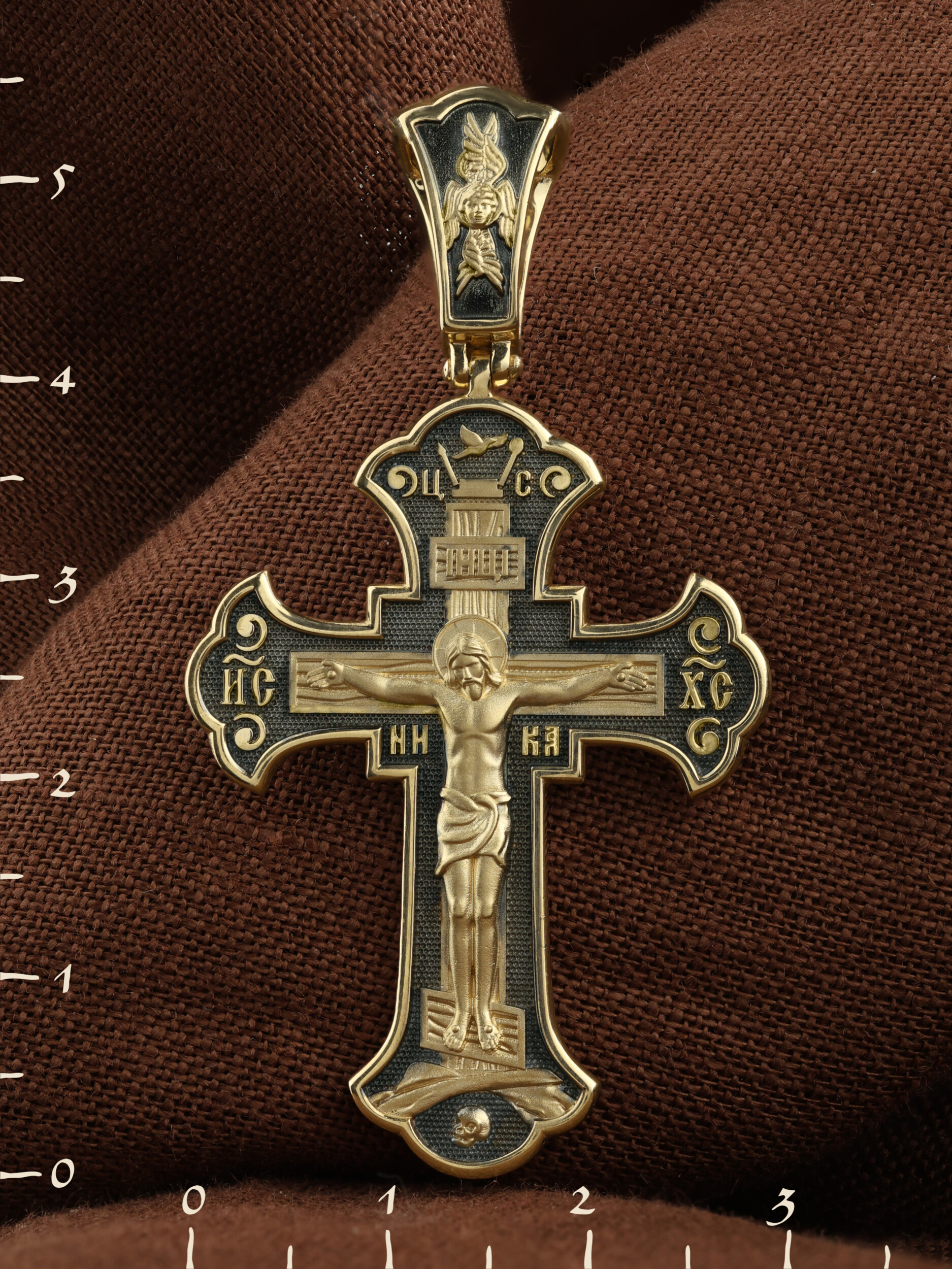 На лицевой стороне этого креста центральную часть занимает икона Распятия Христа — образ жертвы, принесенной Господом за грехи людей. Именно ко Христу, сошедшему на землю ради нашего спасения, возносятся все молитвы. Пресвятая Богородица, ангелы и святые — помощники Господа в деле спасения и заступники за людей перед Богом. «Оружием великим Христовым» именует Церковь крест, потому что, претерпев страдания и умерев, Господь победил смерть и лишил дьявола его власти над миром. Поэтому рядом с титлами Святого имени Христа написано «НИКА», что значит «победитель».