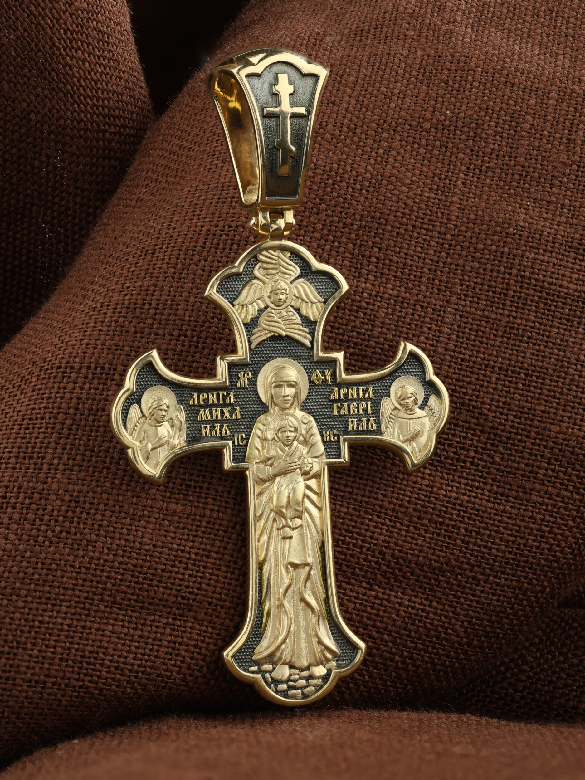 На обратной стороне креста в полный рост изображена Валаамская икона Божией Матери, над которой раскрыл свои крылья серафим. Этот образ написал в 1878 году иеромонах Валаамского монастыря о. Алипий. Валаамскую икону прославили многие чудеса, ее считают целительницей при разных недугах. Перед этим образом Богородицу молят в первую очередь об укреплении веры, просят даровать смирение, твердость в соблюдении заповедей Христовых и об исцелении. Богородице предстоят два архангела, Михаил и Гавриил.