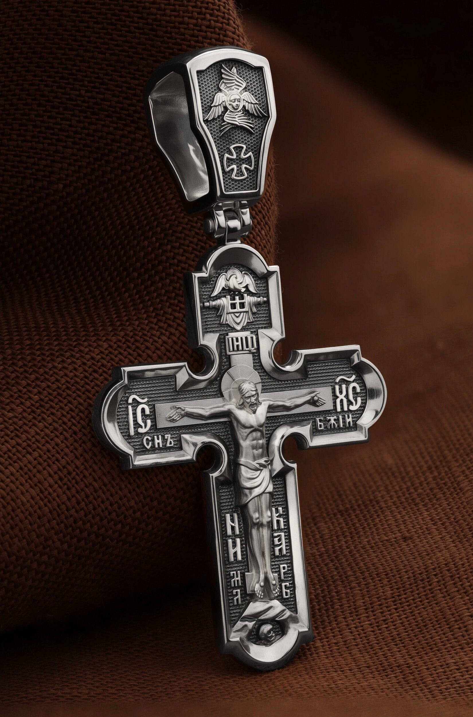 На лицевой стороне креста изображено Распятие Господа и Спасителя нашего Иисуса Христа. Крест- символ спасения и искупления рода человеческого, знамение победы над смертью и адом. Иисус Христос, как искупительная жертва освобождения человечества от власти греха, умер крестной смертью и в третий день воскрес. Верхняя перекладина символизирует титло — табличку, на которой, согласно Евангелию, было начертано: Иисус Назорей Царь Иудейский (IНЦI). Надпись «IC» «ХC», означает Иисус Христос, помещается на разных сторонах поперечной перекладины креста. Ниже перекладины расположено словосочетание «СЫН БОЖИЙ», что означает божественную природу Иисуса Христа. Надпись «МЛРБ» — «место лобное рай бысть» означает, что место лобное стало раем и помещаются в нижней части креста. Рядом — слово «НИКА», что означает «победитель». Возвышение, на котором стоит Крест, символизирует гору Голгофу, на которой произошло Распятие. Под подножием Креста изображена покоящаяся голова (череп) Адама. На кулонном кольце изображен шестикрылый Серафим.
