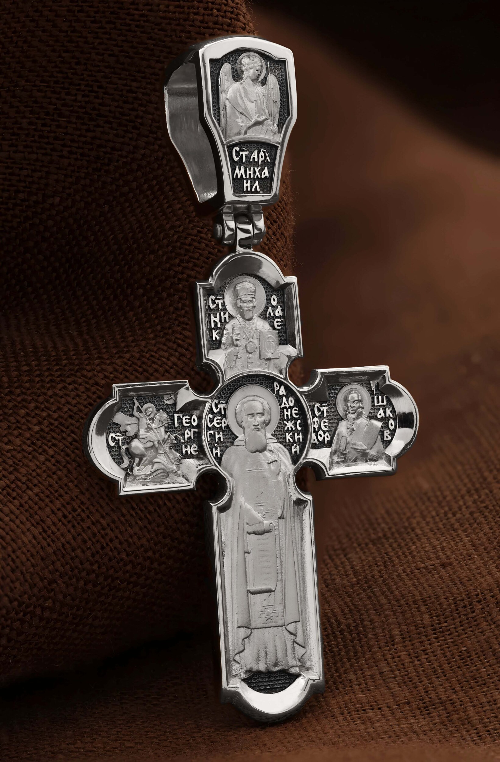 На центральной части оборотной стороны креста размещен образ Святого Преподобного Сергия, игумена Радонежского, Чудотворца. Он является духовным собирателем русского народа и русской культуры, основателем целого ряда монастырей, в том числе Троице-Сергиевой лавры под Москвой. Выше образа изображен Святитель Николай Чудотворец, архиепископ Мир Ликийских. Он является одним из самых почитаемых святых в православном мире, издревле считающийся помощником и молитвенником за всех, притекающих к нему. Слева — образ Святого Великомученика Георгия Победоносца. Он изображен как воитель, сидящий на вздыбленном коне и поражающий копьем огнедышащего змея. Змей символизирует собою сатанинские силы. Справа — образ Святого Праведного воина Феодора Ушакова. Он является выдающийся русским флотоводцем. Федор Ушаков сочетал свой высокий воинский чин с глубоким смирением, неподдельной скромностью и искренней верой. На кулонном кольце изображен образ Архангела Михаила.