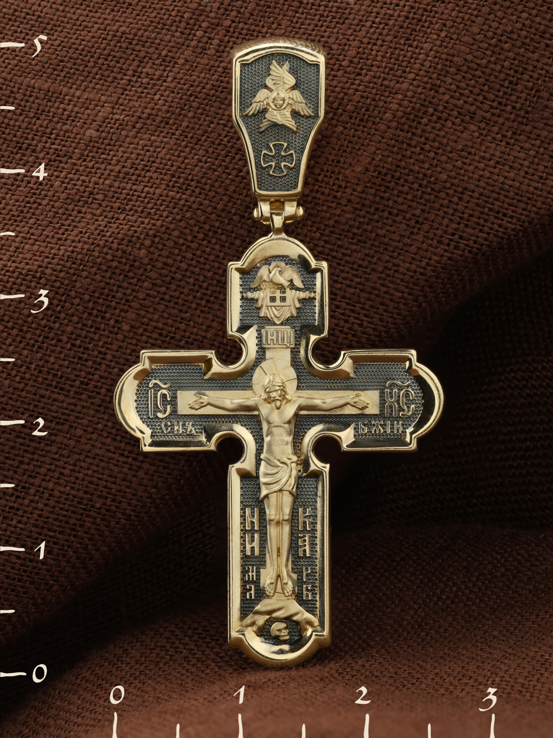 На лицевой стороне креста изображено Распятие Господа и Спасителя нашего Иисуса Христа. Христос, подвергнутый на кресте мучительной казни, своими страданиями искупил нас от древнего греха и даровал нам жизнь вечную. Без Распятия не было бы Воскресения Христова, и поэтому Крест из орудия казни обратился в святыню, в которой действует Благодать Божия. Над Распятием изображен Дух Святой в виде голубя, сходящего с Небес. Распятие сопровождается каноническими надписями. На верхней табличке, выше головы Иисуса, расположена надпись, составленная Понтием Пилатом на трех языках — «IНЦI». Она означает «Иисус Назорей, Царь Иудейский». Надпись «IС ХС» означает Иисус Христос и помещается на разных сторонах поперечной (большой) перекладины креста. Ниже — словосочетание «СЫН БОЖИЙ», что означает божественную природу Иисуса Христа. Крест стоит на горе камней, символизирующих Голгофу. В ее основании различается череп — это голова Адама. Надписи «Ника», что означает Победитель, и надпись «МЛРБ» — «место лобное рай бысть», что означает место лобное стало раем, размещены в нижней части креста. На кулонном кольце изображен шестикрылый Серафим.