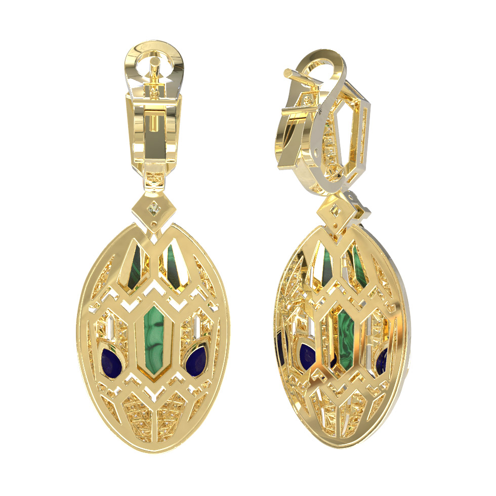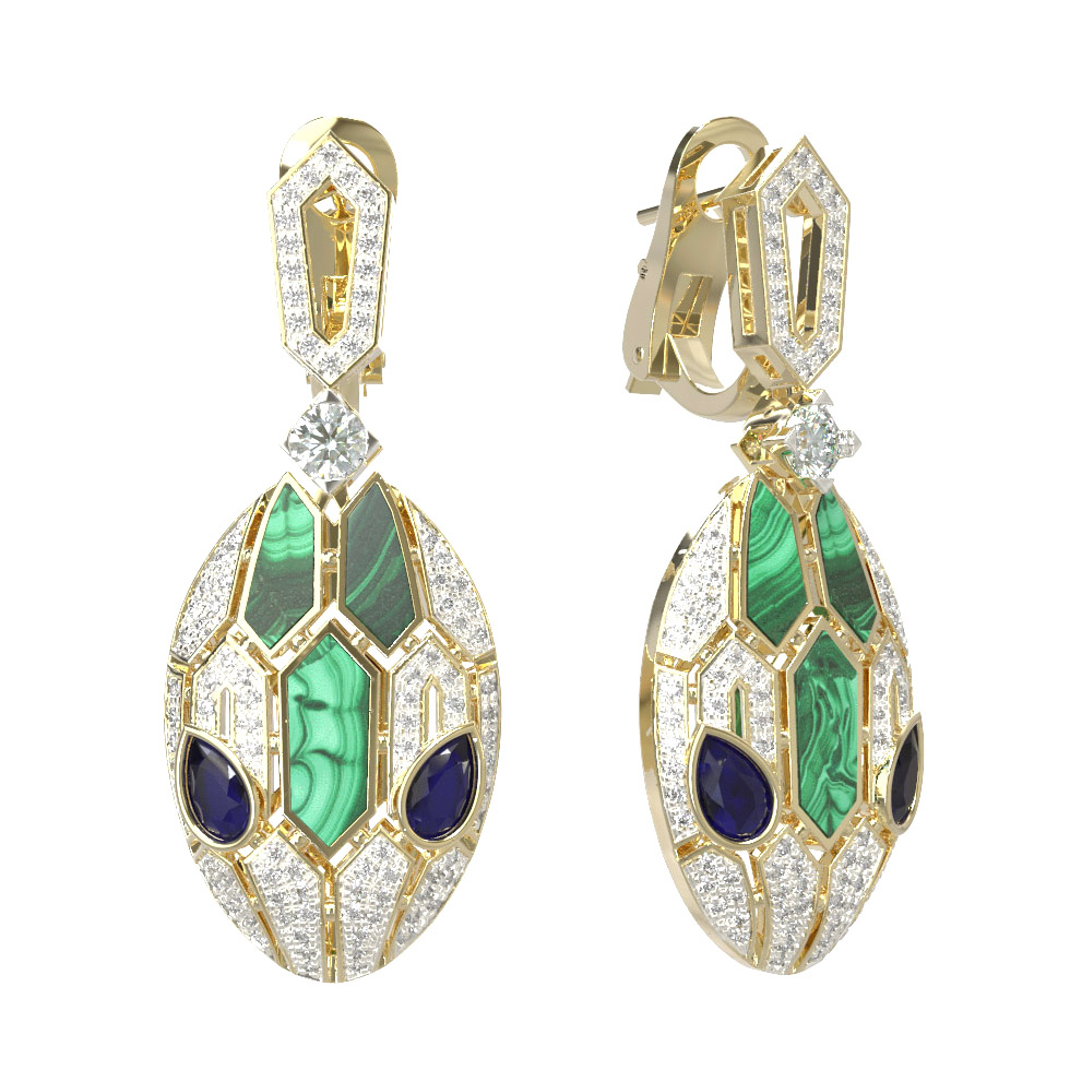 Серьги из лимонного золота c бриллиантами, сапфиром и малахитом
