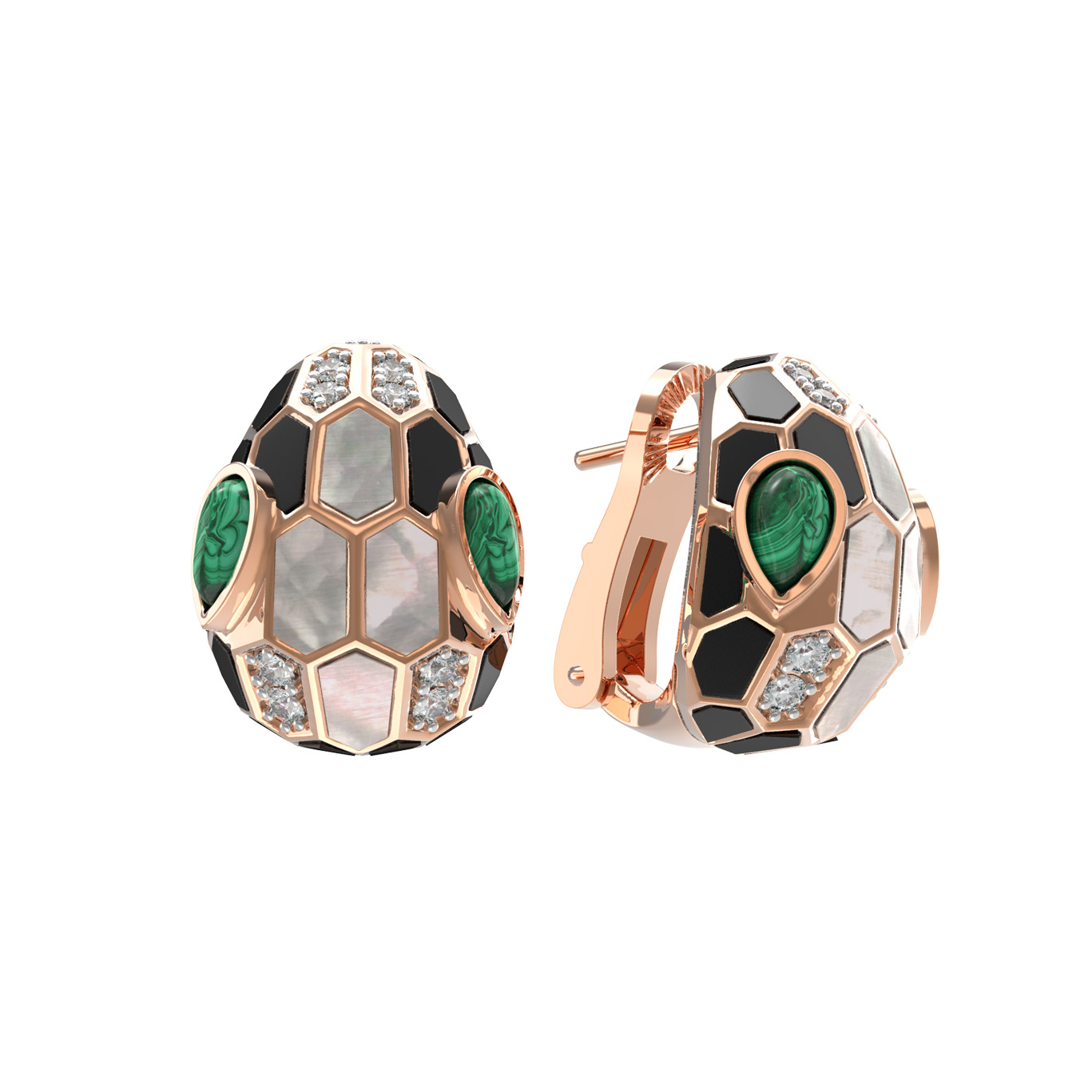 Серьги из золота c бриллиантами, рубином, ониксом, малахитом и перламутром