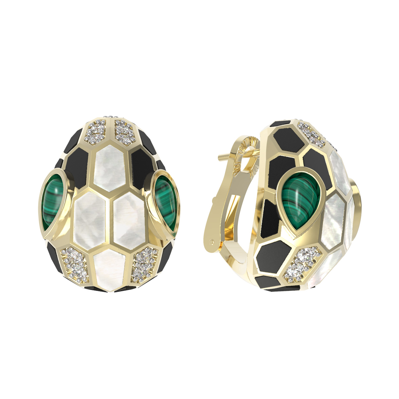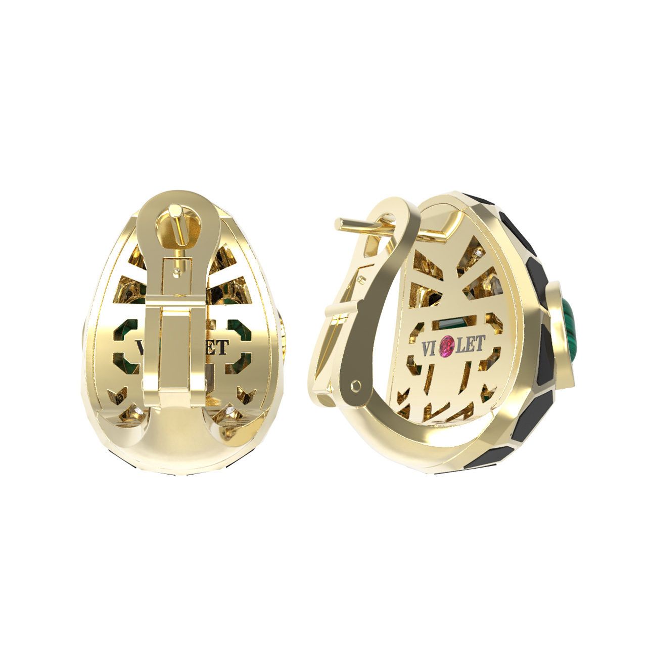 Серьги из лимонного золота c бриллиантами, рубином, ониксом, малахитом и перламутром