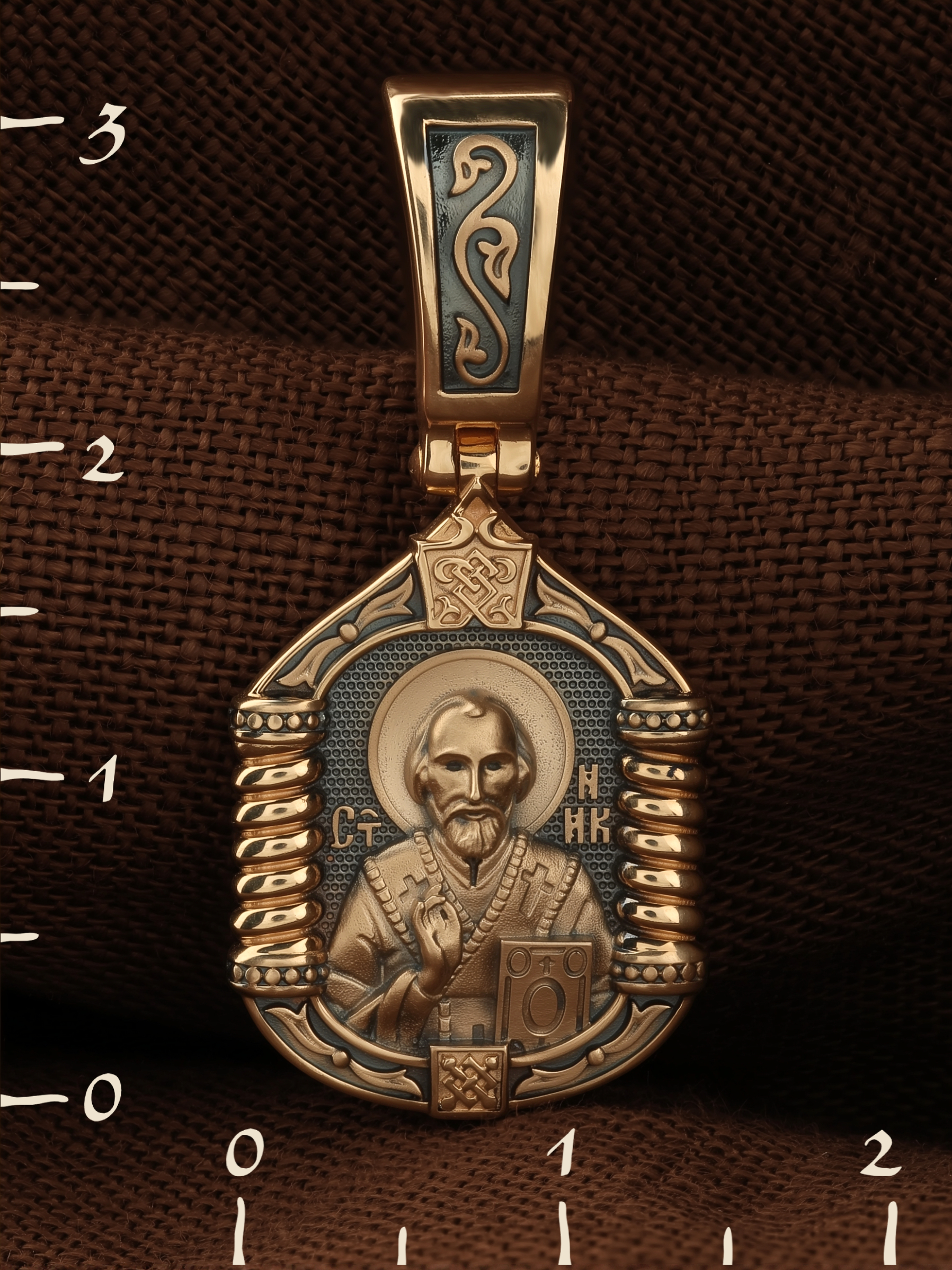 На лицевой стороне образка изображен Святитель Николай архиепископ Мир Ликийских, Чудотворец. Он является одним из самых почитаемых святых в православном мире. Святитель Николай родился во второй половине III века в Малой Азии в Ликийском городе Патары. С рождения Божий Угодник проявлял необыкновенные дарования. Сохранилось Предание, что во время крещения он, никем не поддерживаемый, простоял в купели три часа. Приняв сан священника, святитель Николай стал проводить еще более строгую подвижническую жизнь. Избранник Божий Николай стал вершиной всех добродетелей, поднятой до райской высоты. С кем из величайших праведников не сравнялся он образом духовной красоты, кому из них не последовал в своих деяниях и чудотворениях? Вся жизнь святого Николая — это служение Богу. Много великих и преславных чудес сотворил великий Святитель Николай Угодник. Он помогал сущим в бедах, укрощал штормы, спасал от потопления и выносил на сушу из глубины морской, освобождал из плена и приносил освобожденных домой, избавлял от уз и темницы, защищал от посечения мечом, освобождал от смерти и подавал многим различные исцеления, слепым прозрение, хромым хождение, глухим слух, немым дар слова.