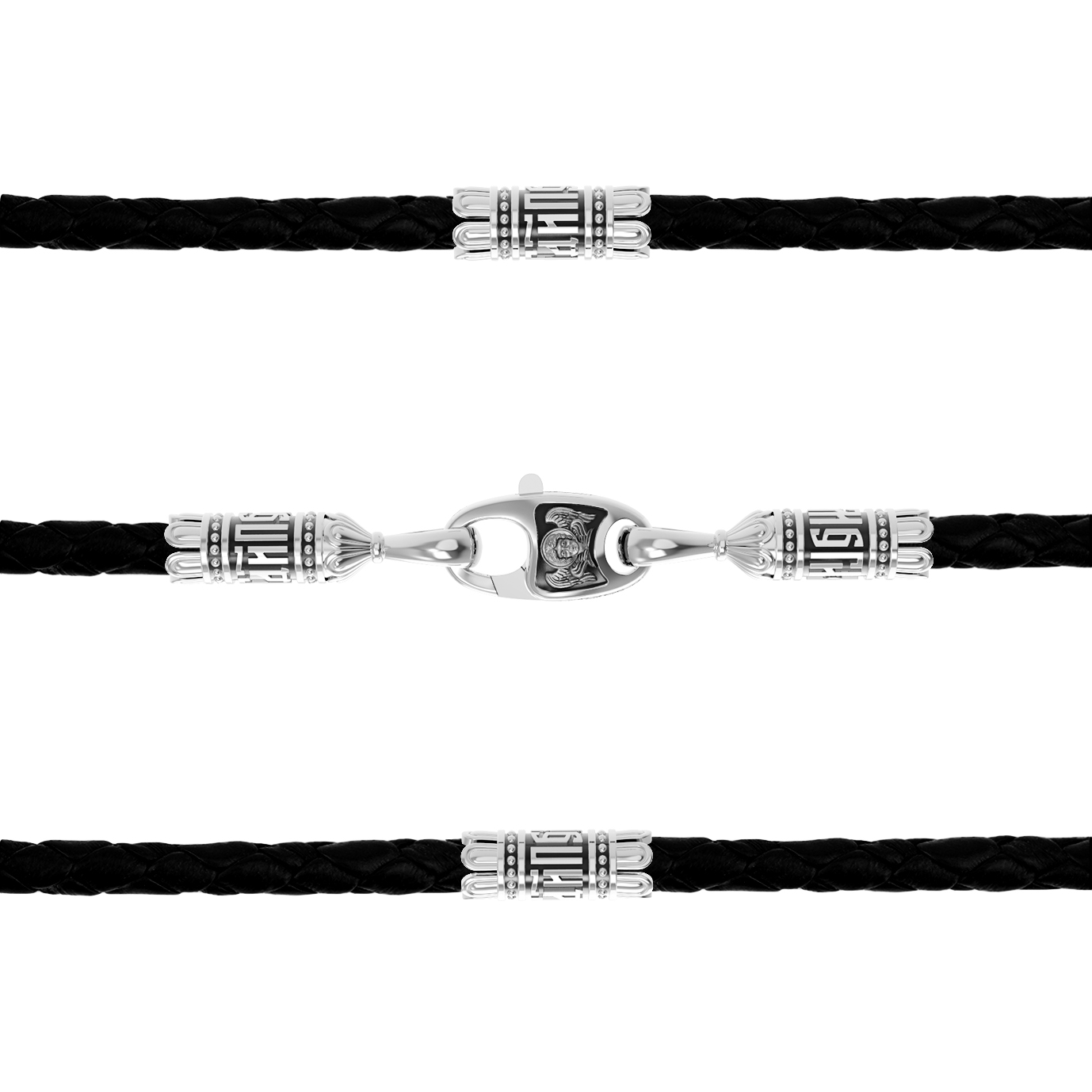 На шнурке цепи-шнурка расположены вставки, а на концах концевики с надписью: «Спаси и сохрани». Соединяет концевики замочек-карабин в форме рыбки. На замочке изображен шестикрылый Серафим.