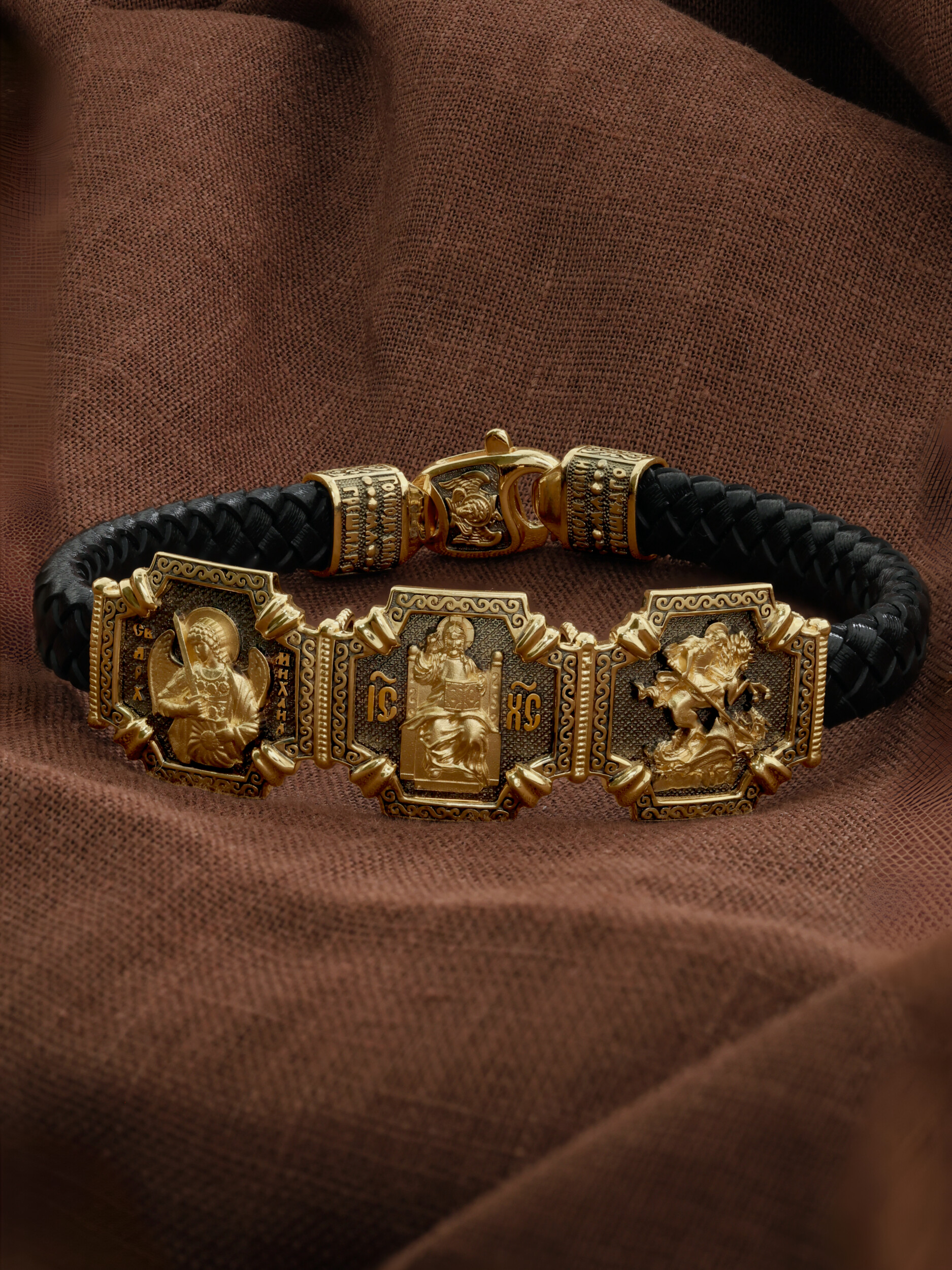 Композиционным центром браслета является Иисус Христос в образе Вседержителя, по-гречески «Пантократор». Это древнейший образ Спасителя, на котором Он представлен как властелин и правитель мира. Христос держит в руках Книгу, которая символизирует Книгу Бытия, то есть весь сотворенный Богом мир. В этой Книге судьбы всех людей, живущих на земле. Слева от образа Вседержителя — икона Архангела Михаила — Архистратига всех Небесных Воинств. Он ведет непримиримую войну против сил зла, охраняет райские врата и защищает души людей. Его имя означает «Кто яко Бог?», так как он самый могучий и грозный враг зла. Он первым ополчился на Денницу, когда тот восстал против Бога, низверг его с Неба и не перестает сражаться с его темным воинством. Поэтому он часто изображается в виде воина, в доспехах и с огненным мечом. Справа от образа Вседержителя — Великомученик Георгий Победоносец. Образ Великомученика считают одним из наиболее чтимых святынь в Святыни Православных, он олицетворяет собой заступника для верующих, чья жизнь имеет какое-либо отношение к военным делам, также он может оберегать и землевладельцев. Одно из самых великих чудес которое сотворил Великомученик так это — спасения всего города от устрашающего змия. Молитвами и своей непреклонной верой, взываемой к Всевышнему, он смог одолеть чудовище. Святой убил змея, спас жителей и их души от влияния дьявола, породив в них надежду и веру в Господа, призывая людей принять христианскую веру. Поскольку при жизни Святой Георгий был военным, он считается покровителем всех, кто имеет отношение к армии — военнослужащим, участникам боевых действий. Молитва перед иконой Георгия Победоносца поможет защититься от врагов, одержать победу в сражении (военном, спортивном, духовной брани с дьяволом), содействие в установлении мир