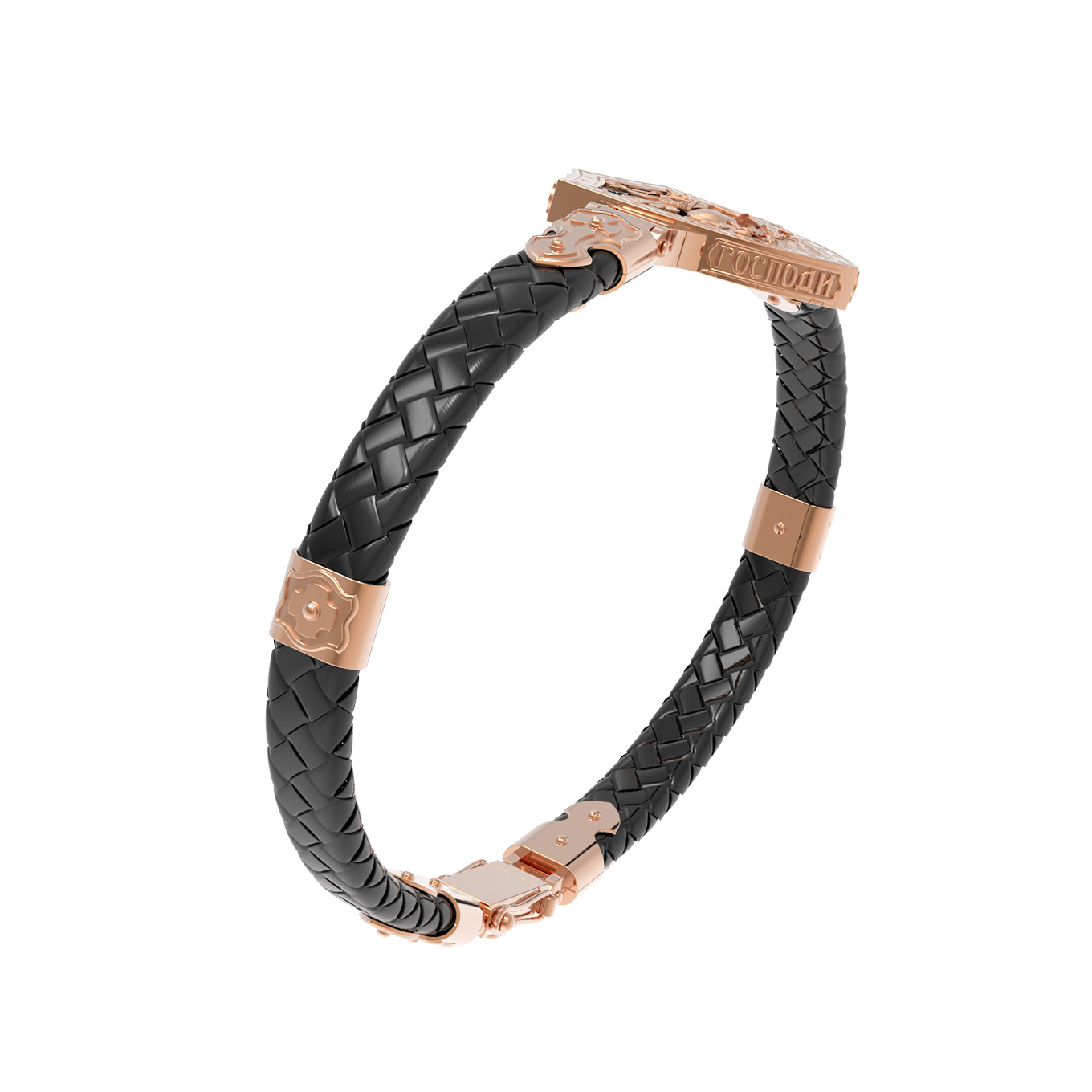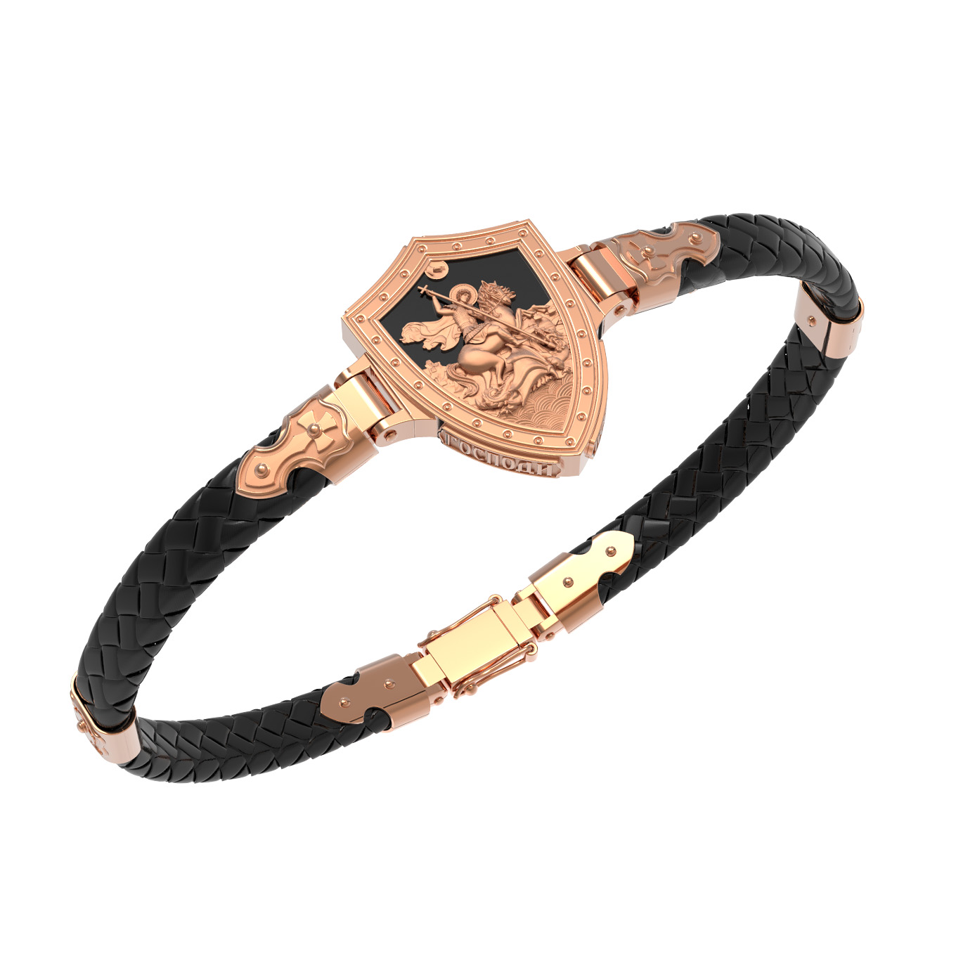 Основой композиции лицевой стороны браслета является изображение Святого Великомученика Георгия Победоносца — одного из самых почитаемых и удивительных святых. Георгий родился в Каппадокии (Малая Азия) в семье богатых и знатных горожан. Юношей поступил на службу к римскому императору Диоклетиану, за отличное знание военного дела и проявленную в боях и походах храбрость был приближен к императору и удостоен высокого воинского звания. Во время начавшихся гонений на христиан, перешел на сторону гонимых и, отвергнув человеческий страх, стал ярым проповедником учения Христа. Мучители подвергли опального воеводу жесточайшим восьмидневным пыткам и казнили его (обезглавили) в возрасте около тридцати лет в 303 году. На Руси он известен как Юрий или Егорий, заступник для верующих, чья жизнь имеет какое-либо отношение к военным делам, помощник в крестьянском труде. Браслет сделан в виде воинского щита. На нем Георгий изображен как воитель, сидящий на вздыбленном коне и поражающий копьем огнедышащего змея. Над образом изображена благословляющая Божия десница. Змей символизирует собою сатанинские силы. Молитвами вознесенными к Всевышнему и своей непреклонной верой он смог одолеть чудовище. Святой убил змея, спас царскую дочь, принесенную в жертву, и жителей города, их души от влияния дьявола, породив в них надежду и веру в Господа, призывая людей принять христианскую веру. На торце изделия помещена молитва: «Господи, помилуй мя грешного».