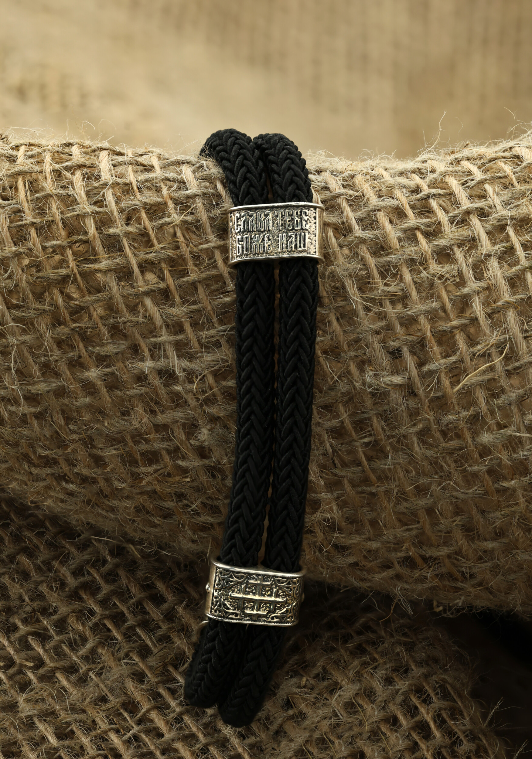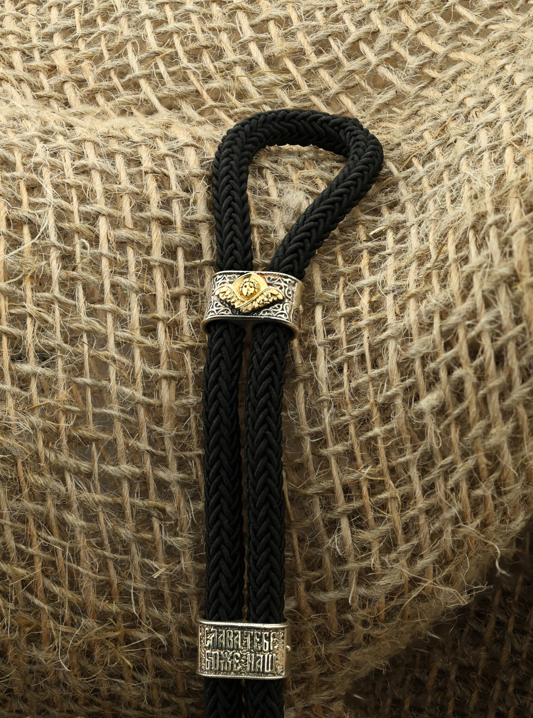 Браслет из серебра и золота c ониксом и шёлковым шнурком