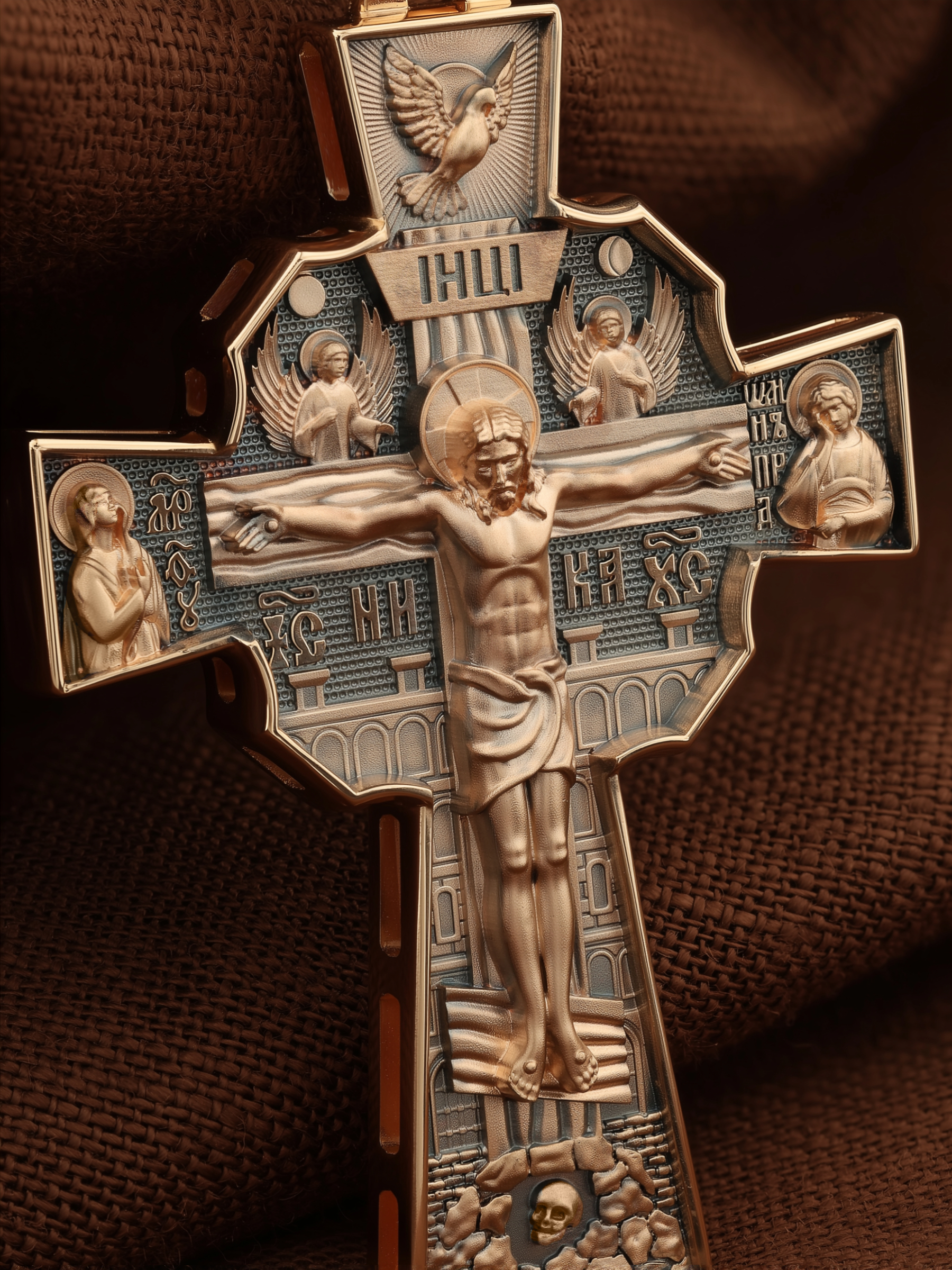Над Распятием изображен парящий голубь — символ Святого Духа и Его благодати. На кулонном кольце изображен шестикрылый Серафим — самый приближенный к Господу Ангел.