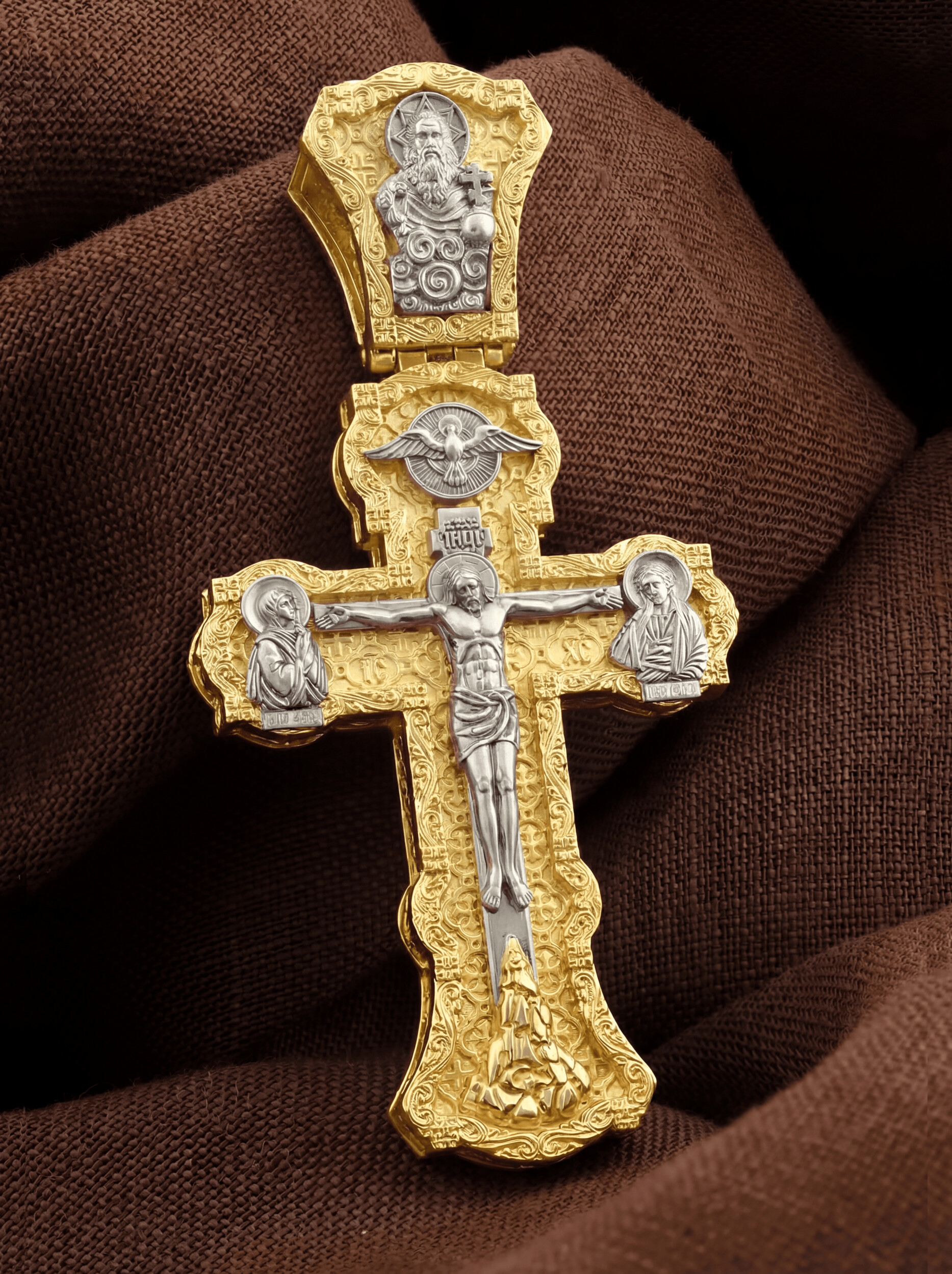 На лицевой стороне креста изображено Распятие Господа и Спасителя нашего Иисуса Христа. Христос, подвергнутый на кресте мучительной казни, своими страданиями искупил нас от древнего греха и даровал нам жизнь вечную. Без Распятия не было бы Воскресения Христова, и поэтому Крест из орудия казни обратился в святыню, в которой действует Благодать Божия. На верхней табличке, выше головы Иисуса, расположена надпись, составленная Понтием Пилатом на трех языках — «IНЦI». Она означает «Иисус Назорей, Царь Иудейский». Надпись «IС ХС» означает Иисус Христос и помещается на разных сторонах поперечной (большой) перекладины креста. Крест стоит на горе камней, символизирующих Голгофу. В ее основании различается череп– это голова Адама. У Креста стоят оплакивающие Господа Божия Матерь и апостол Иоанн Богослов. Из всех апостолов об одном лишь Иоанне Богослове говорится, что он стоял на Голгофе у креста Спасителя, не заботясь о собственной безопасности. Он услышал обращенные к Ней с высоты Креста слова Распятого Господа: «Жено, се сын Твой» и к нему: «Се Мати твоя». С этого времени Иоанн взял Матерь Божию к себе, и Она жила в его доме до самой смерти. Над Распятием — изображение Духа Святого в виде голубя, сходящего с Небес. На кулонном кольце изображен Бог Отец.