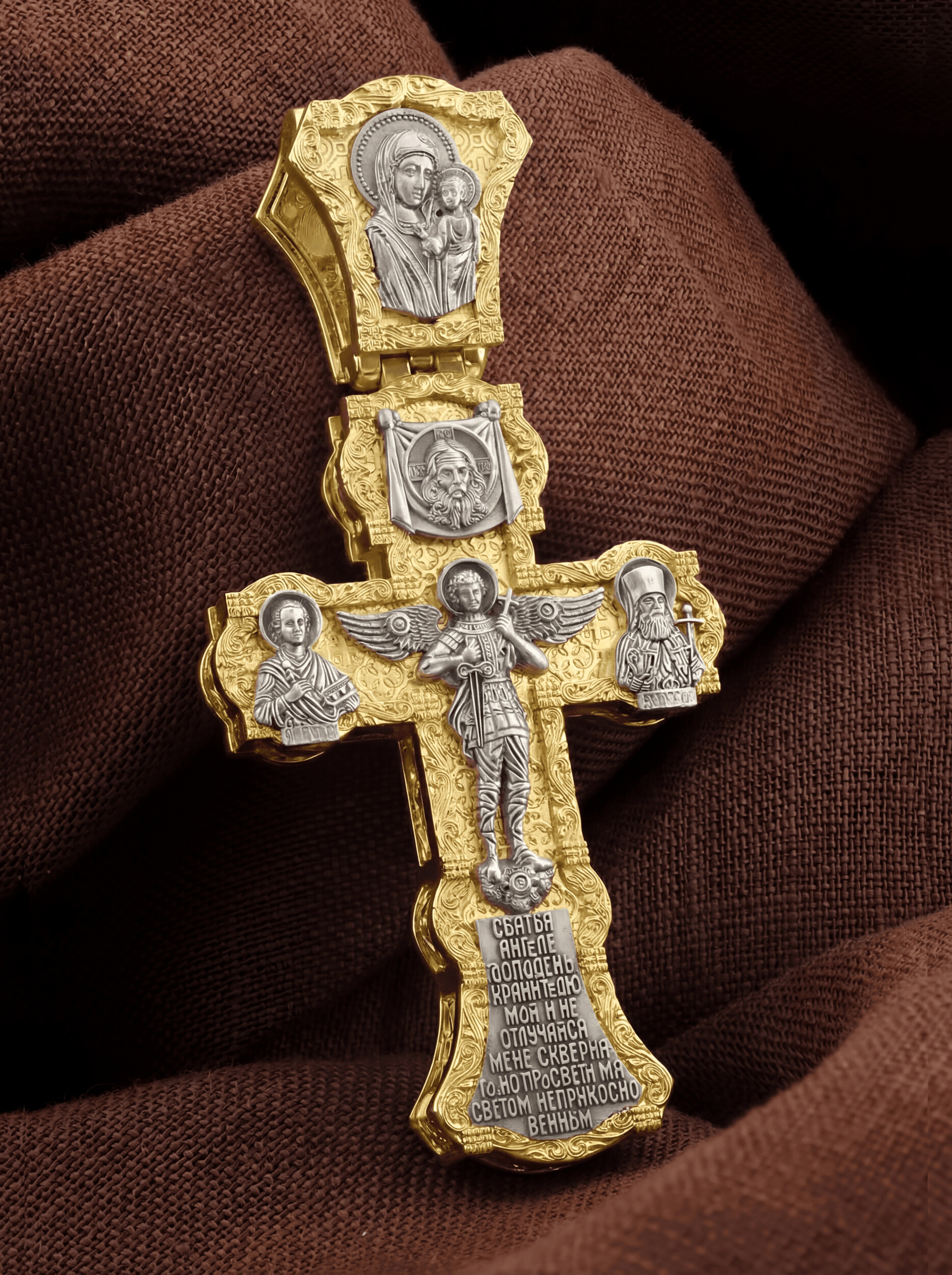 В центральной части оборотной стороны креста изображен Святой Ангел-Хранитель в виде прекрасного юноши держащего в правой руке меч, а в левой — крест. Ангел-Хранитель — это Ангел приставляемый Богом к человеку при крещении для охраны и помощи в добрых делах. Невидимо пребывая при нас постоянно, он наставляет нас на все доброе и полезное, охраняют и защищают нас от врагов видимых и невидимых, ходатайствует за нас пред Богом. Ниже образа помещена молитва: «Святый Ангел Господень Хранитель мой, и не отлучайся от Меня скверного, но просвети меня светом неприкосновенным.» Выше образа изображен Спас Нерукотворный — образ Господа и Спасителя нашего Иисуса Христа, чудесно отпечатавшийся на плате, котором Христос вытер свой лик. Слева — Святой великомученик и целитель Пантелеи¬мон. Господь даровал удивительную силу его молитве. Ею он исцелял любые болезни, воскрешал мертвых. Справа помещен образ Святителя Луки (Войно-Ясенецкого), русского святителя, исповедника, духовного писателя, доктора богословия, а также выдающегося ученого. На кулонном кольце изображена Казанская икона Божией Матери — одна из самых любимых на Руси.