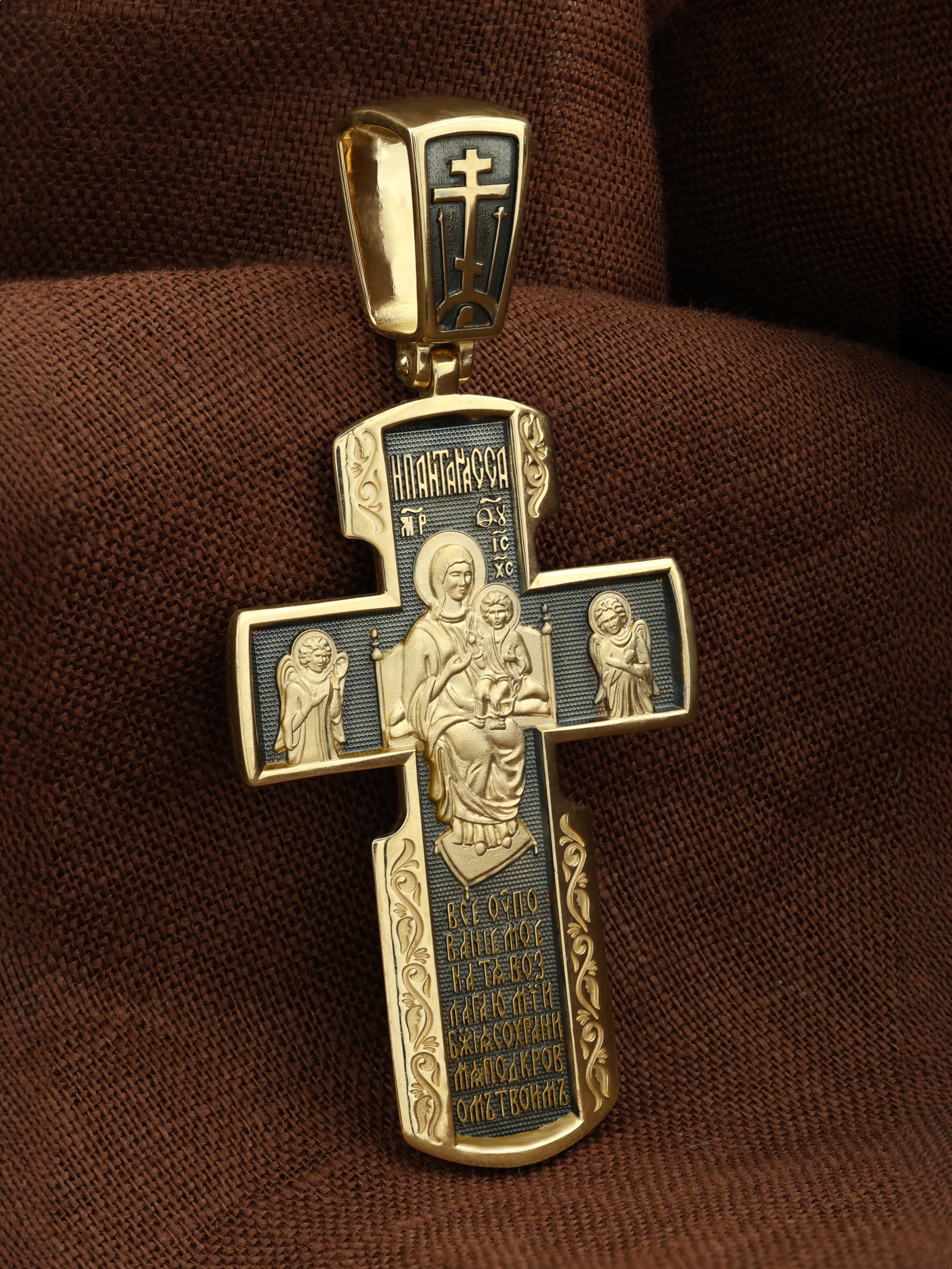Внизу креста написана молитва обращенная к Божией Матери «Все упование мое на Тя возлагаю, Мати Божия, сохрани мя под кровом Твоим».