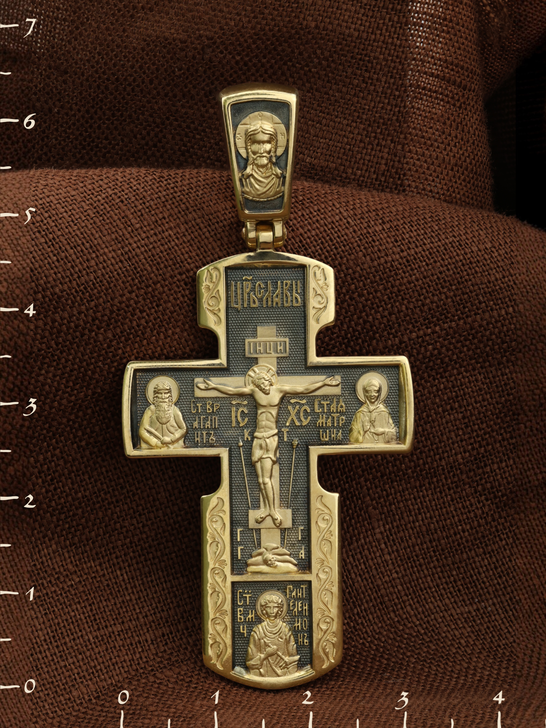 На лицевой стороне креста изображено Распятие Иисуса Христа на Голгофском Кресте. Над титлом видим слова «ЦРЬ СЛВЫ» — Царь Славы. Верхняя перекладина символизирует собой табличку с надписью «IHЦI» — Иисус Назарянин Царь Иудейский. Над перекладиной пишется сокращенно имя Спасителя «IC XC» — Иисус Христос, ниже перекладины добавляется: «НИКА» (греч. — Победитель). Возвышение, на котором стоит Крест, символизирует гору Голгофу, на которой произошло Распятие. У подножия Креста изображают прах Адама, обозначенный черепом.. Справа от Распятия помещен образ прославленной святой блаженной Матроны. «Матронушка», — ласково называют эту святую православные за удивительную любовь и помощь, которую она подает всем нуждающимся в ее поддержке. Слева — икона прп. Агапита. Этот святой жил в пещерах Киево-Печерского монастыря в XI веке и бескорыстно врачевал мирян и монахов.