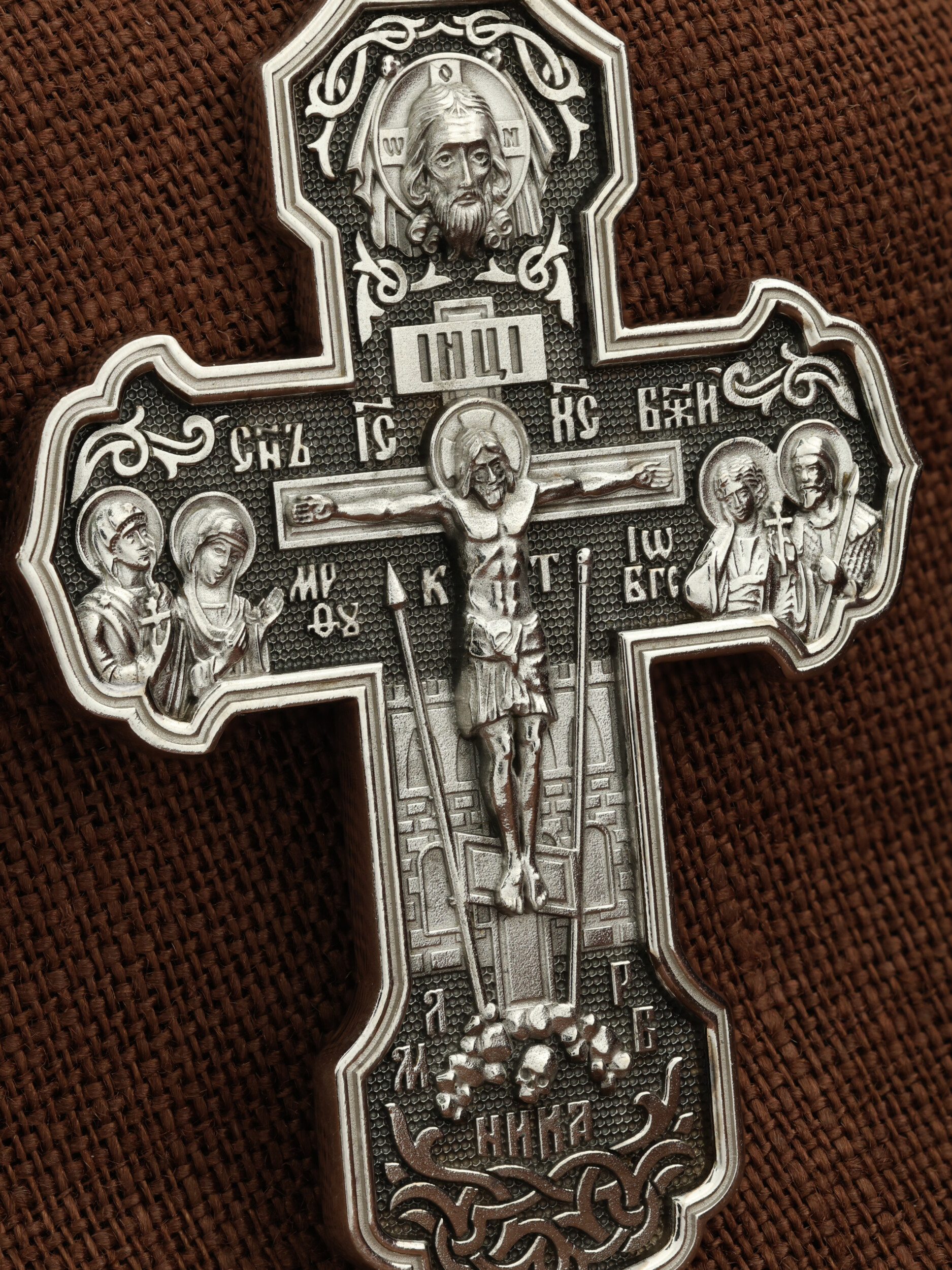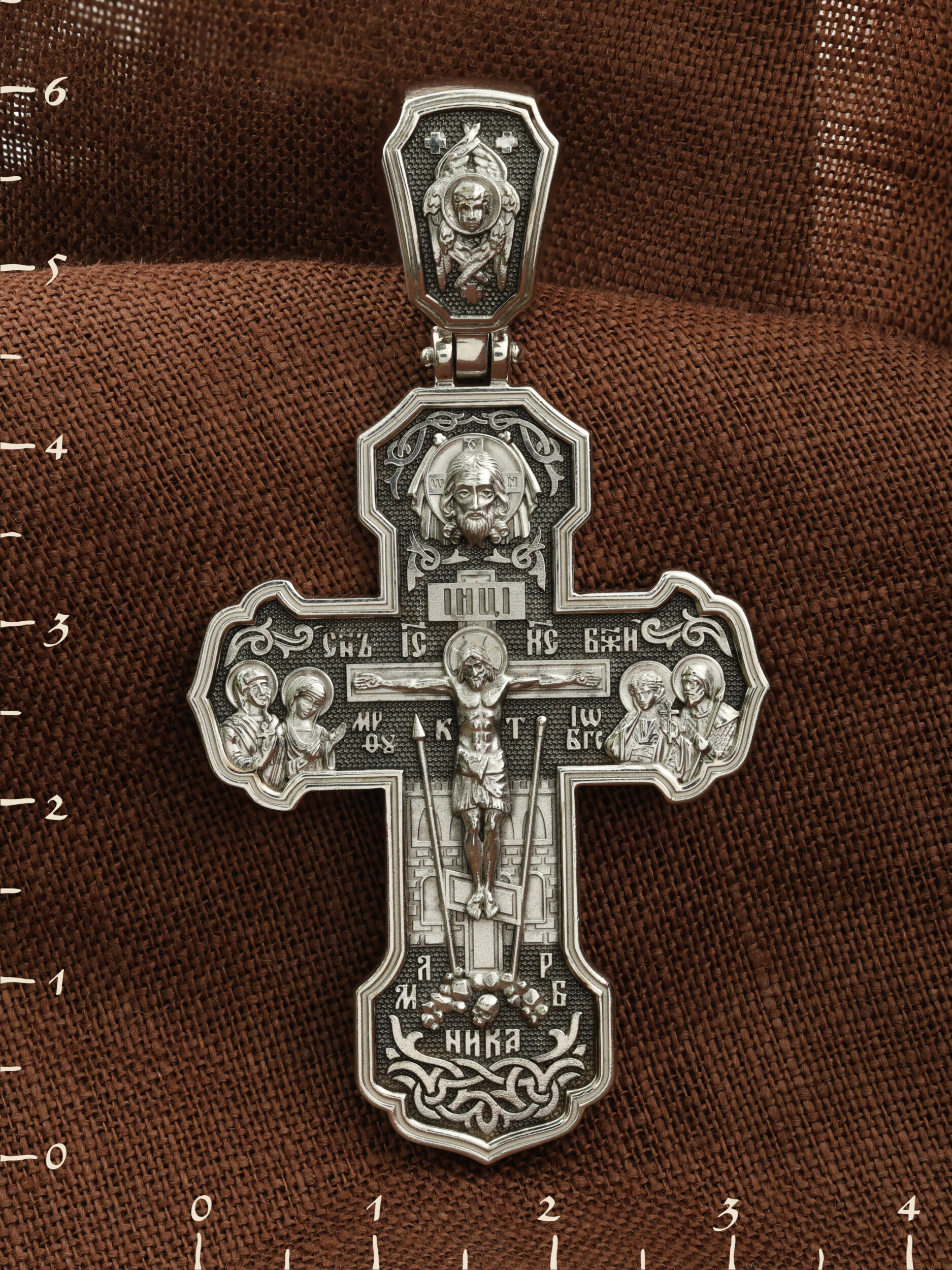 На лицевой стороне креста изображено Распятие Господа и Спасителя нашего Иисуса Христа. Крест- символ спасения и искупления рода человеческого, знамение победы над смертью и адом. Иисус Христос, как искупительная жертва освобождения человечества от власти греха, умер крестной смертью и в третий день воскрес. На верхней табличке, выше головы Иисуса, расположена надпись, составленная Понтием Пилатом — «IНЦI». Она означает «Иисус Назорей, Царь Иудейский». Надпись «IС» « ХС» означает Иисус Христос и помещается на разных сторонах поперечной (большой) перекладины креста. Рядом расположена надпись «Сын Божий». Выше Распятия изображен Нерукотворный образ Господа и Спасителя нашего Иисуса Христа. Слева от Распятия — Пресвятая Богородица и святая мироносица Мария Магдалина с крестом в руке. Справа — апостол и евангелист Иоанн Богослов, один из ближайших учеников Иисуса Христа и сотник Лонгин с крестом в правой руке и копьем — в левой. За крестом высится Иерусалимская стена. Крест стоит на горе камней, символизирующих Голгофу. В ее основании различается череп — это голова Адама. Вдоль креста изображены копие сотника Лонгина и трость с губкой и буквы «К» и «Т». Надпись «МЛРБ» — «место лобное рай бысть» означает, что место лобное стало раем и помещаются в нижней части креста. Рядом — слово «НИКА», что означает «победитель». На православном кресте Христос не умирает, а свободно простирает руки, ладони Иисуса открыты, будто он хочет обнять все человечество, даря им свою любовь и открывая путь к вечной жизни. На кулонном кольце изображен шестикрылый Серафим.